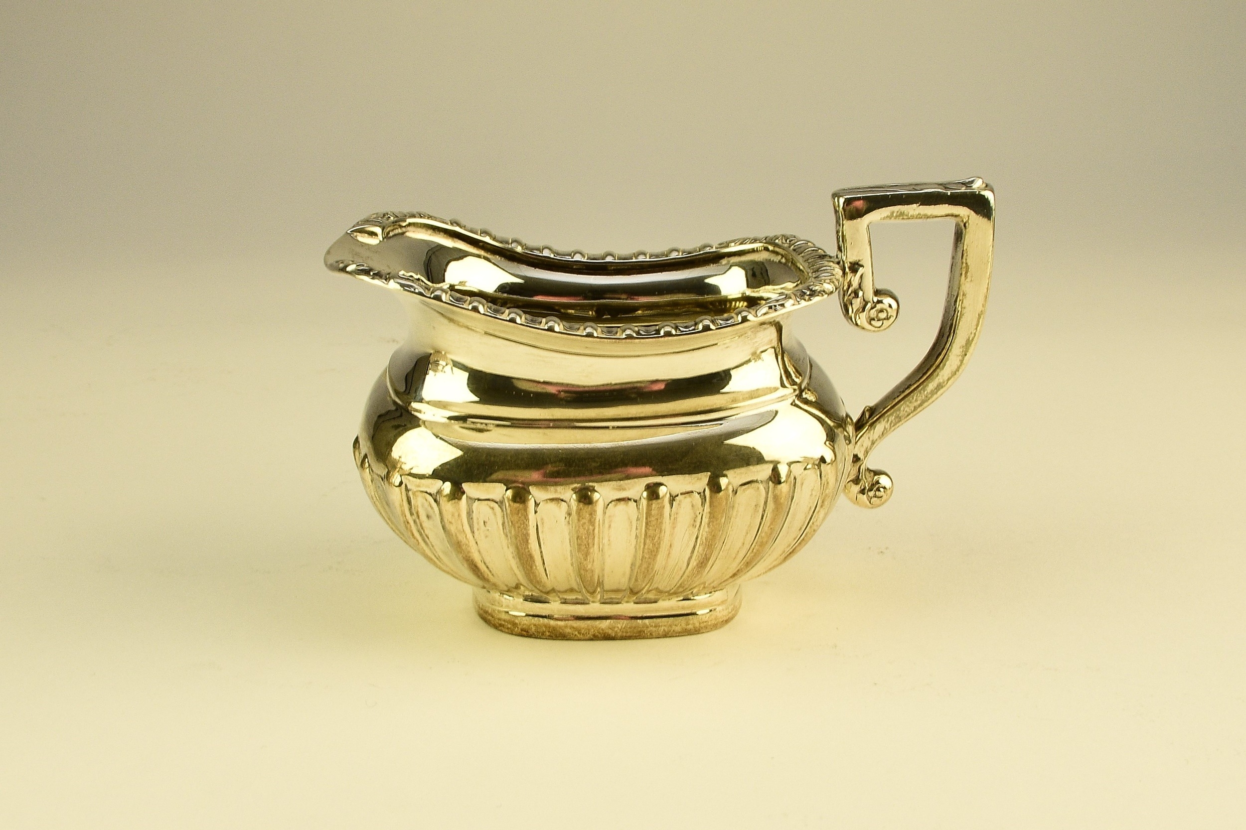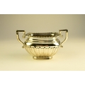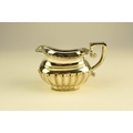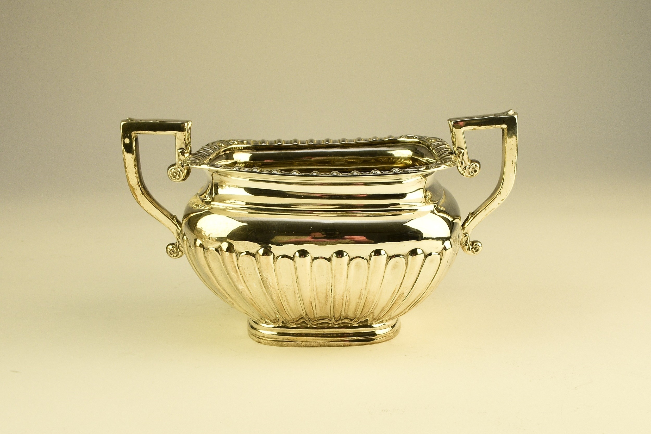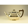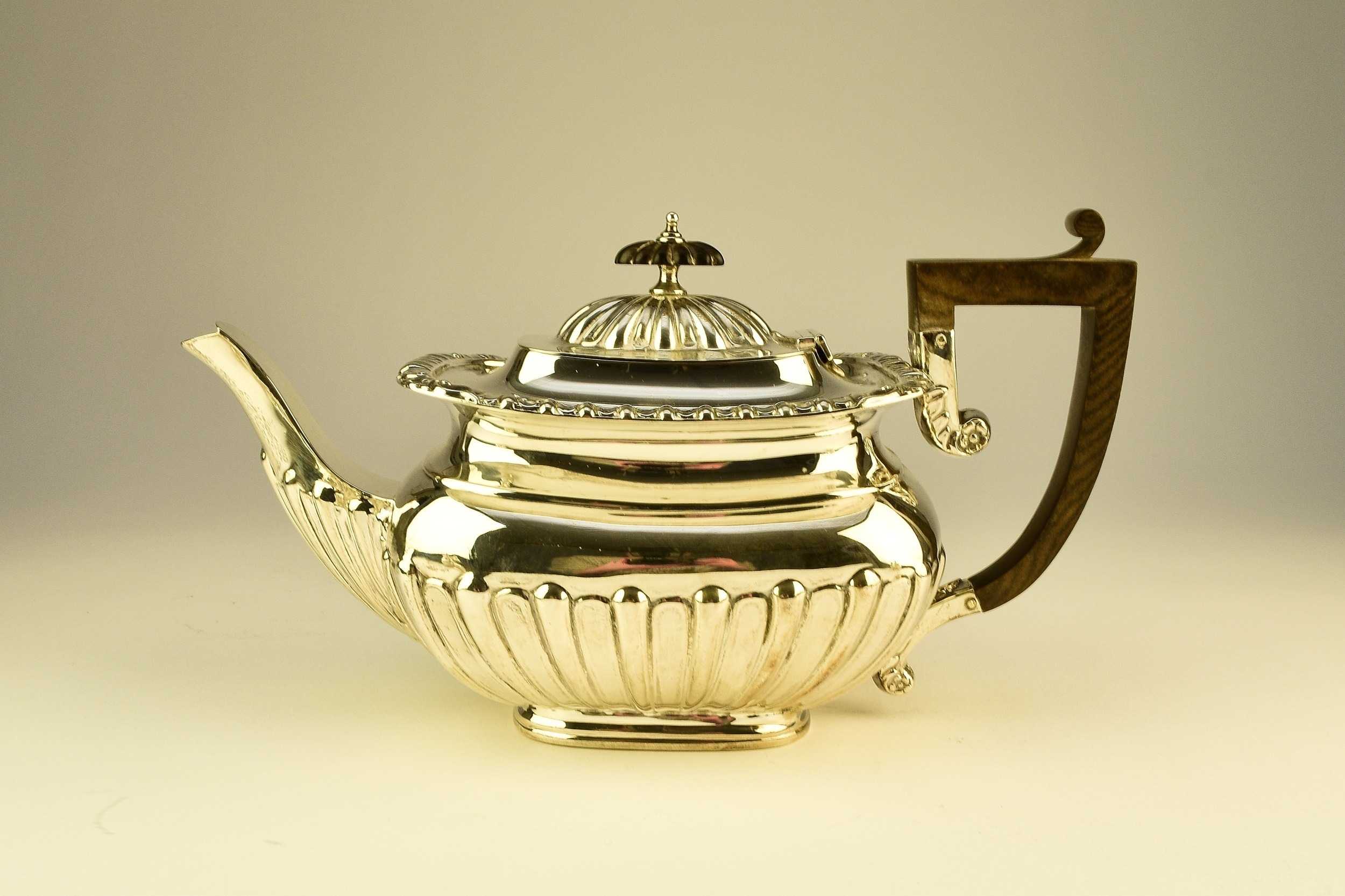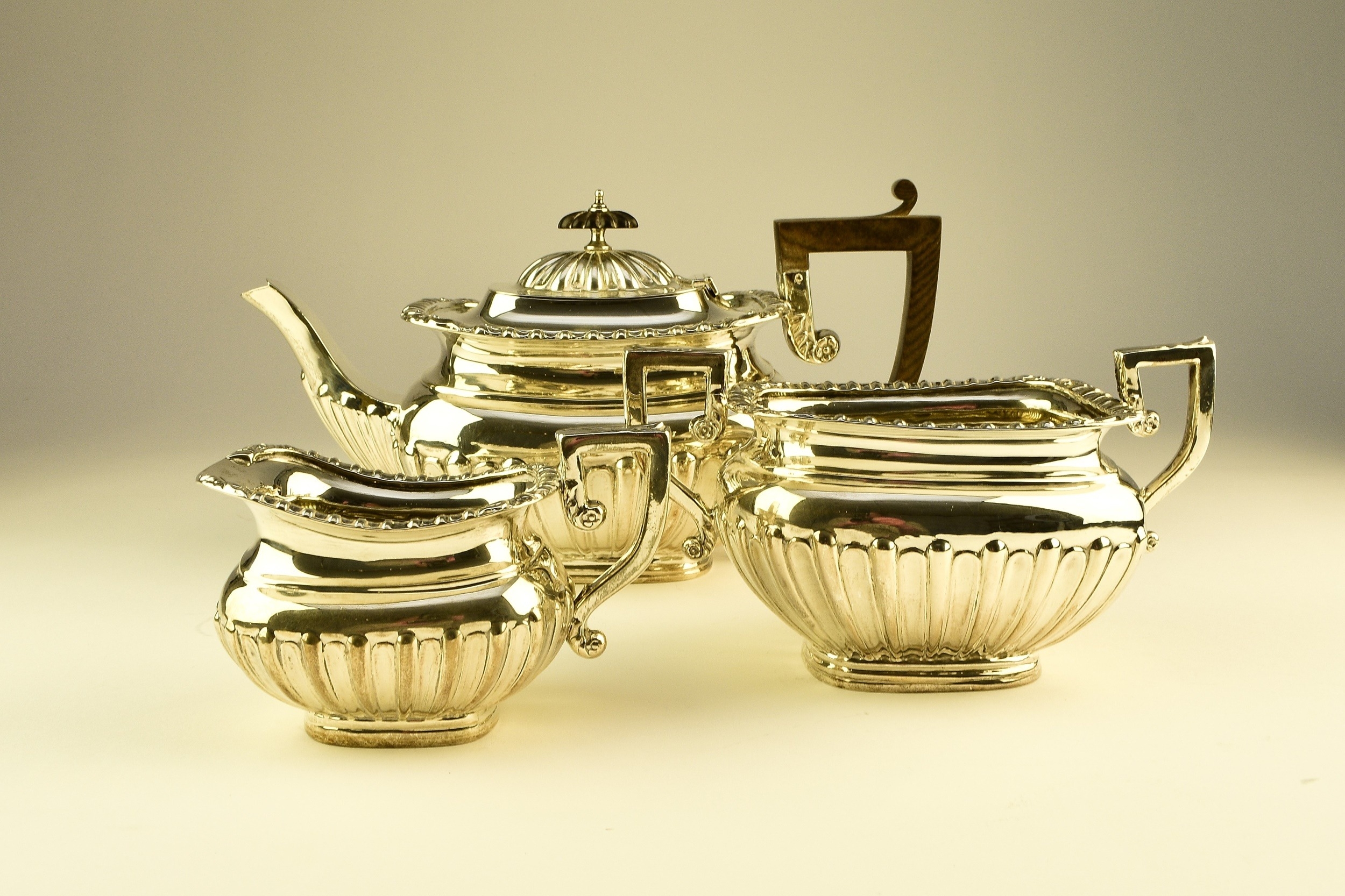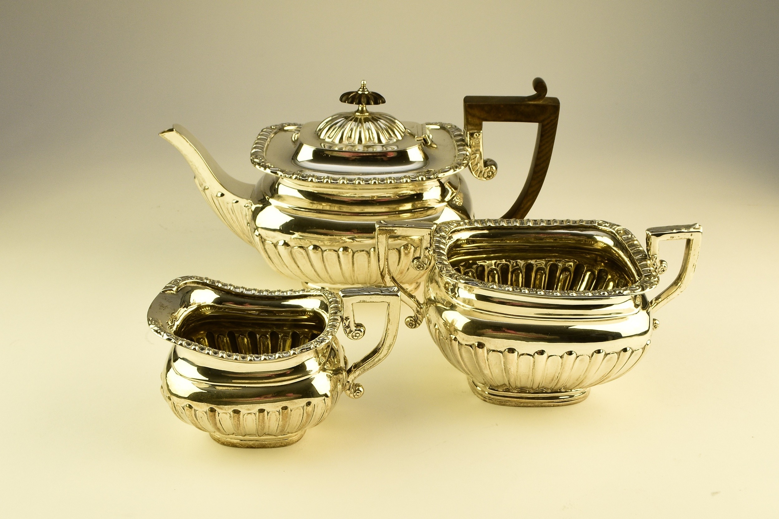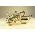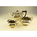 An Edwardian three piece silver tea service, William Aitken, Birmingham 1907, each of rounded rectangular half reeded form, comprising; a teapot with turned wood handle and finial, 15.5cm high, a two handled sugar bowl, 10cm high and a cream jug, 8.5cm high, total weight approx 34.6oz (3)