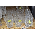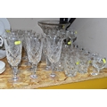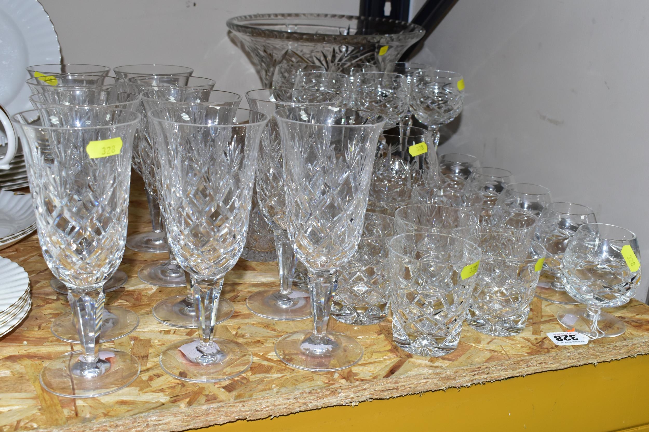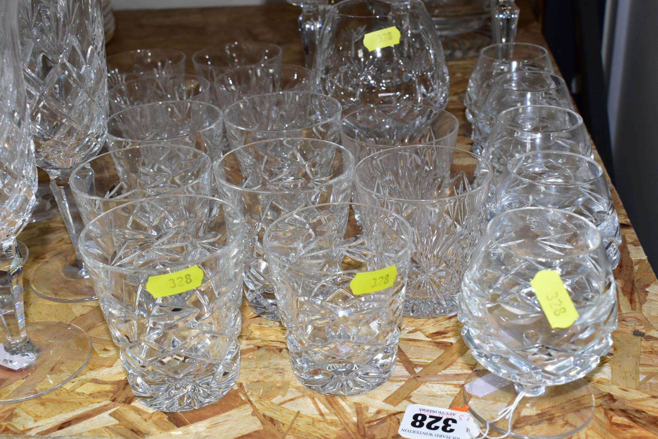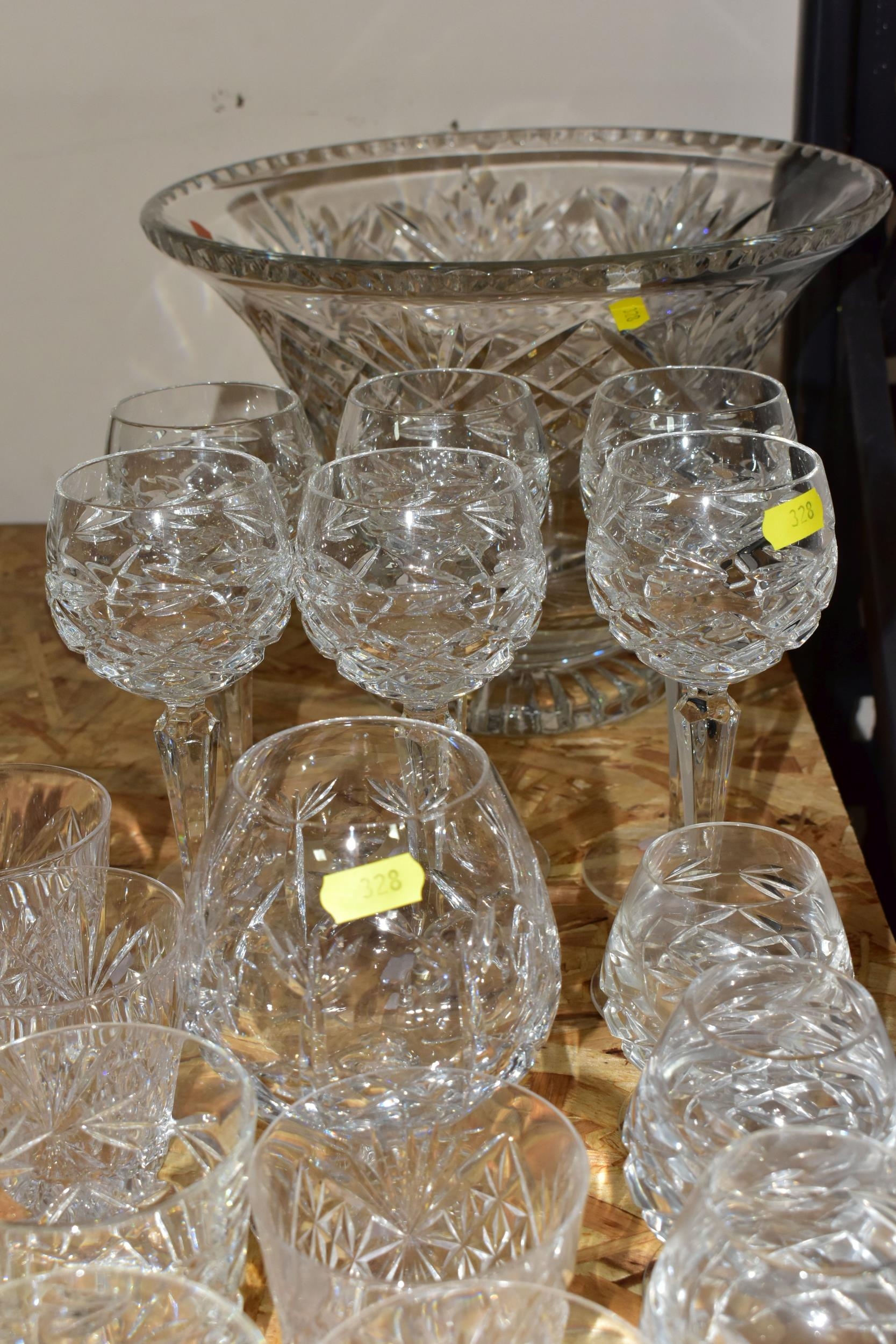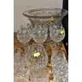 A GROUP OF CUT CRYSTAL, comprising a very heavy and large cut crystal centre piece bowl, height 24cm x diameter 32cm, a set of ten large wine glasses (six are chipped along the rim), four snifters, one large brandy glass, a set of five whisky tumblers (three chipped), a set of six whisky tumblers, a set of six long stemmed hock glasses (35) (Condition Report: ten glasses have obvious chips)