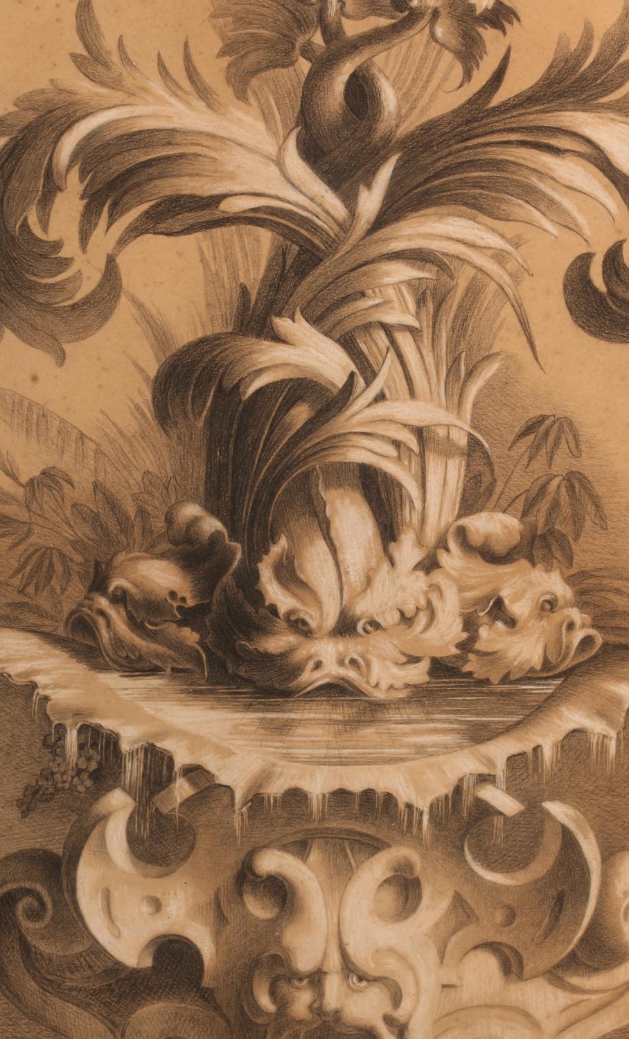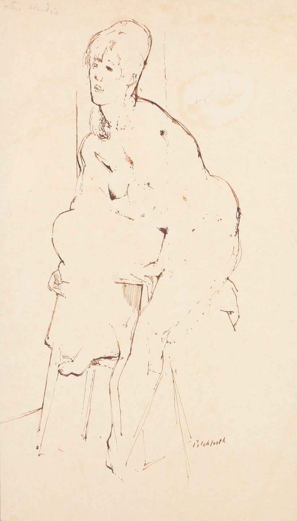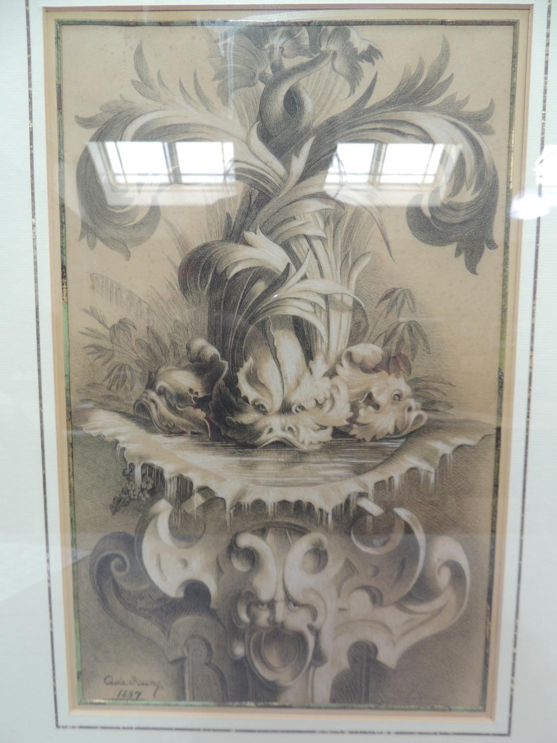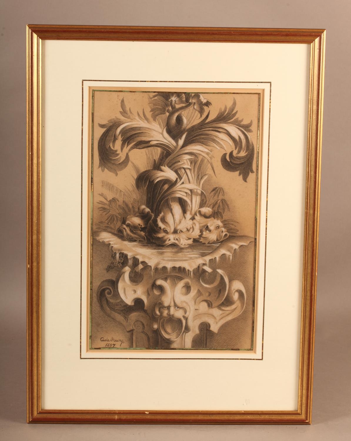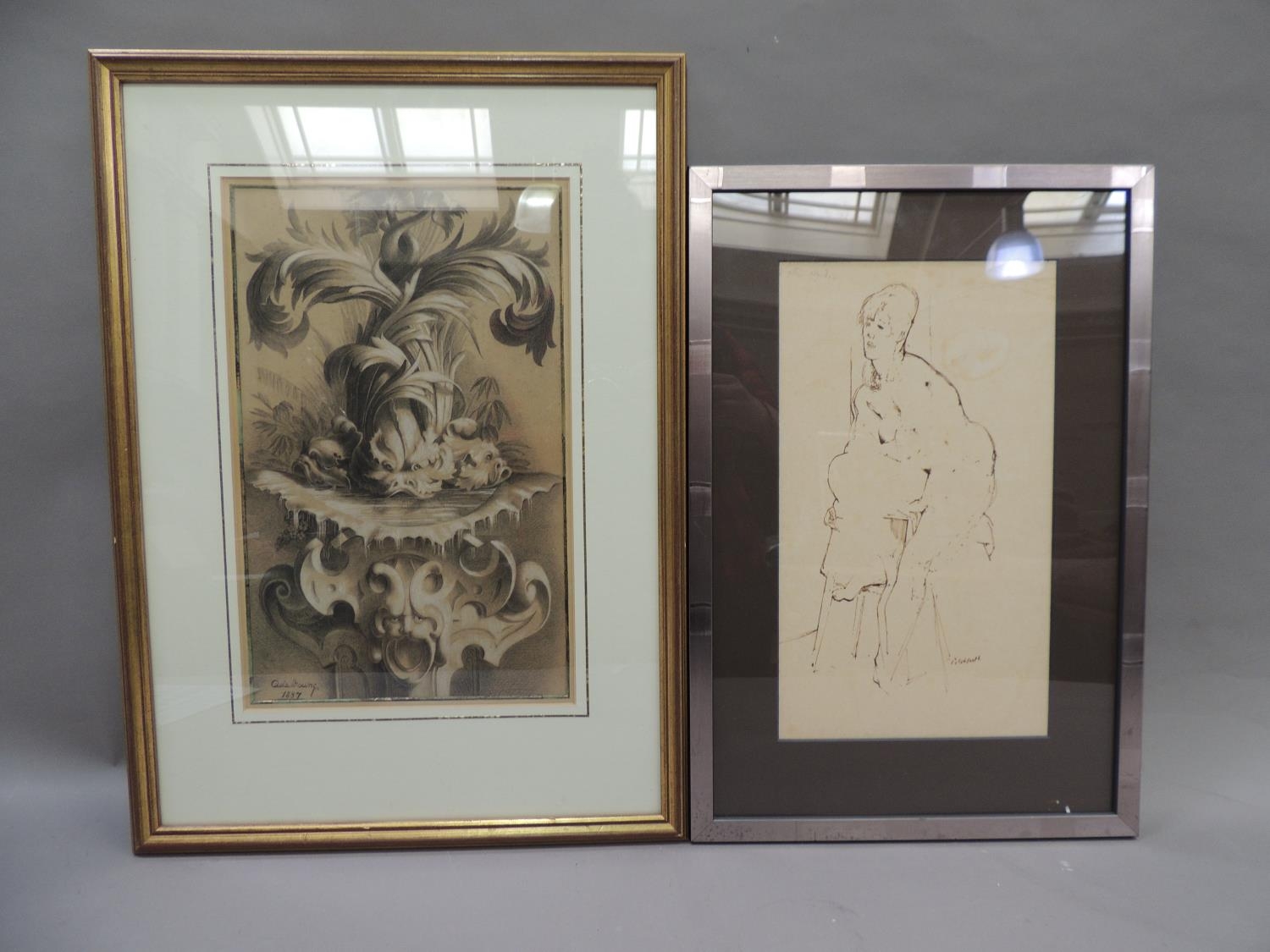 ADA YOUNG (19th century), Dolphins and acanthus leaf fountain, pastel, signed and dated 1887 lower left, gallery label verso, 39cm x 25cm, framed; PICKFORTH (Mid 20th century), Female nude sitting on a stool, pen and ink on buff paper, signed to lower right, 35cm x 20cm (2)