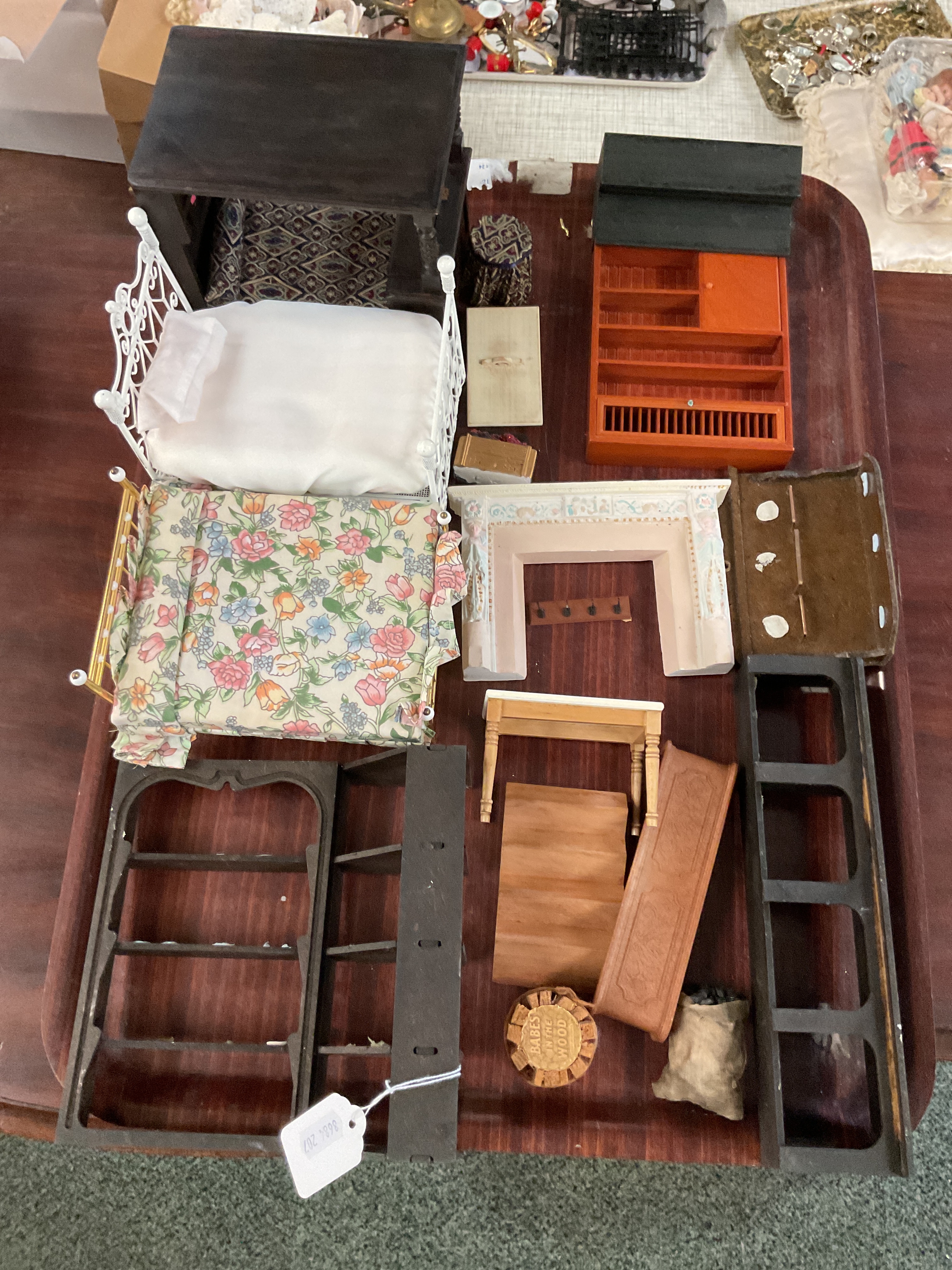 A mixed selection of dolls house furniture to include beds, dresser, fire place etc