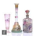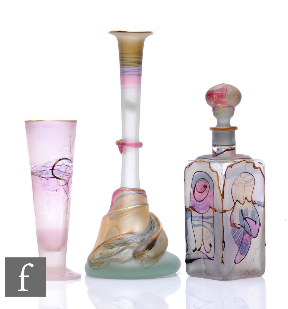 Ion Tamaian - Ion Art - A 1970s-1980s Romanian art glass vase of tapering form with tall collar neck, with applied organic decoration and neck ring, decorated with pink and purple bands to the frosted ground and highlighted in gilt, engraved signature, height 30cm, together with a square bottle and a footed sleeve form vase, both similarly decorated. (3)