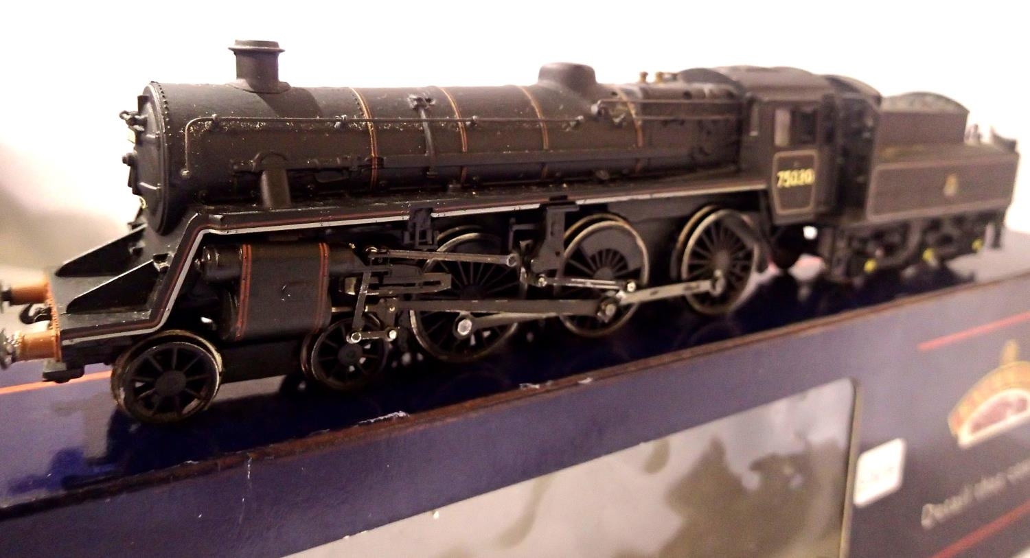 Bachmann Class 4, refinished, Black, Early Crest, 75030, in very good condition, weathered, part box. P&P Group 1 (£14+VAT for the first lot and £1+VAT for subsequent lots)