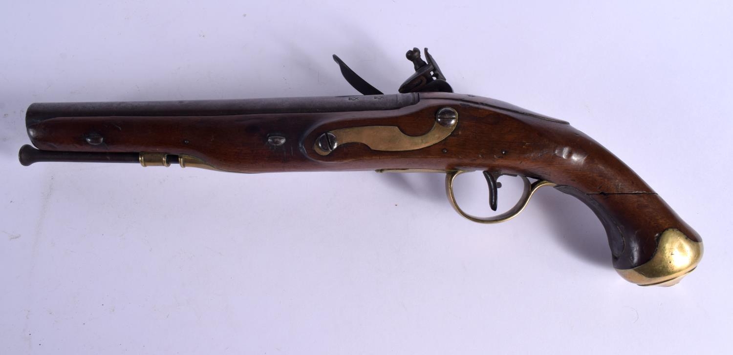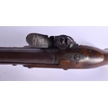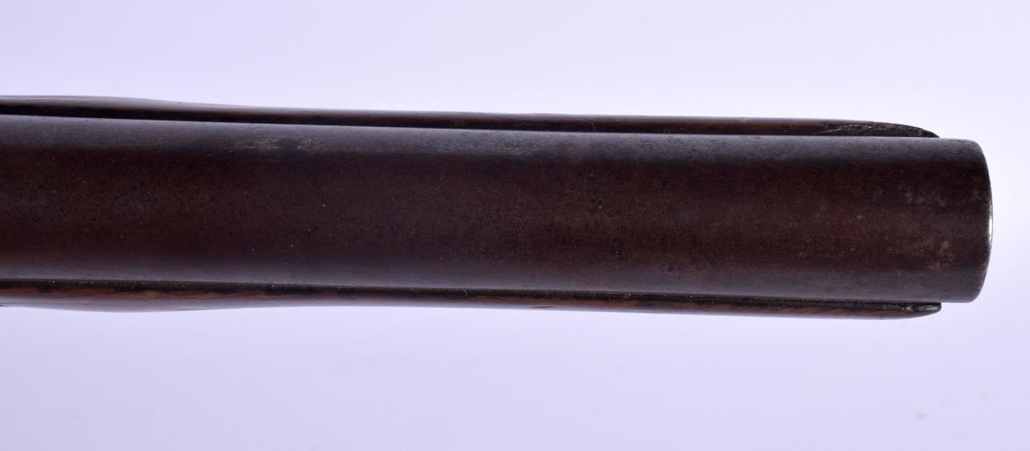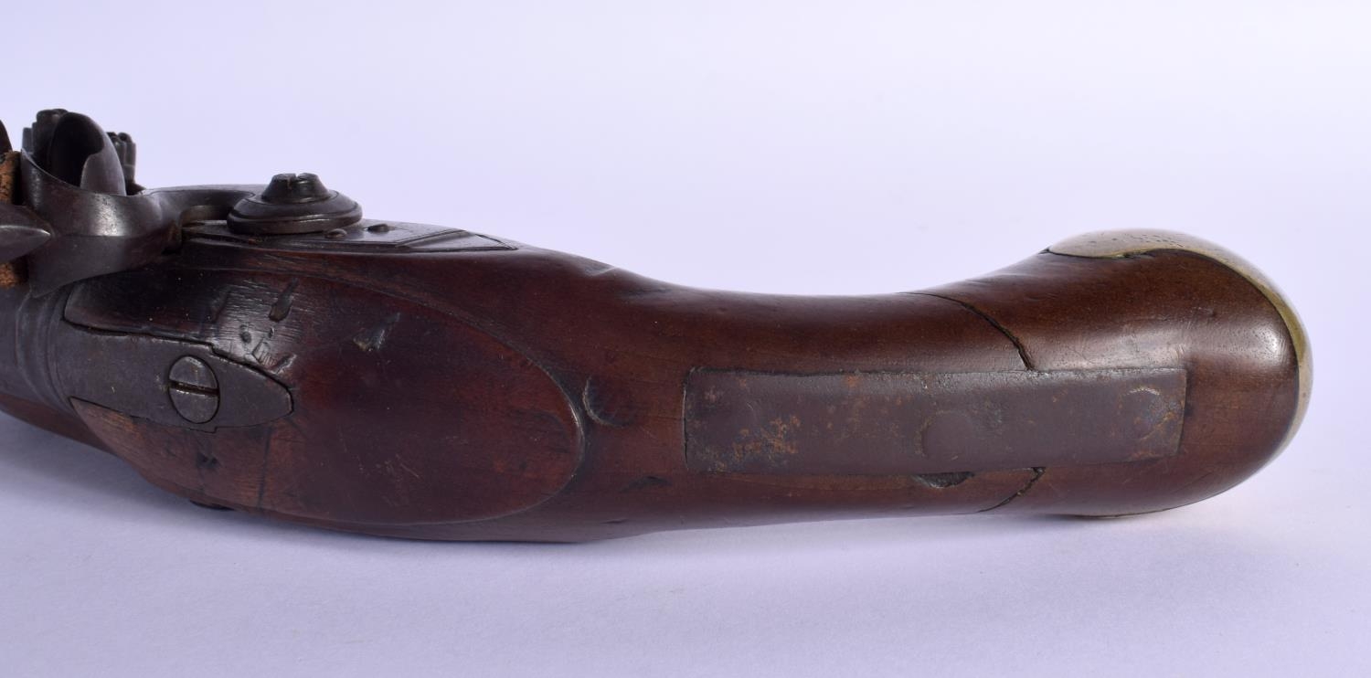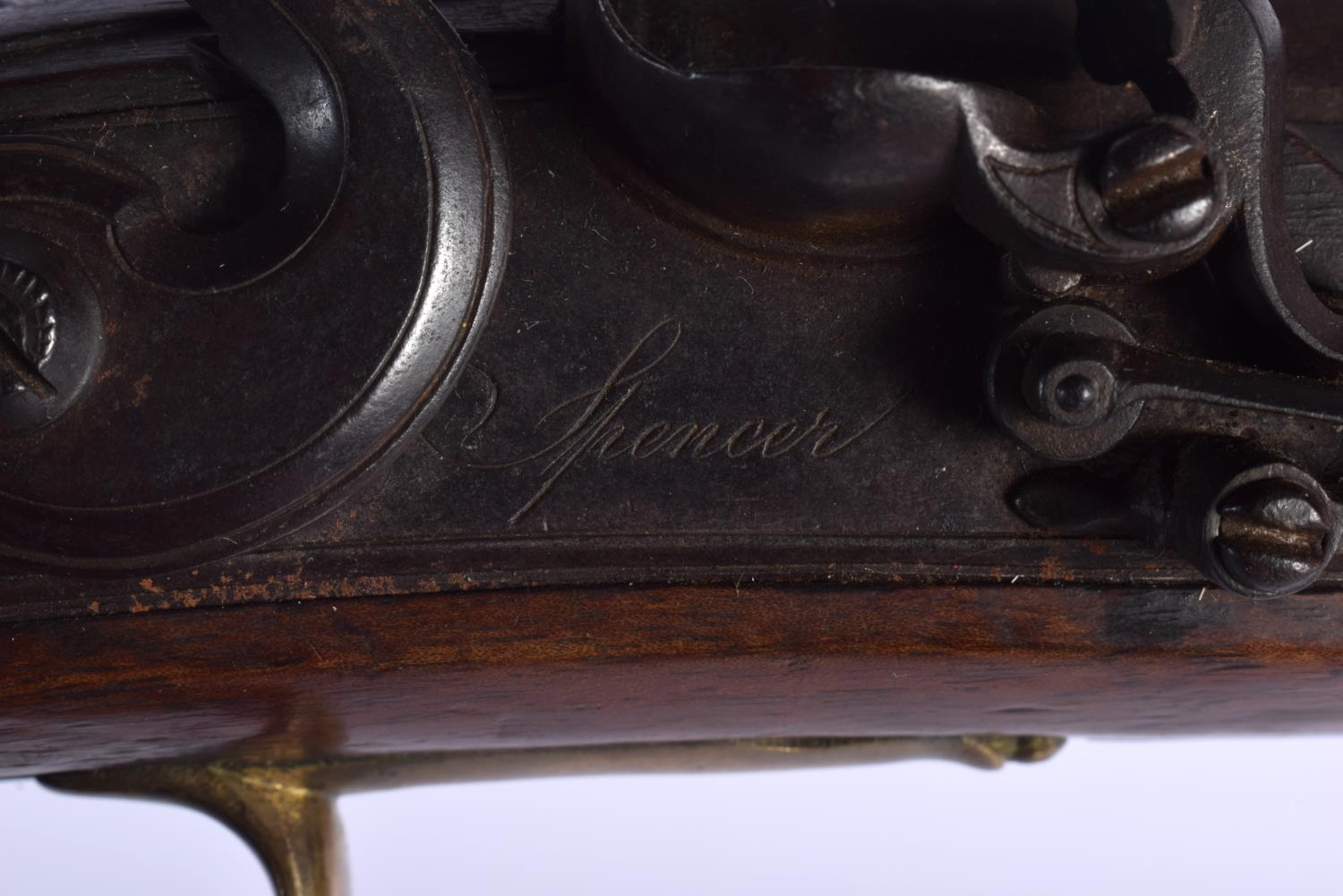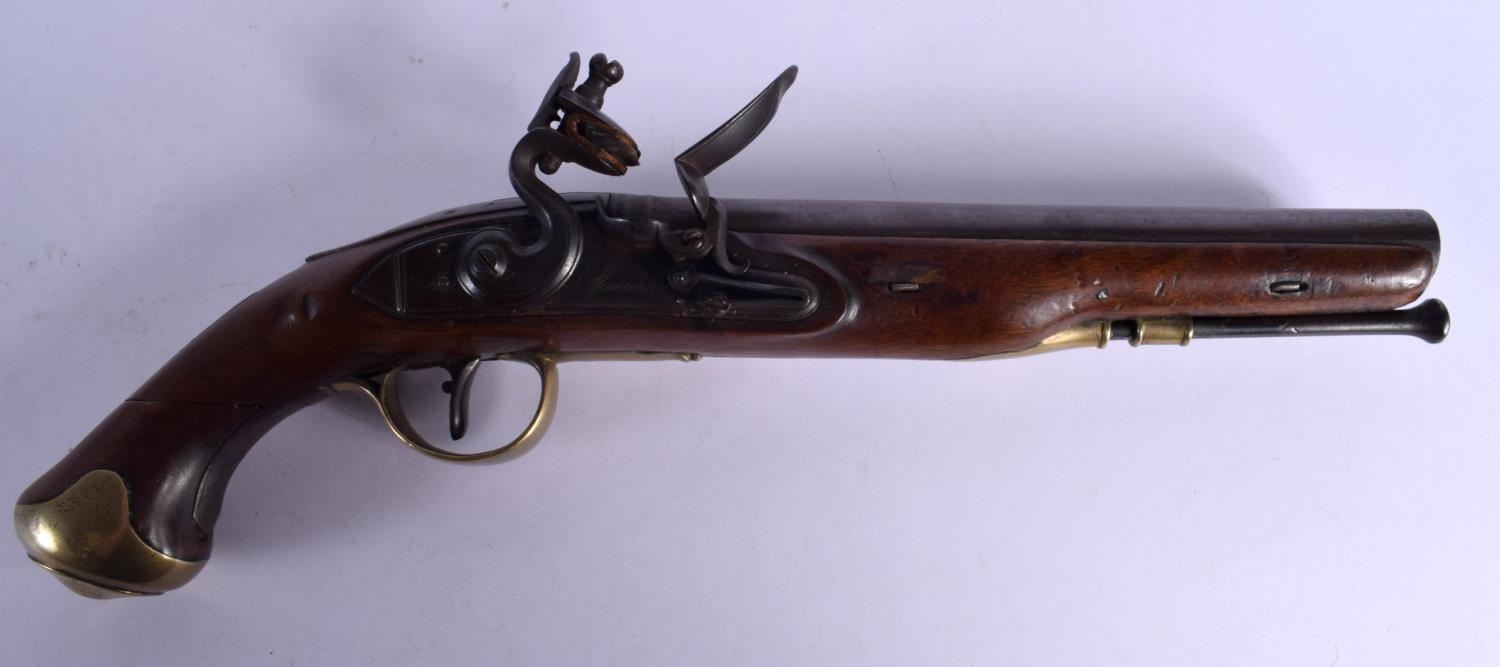 AN ANTIQUE FLINT LOCK PISTOL by Spencer. 38 cm wide.