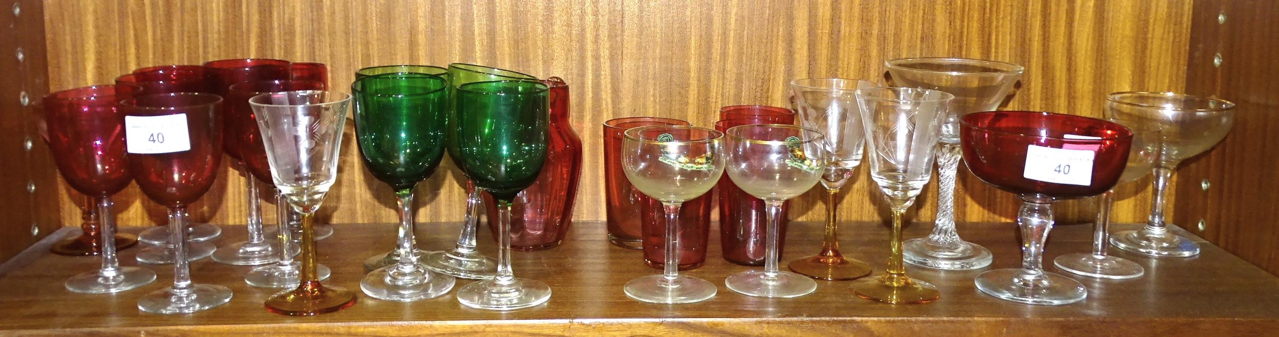 Seven cranberry port glasses, four green port glasses and other glassware.
