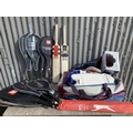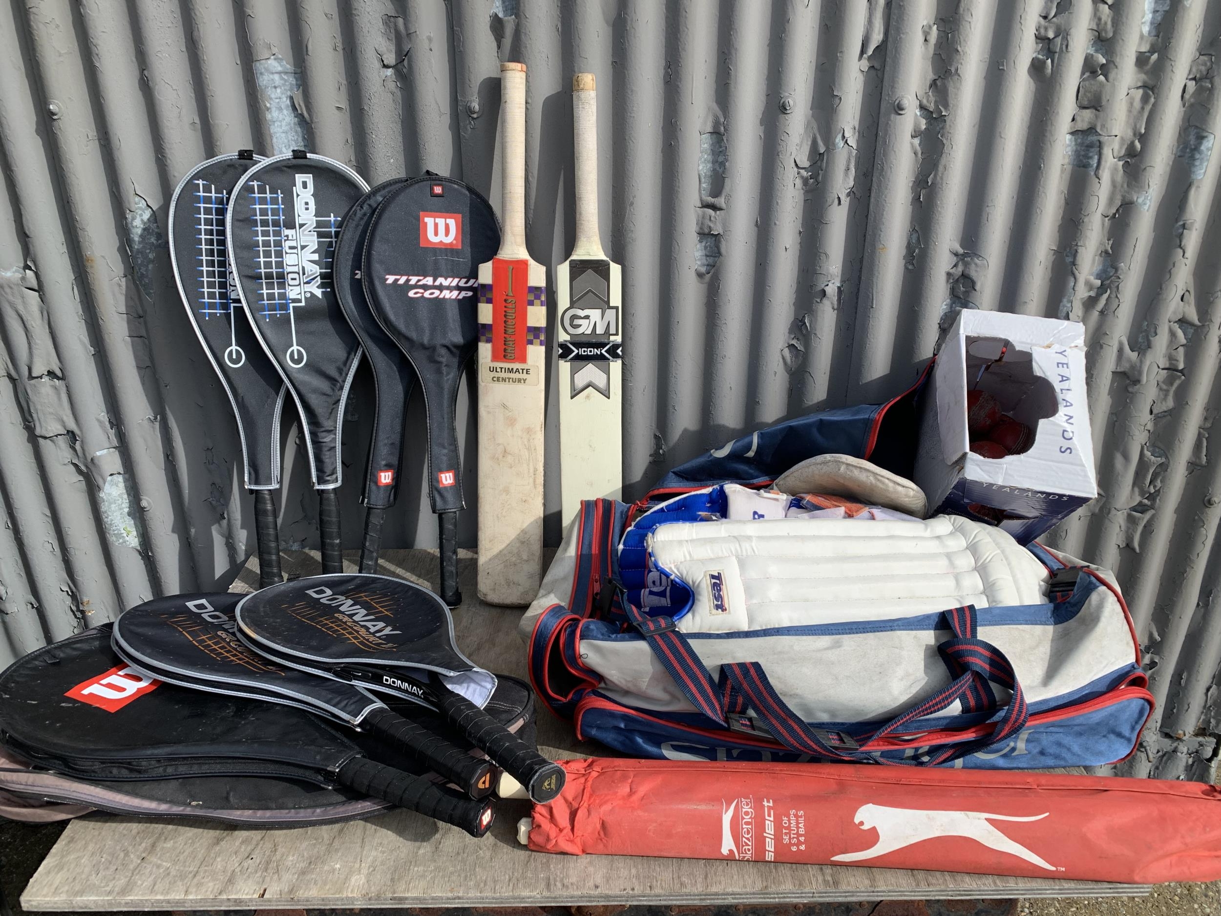 Cricketing Items including pads, bats, box of balls and stumps plus badminton & tennis rackets (4)