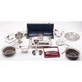 A mixed group of silver plate including; a Sheffield plate cigarette casket, a pair of Sheffield plate wine coasters, a pair of swan menu holders by W & Co Ltd, a cased pair of nut crackers, a cased carving set, a pair of sauce boats, a swing handle sugar bowl- glass liner missing, a small chalice trophy, a pair of cake tongs, a 19th century Sheffield plate salver, sauce boat, a toast rail and stand and an entree dish, cover and handle, (16)