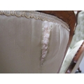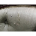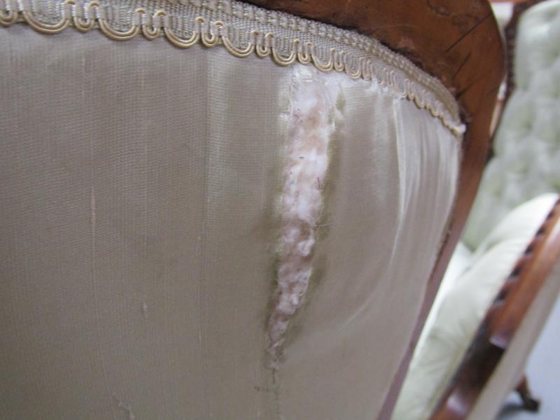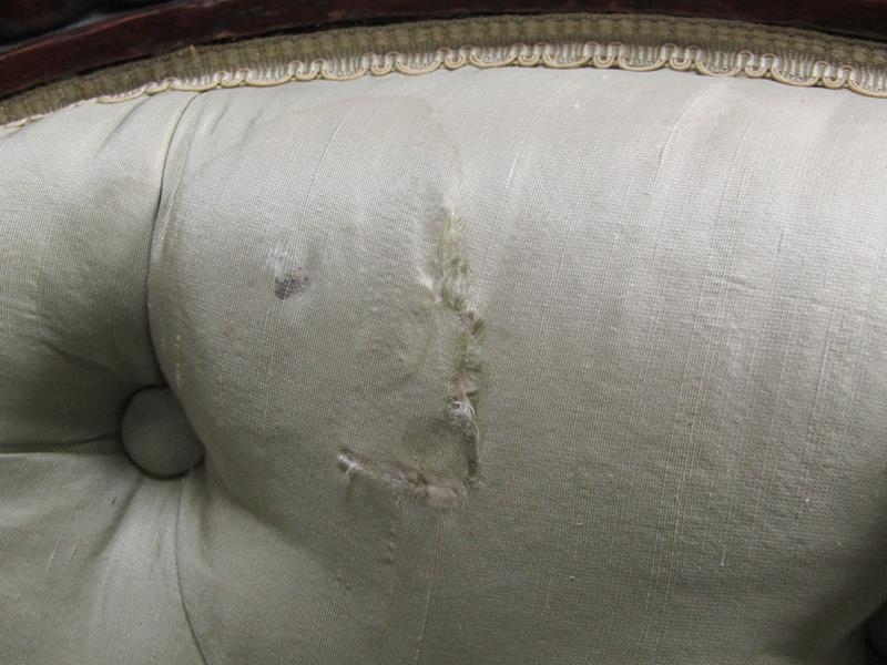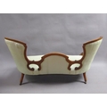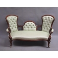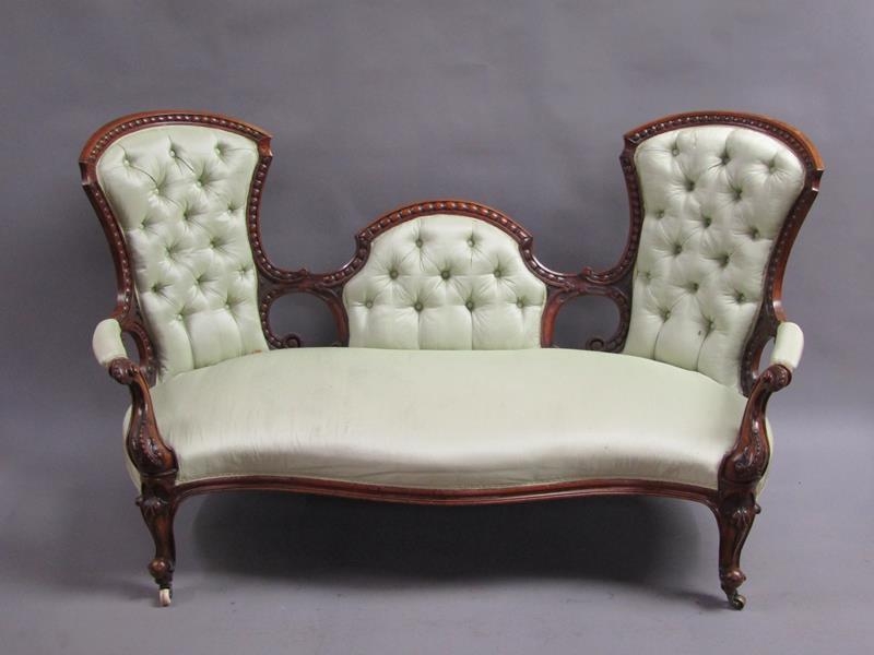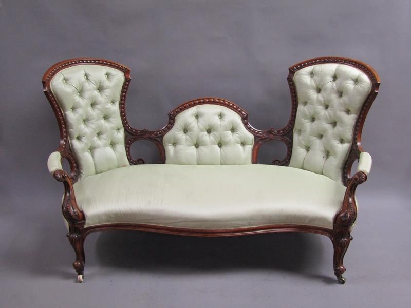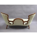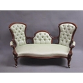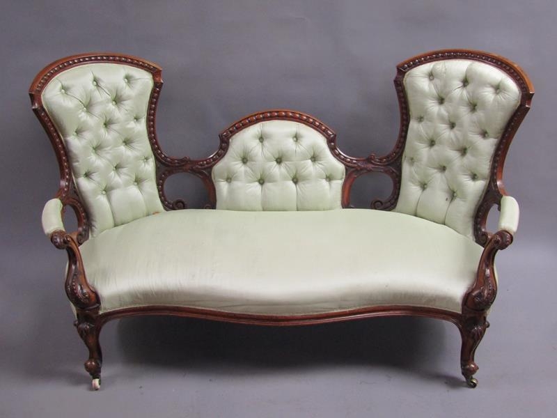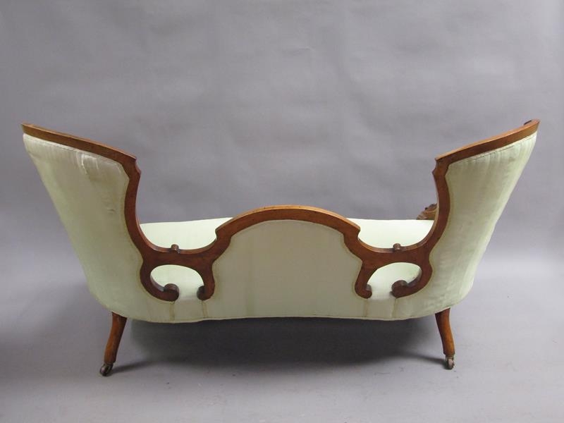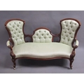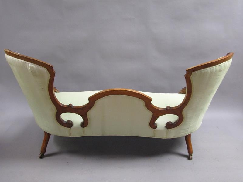 A Victorian walnut show framed and upholstered double end sofa of serpentine form, the framed carved throughout, supported on slight cabriole legs to the front and rear sabre legs with castors, 181cm w, 117cm h.