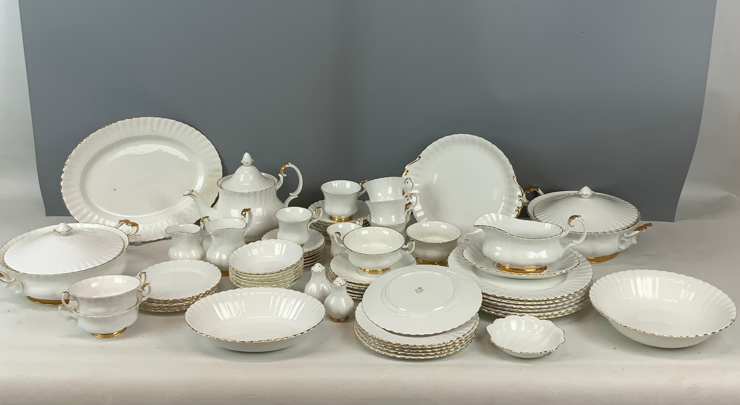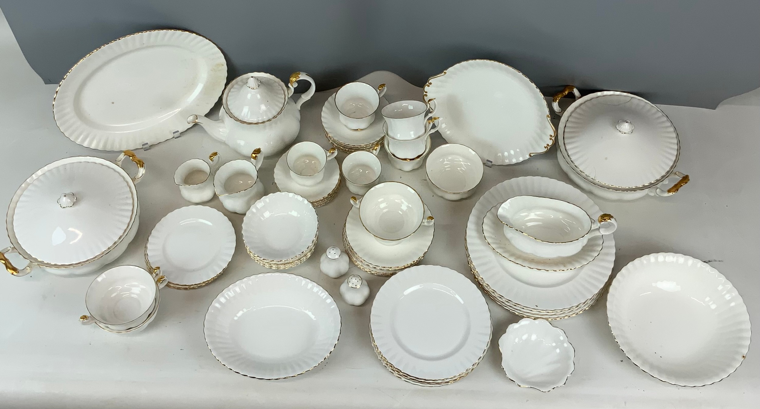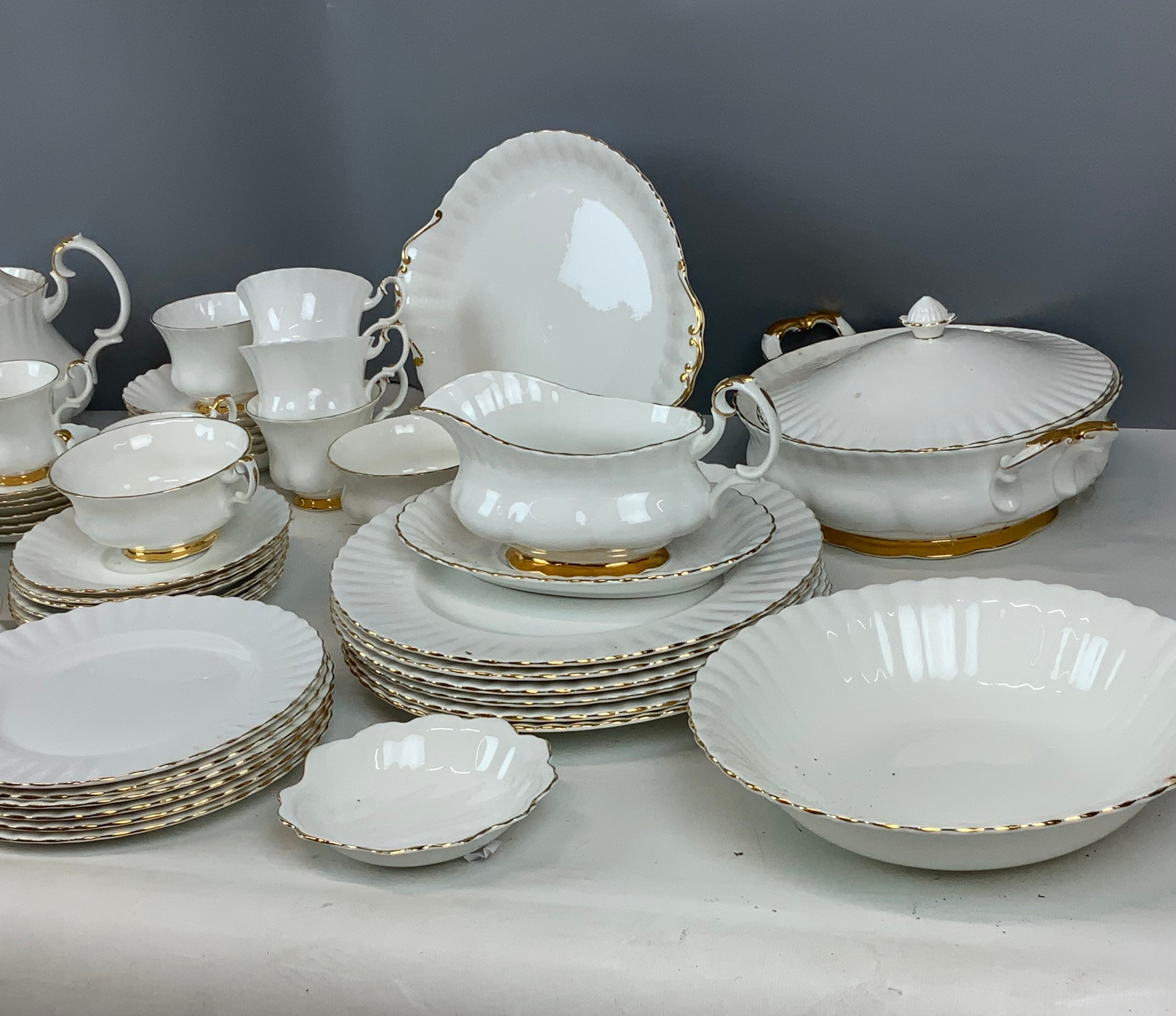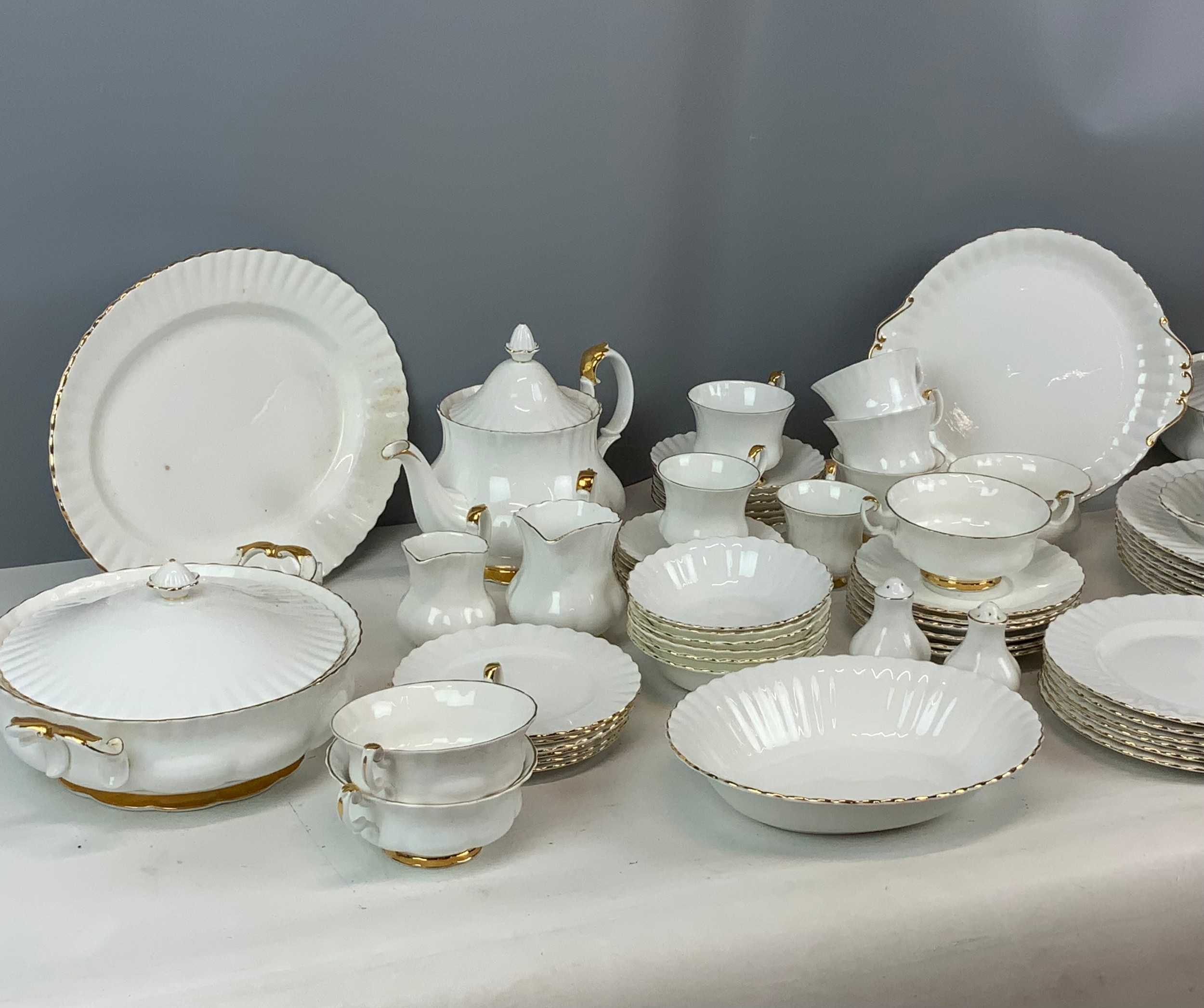 Large collection of Royal Albert Val d'Or dinnerware. Six settings (4 tea cups/2 coffee cups). Approx 65 items.