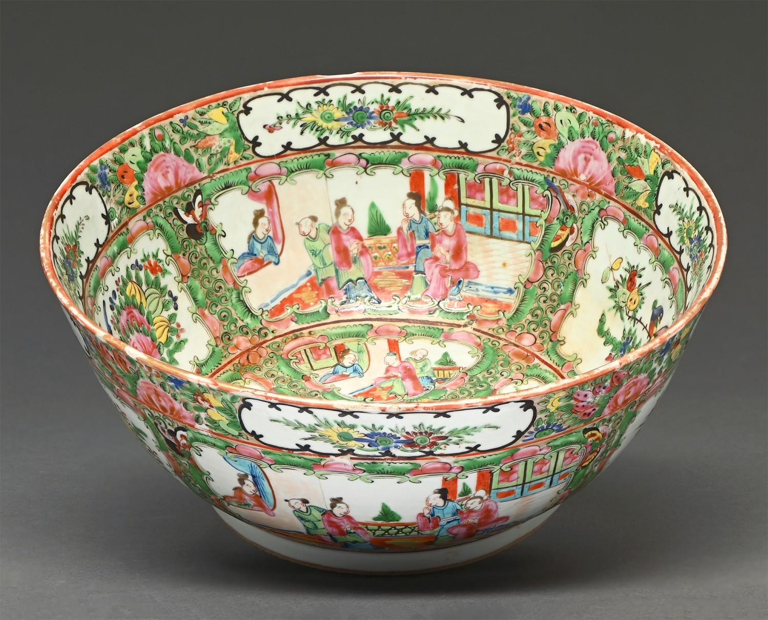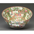 A Chinese Canton famille rose bowl, second half 19th c, enamelled with alternating panels of figures and birds perched among flowers reserved on a scrolling foliate ground, 26.5cm diam
