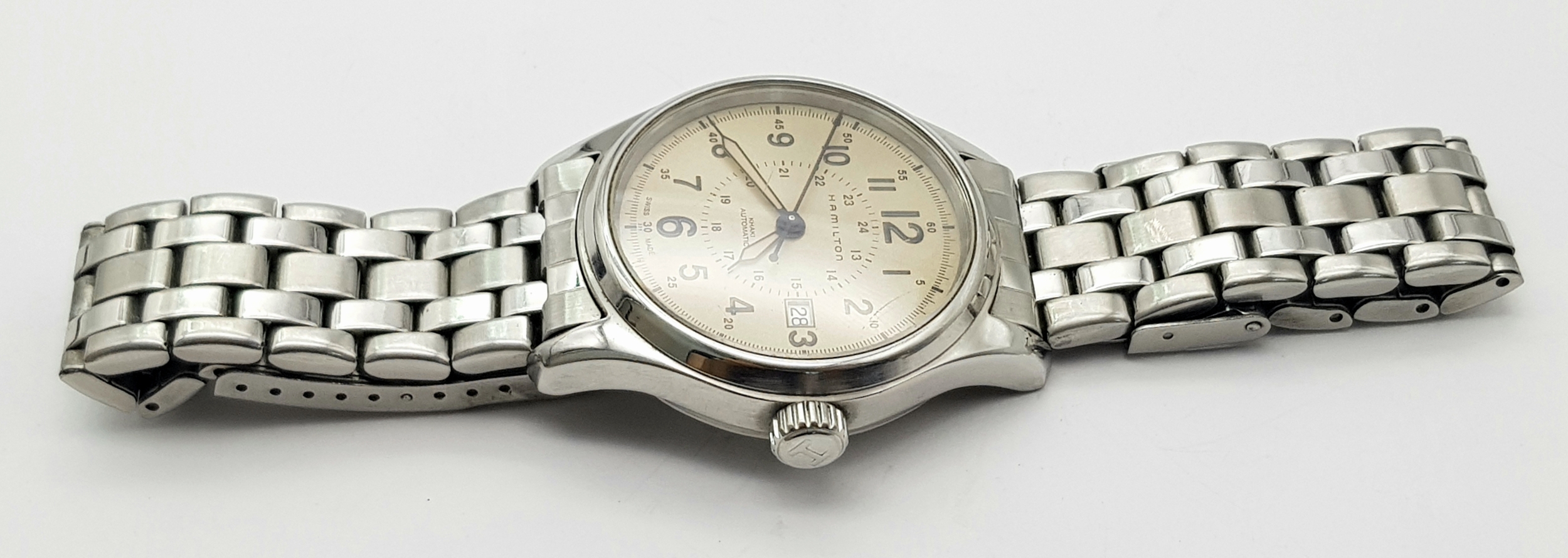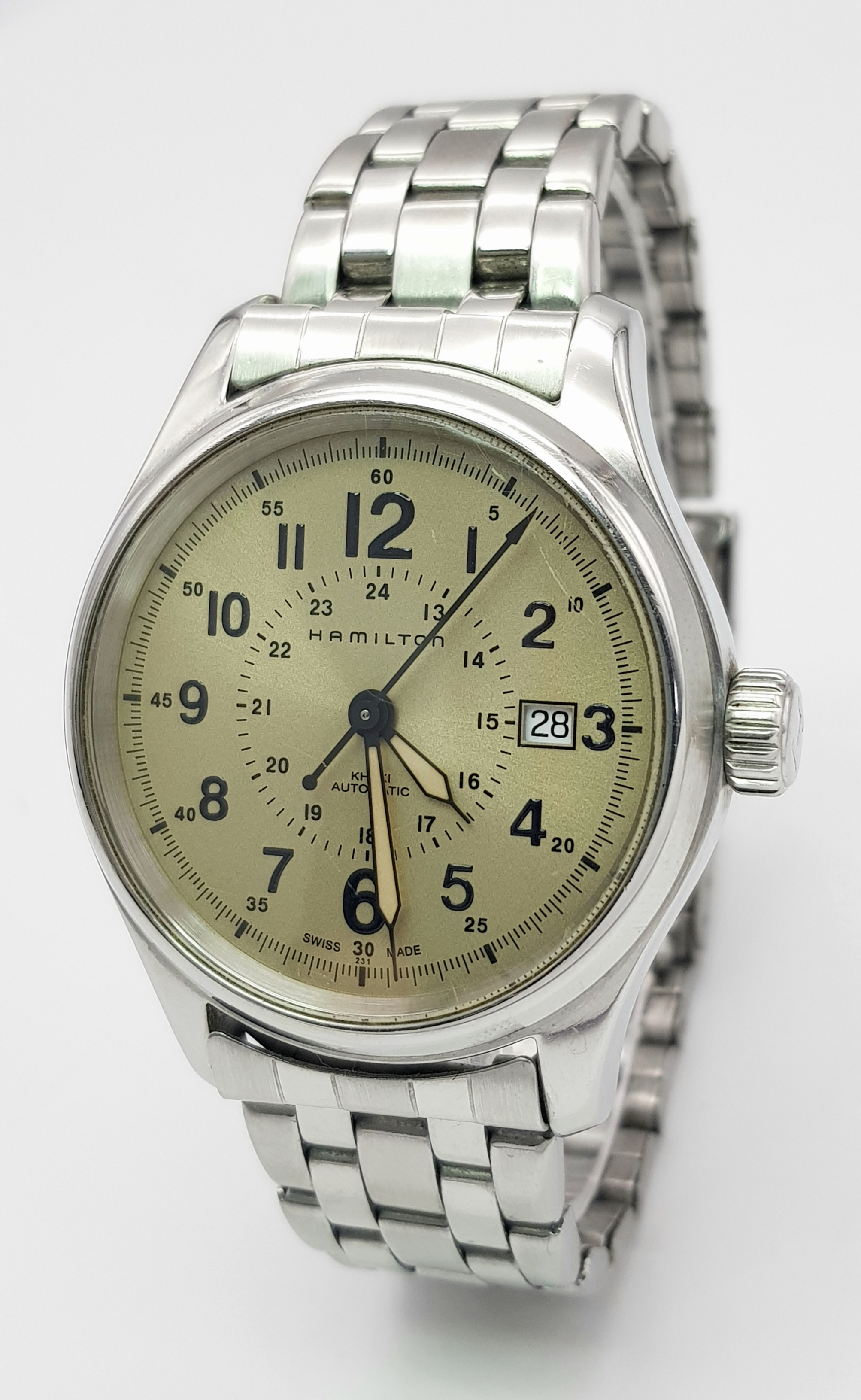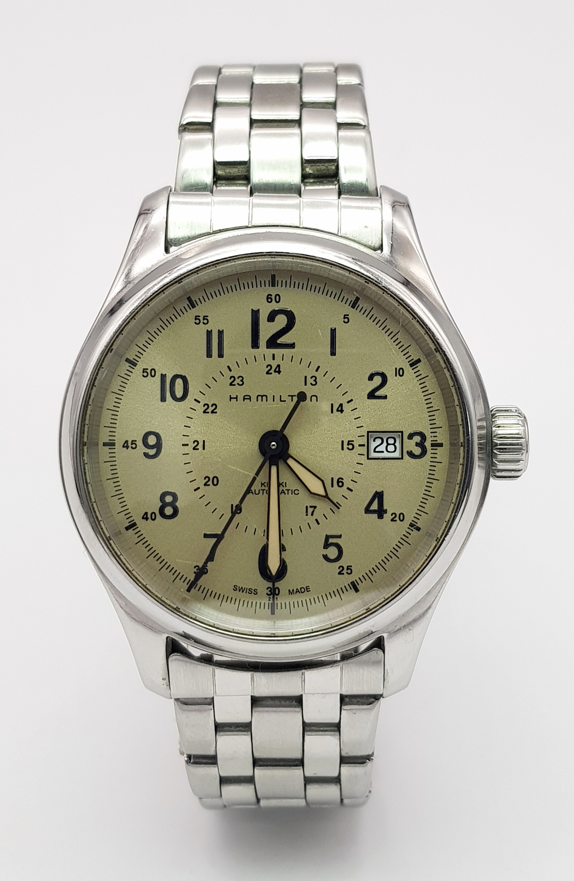 A Hamilton Automatic Khaki Gents Watch. Stainless steel bracelet and case - 41m. Khaki dial with date window. Skeleton back. In good condition and working order.