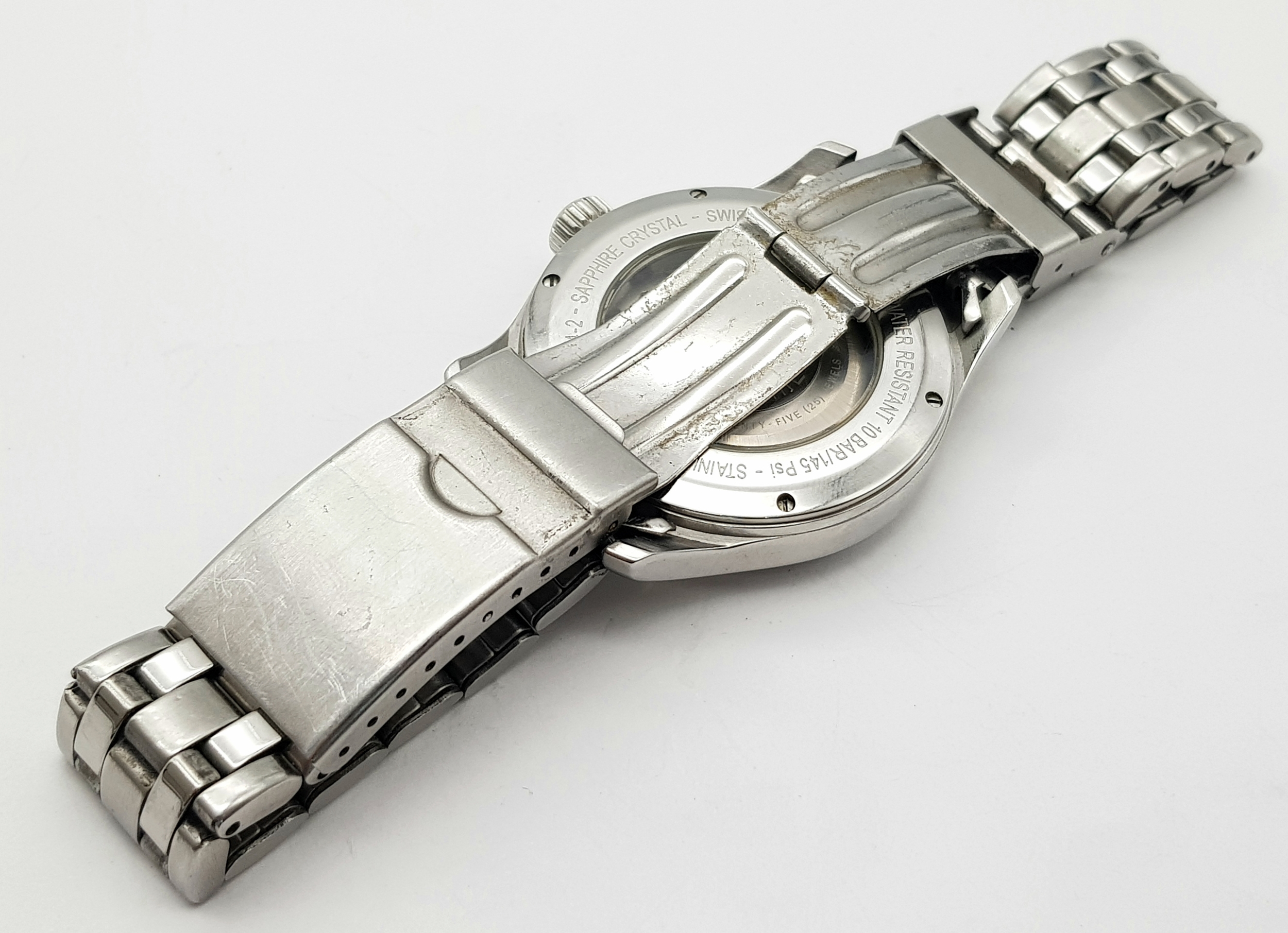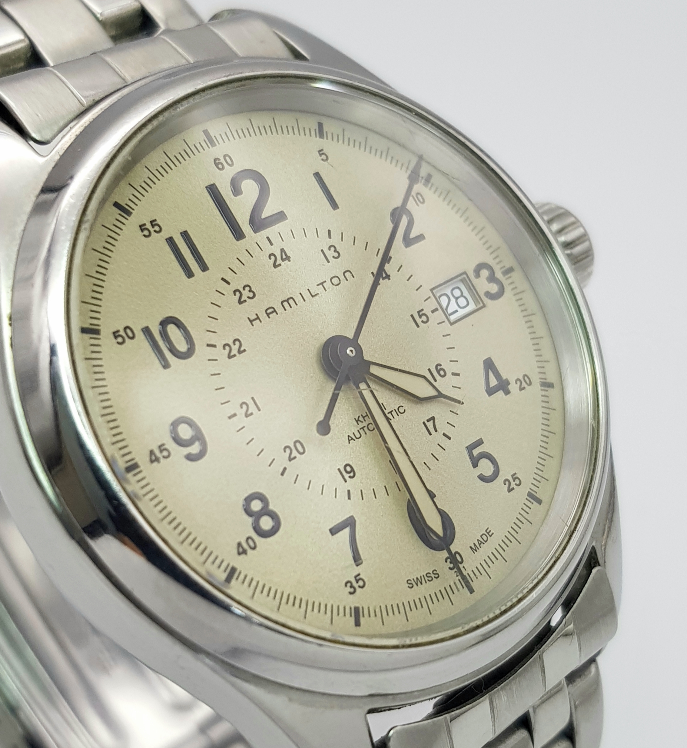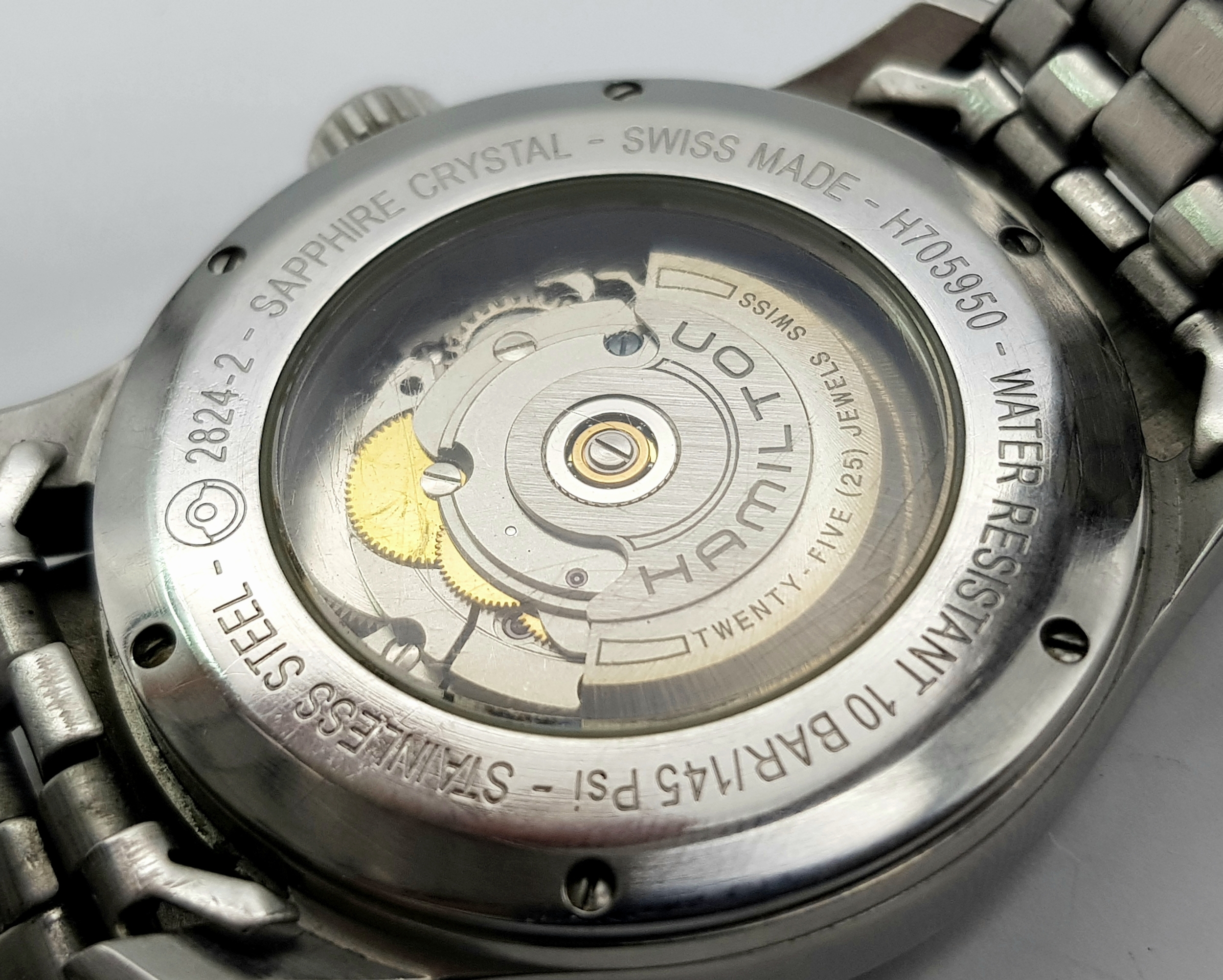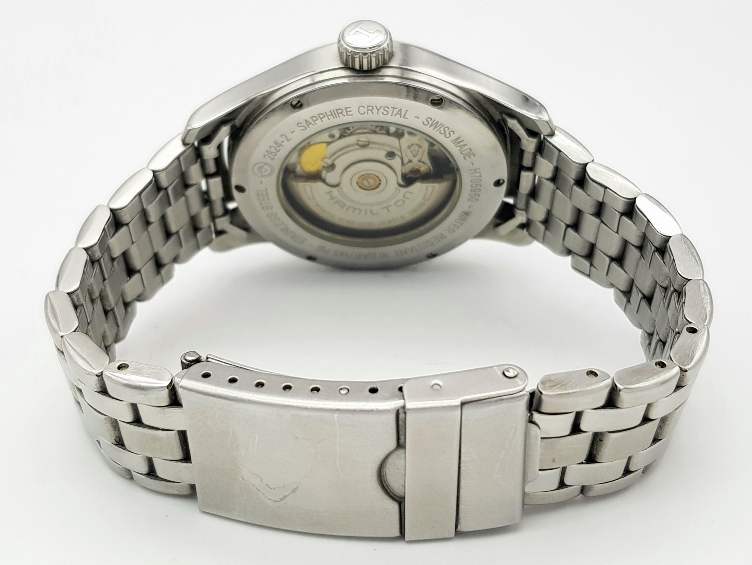 A Hamilton Automatic Khaki Gents Watch. Stainless steel bracelet and case - 41m. Khaki dial with date window. Skeleton back. In good condition and working order.