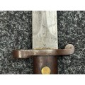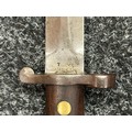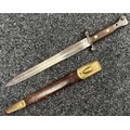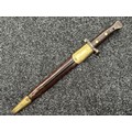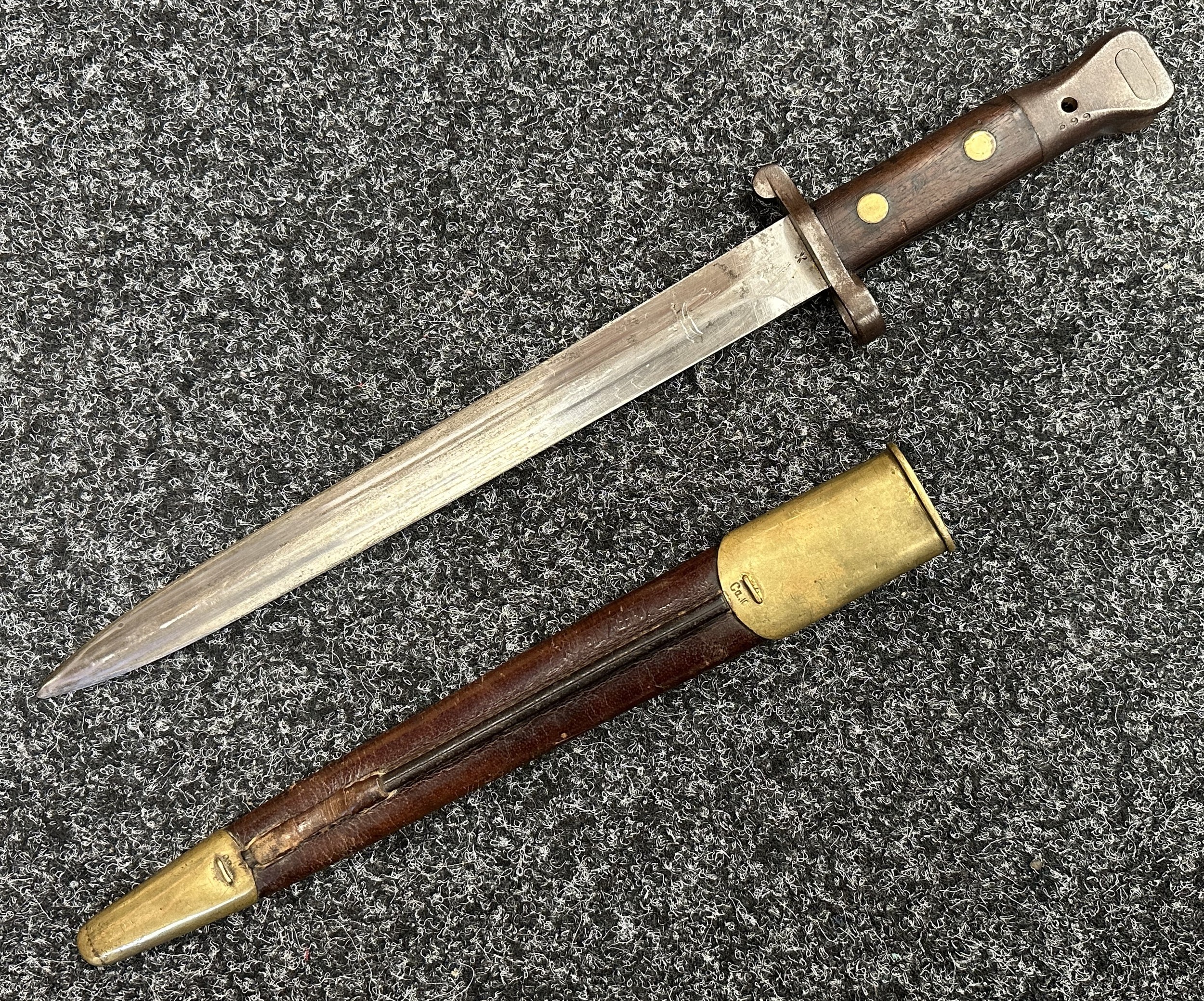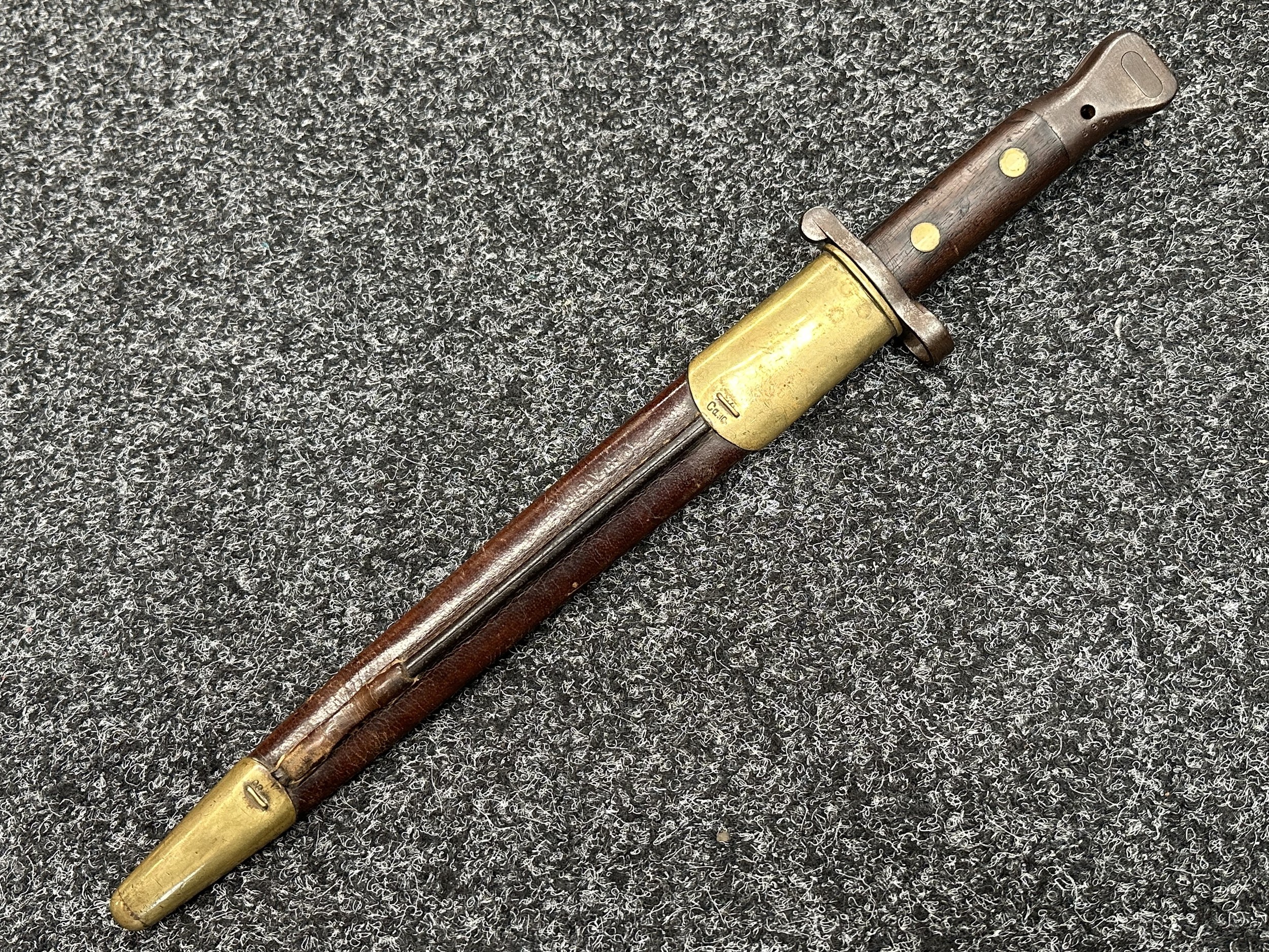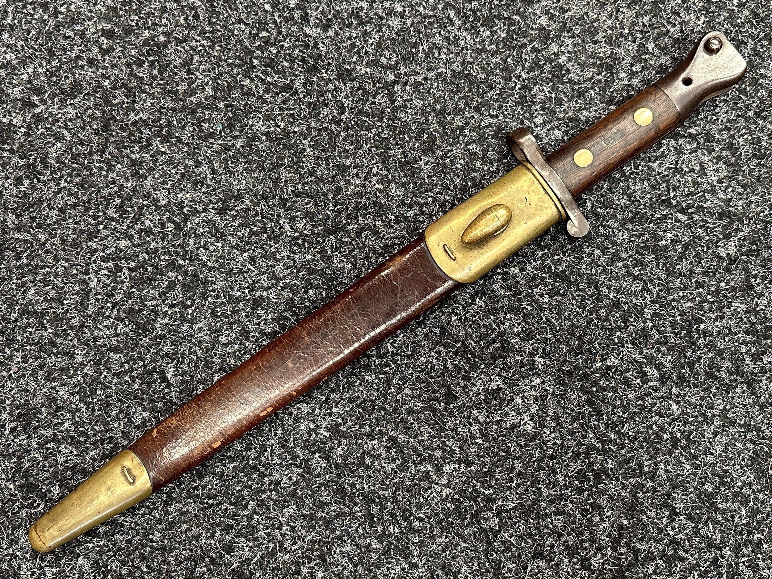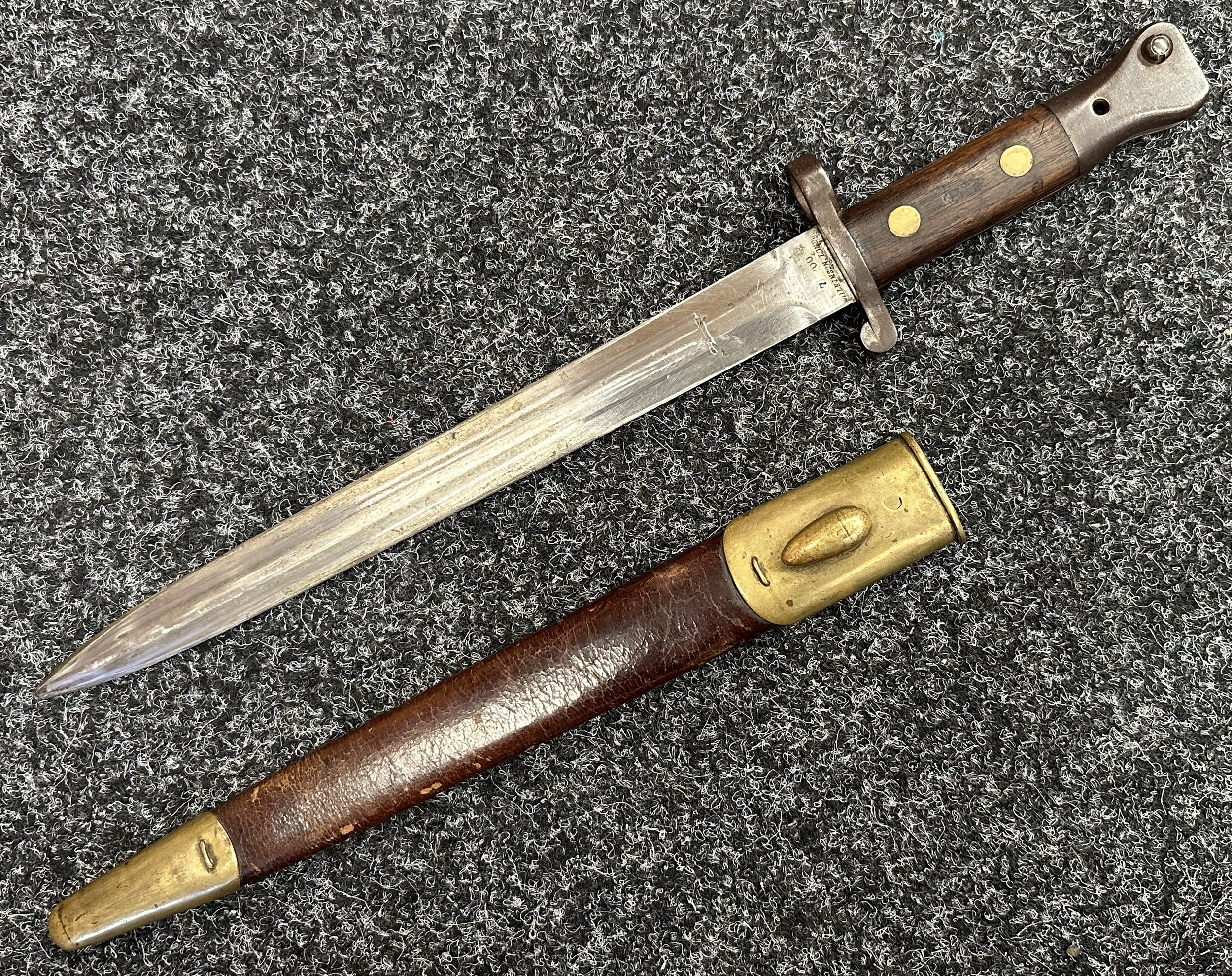 British Lee Metford 1888 Pattern Bayonet with double edged blade 300mm in length, maker marked and dated "07 '00 Wilkinson, London". Along with proof marks. Wooden grips. Pommel is numbered "399". Working release catch. Overall length 420mm. Complete with later upgraded 1903 pattern leather scabbard with brass fittings. Throat of scabbard numbered 637 and 174.