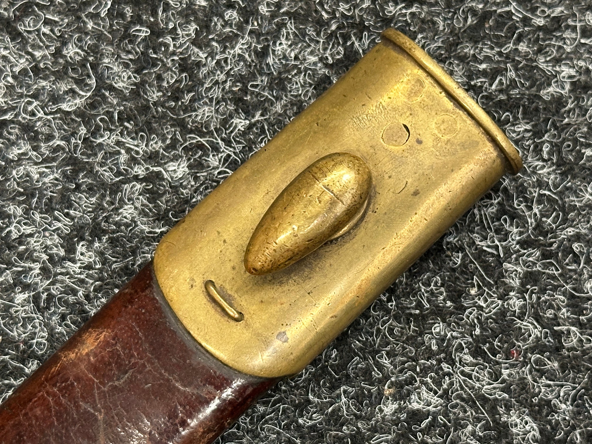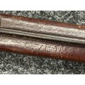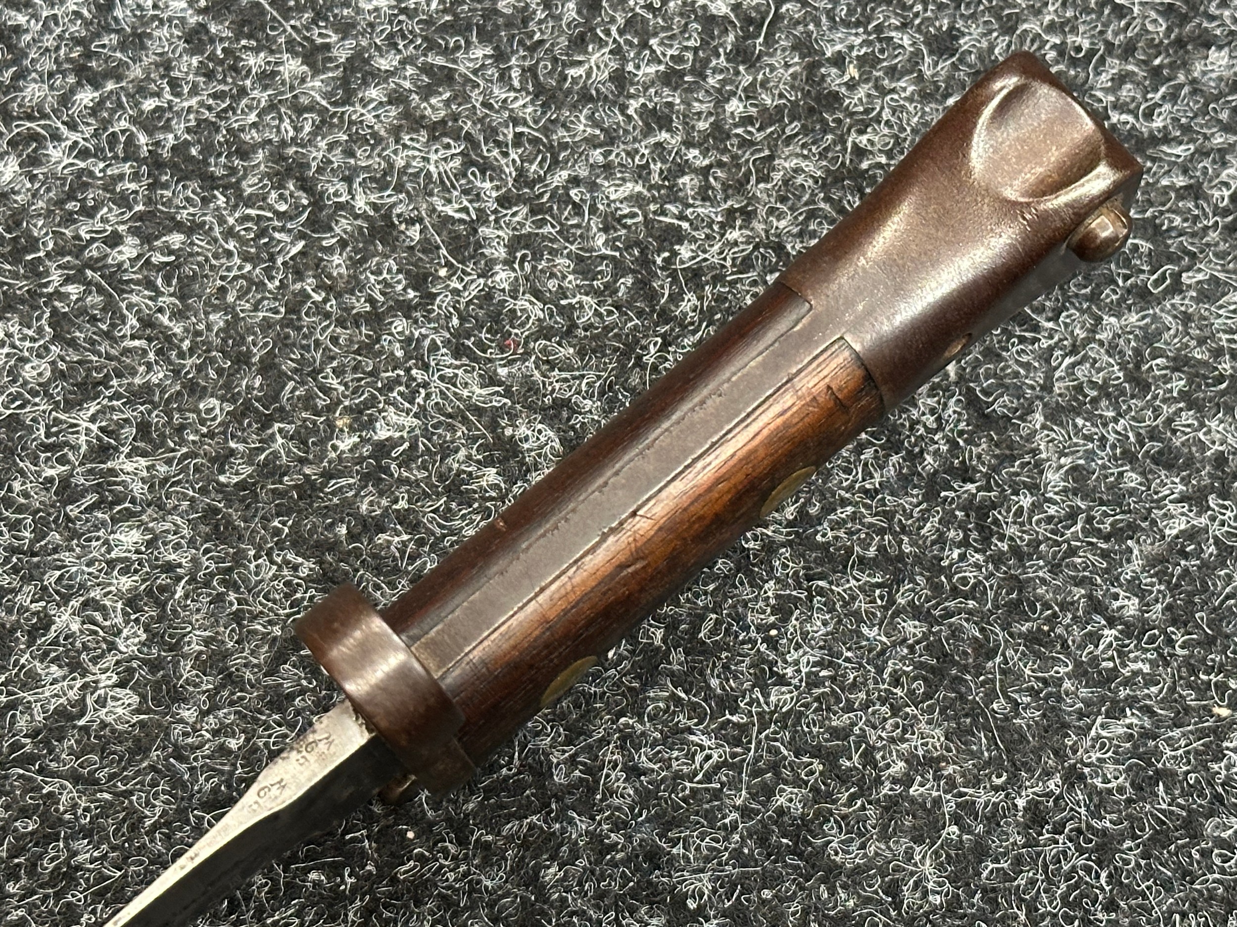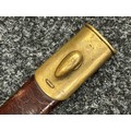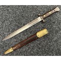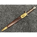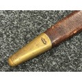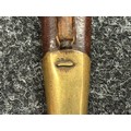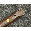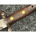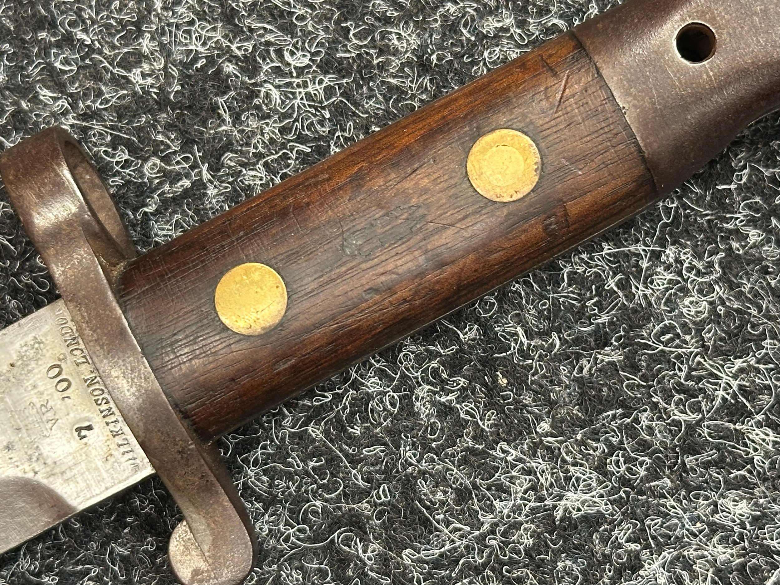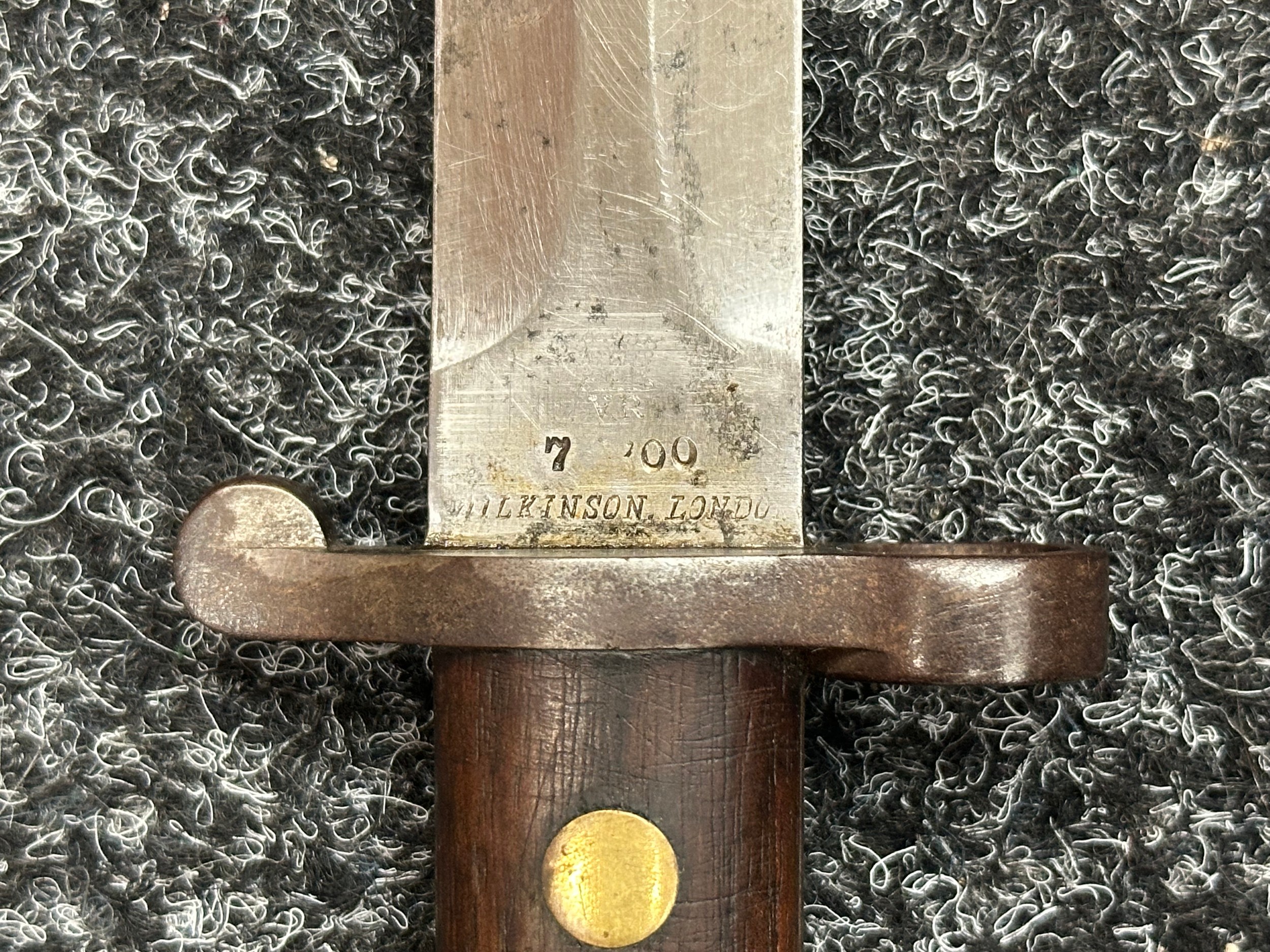 British Lee Metford 1888 Pattern Bayonet with double edged blade 300mm in length, maker marked and dated "07 '00 Wilkinson, London". Along with proof marks. Wooden grips. Pommel is numbered "399". Working release catch. Overall length 420mm. Complete with later upgraded 1903 pattern leather scabbard with brass fittings. Throat of scabbard numbered 637 and 174.