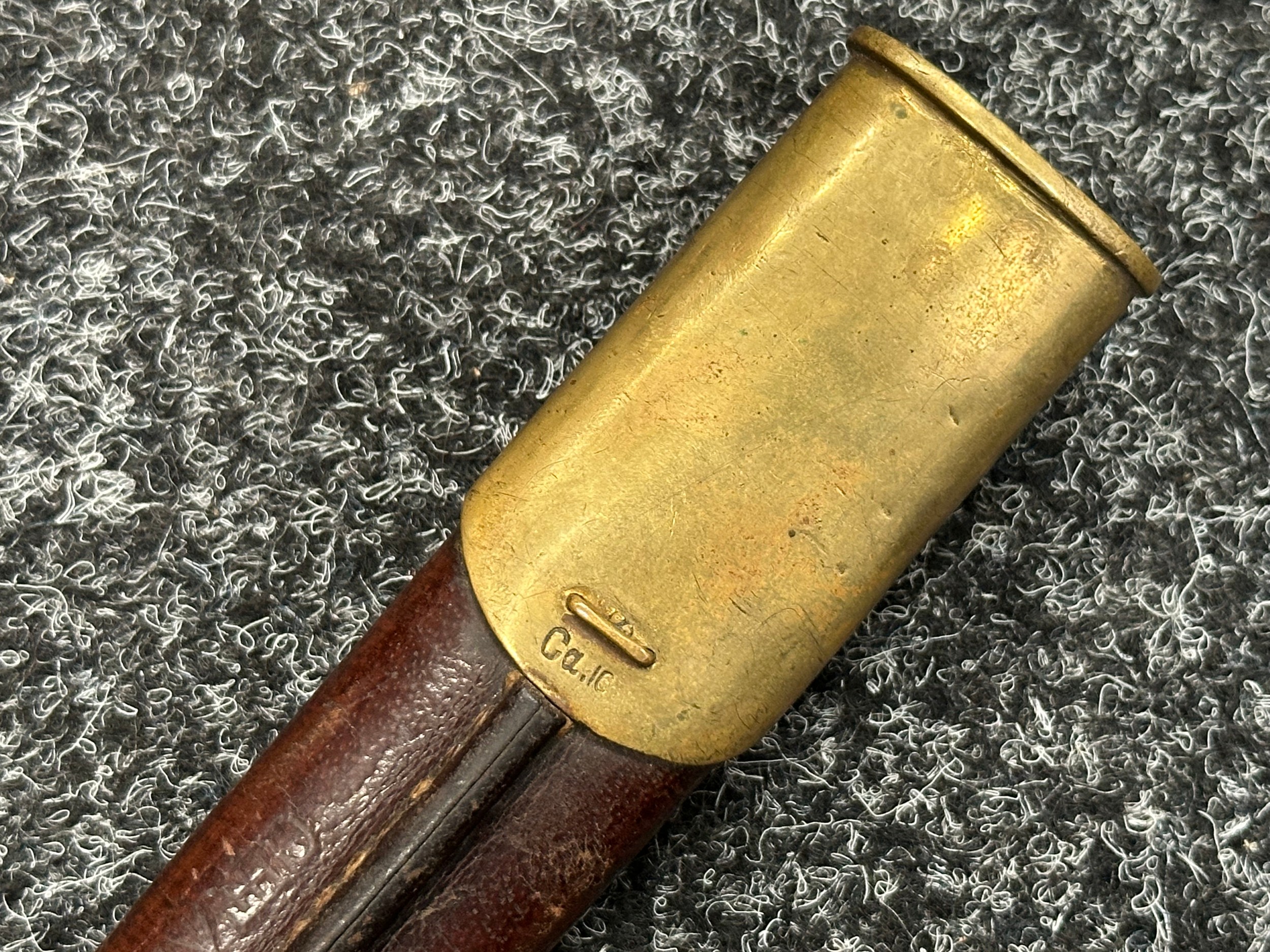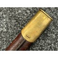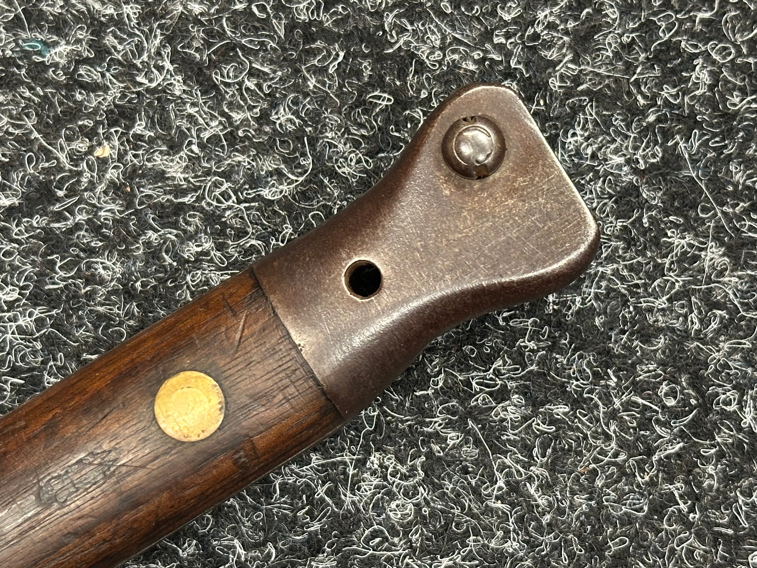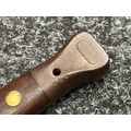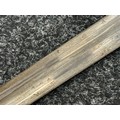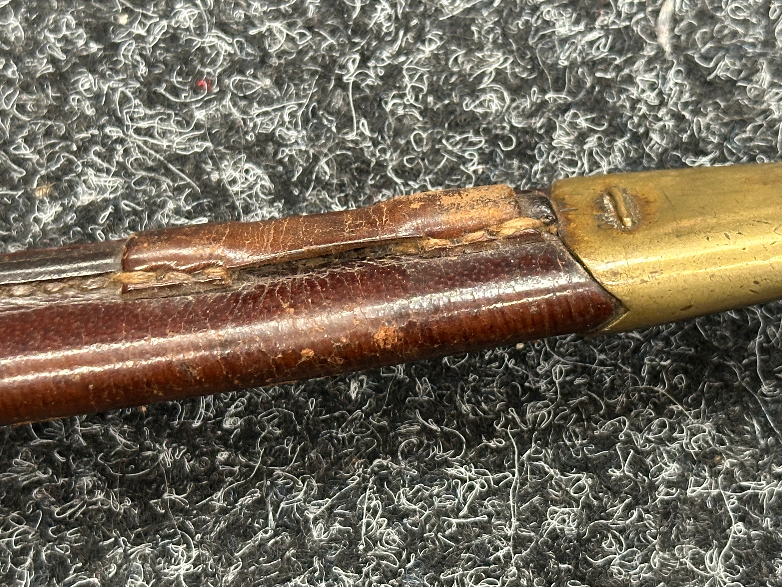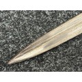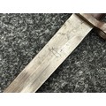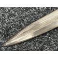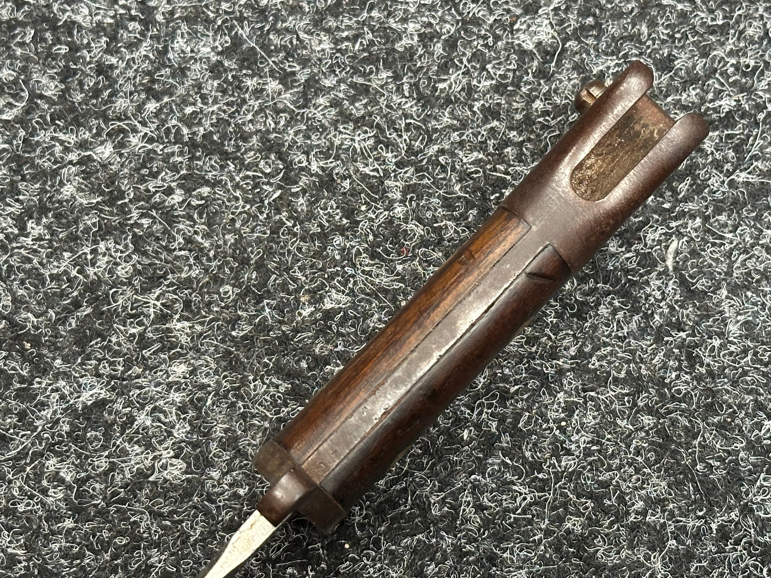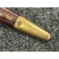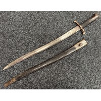 British Lee Metford 1888 Pattern Bayonet with double edged blade 300mm in length, maker marked and dated "07 '00 Wilkinson, London". Along with proof marks. Wooden grips. Pommel is numbered "399". Working release catch. Overall length 420mm. Complete with later upgraded 1903 pattern leather scabbard with brass fittings. Throat of scabbard numbered 637 and 174.
