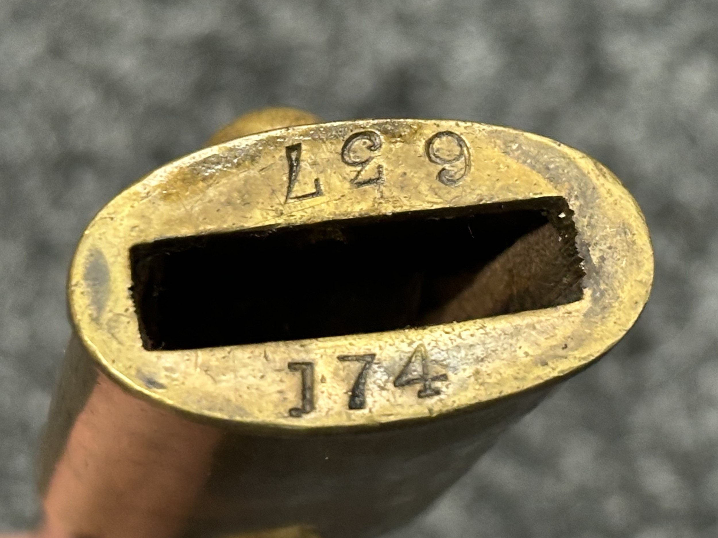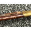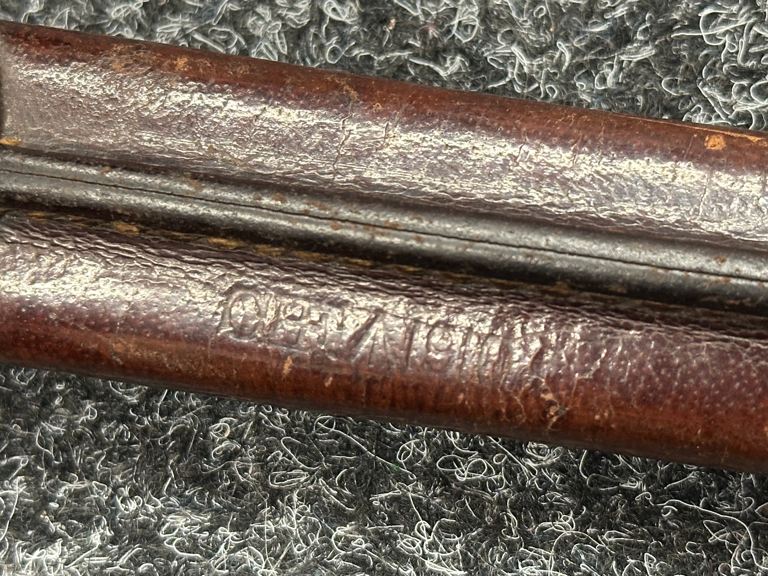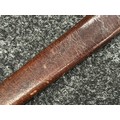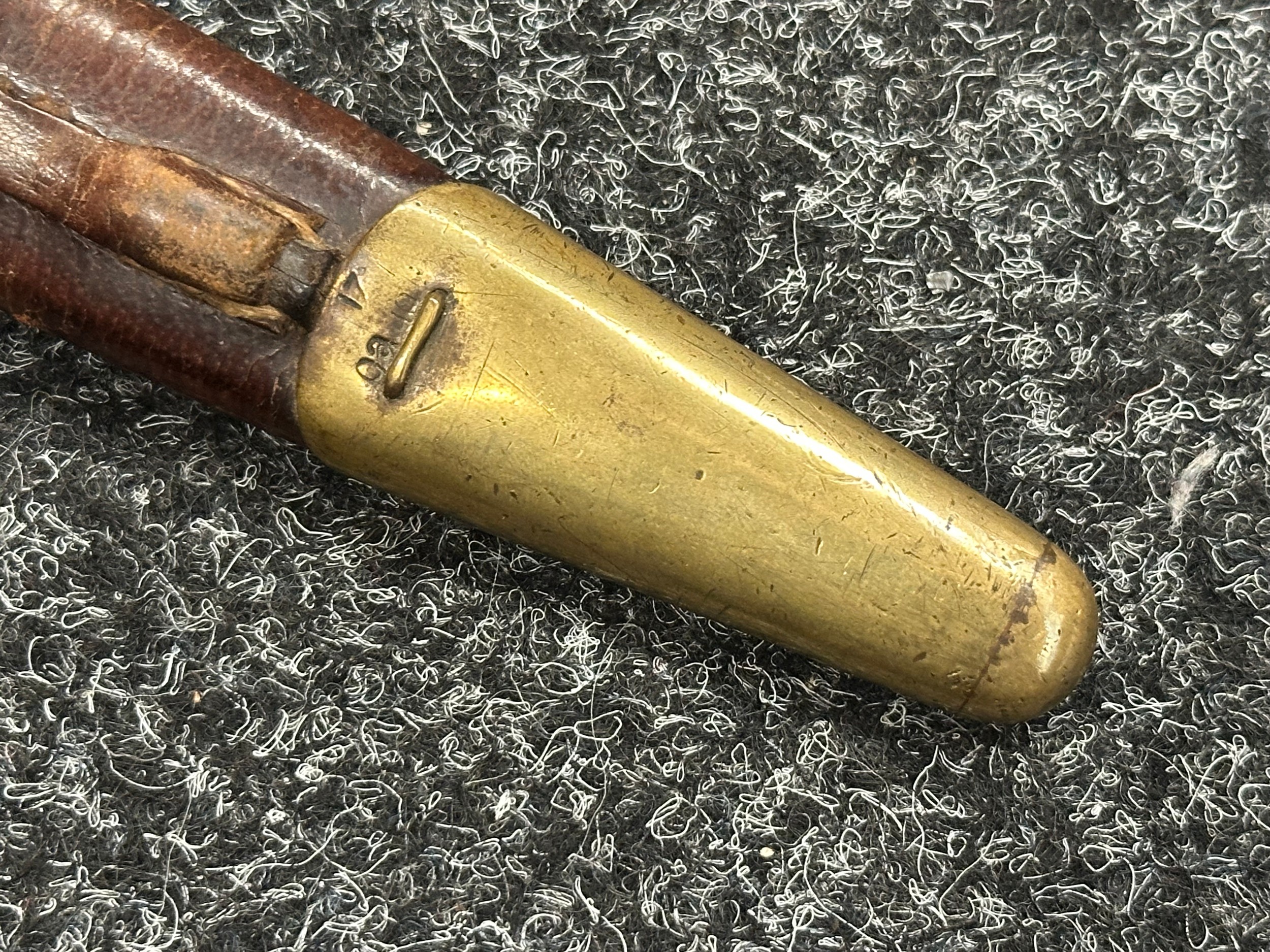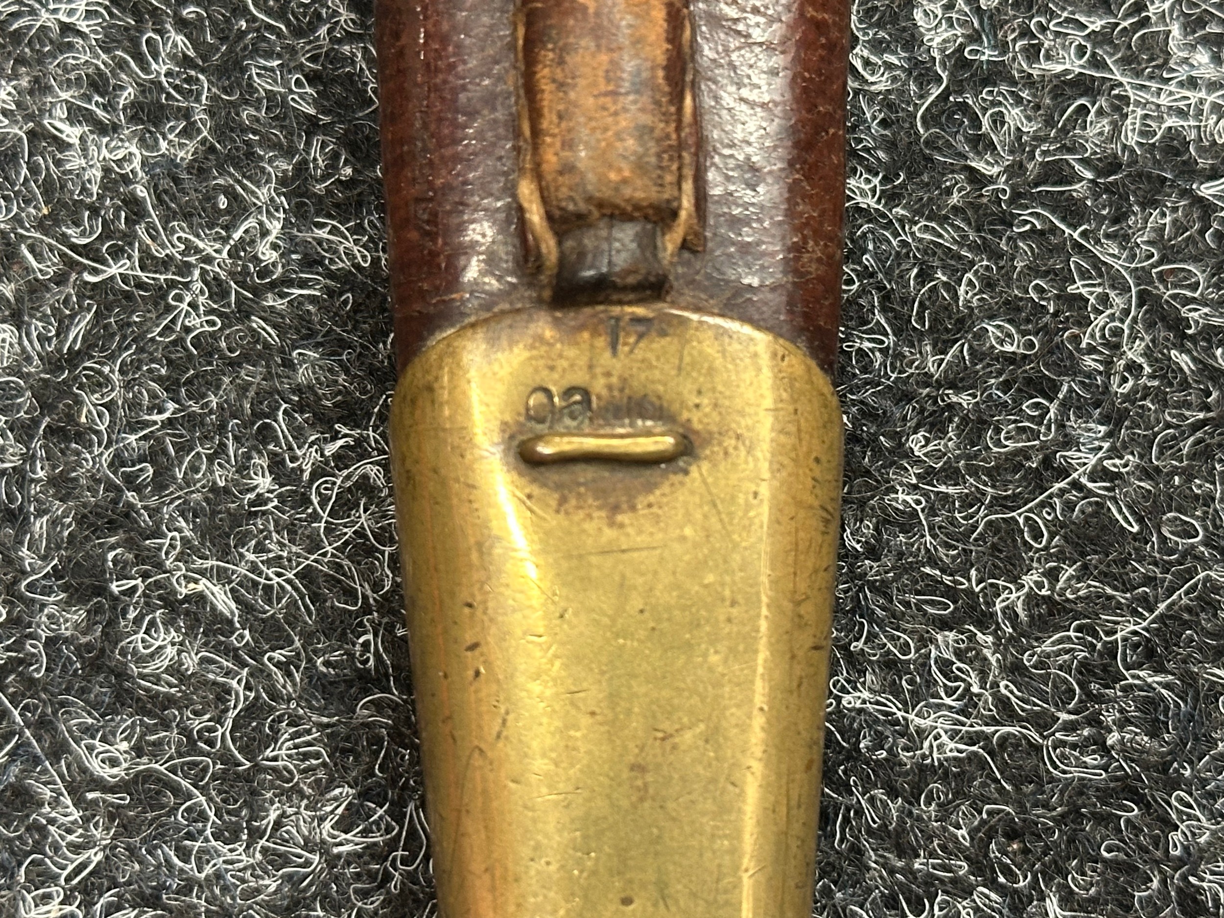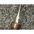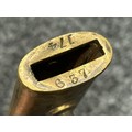 British Lee Metford 1888 Pattern Bayonet with double edged blade 300mm in length, maker marked and dated "07 '00 Wilkinson, London". Along with proof marks. Wooden grips. Pommel is numbered "399". Working release catch. Overall length 420mm. Complete with later upgraded 1903 pattern leather scabbard with brass fittings. Throat of scabbard numbered 637 and 174.