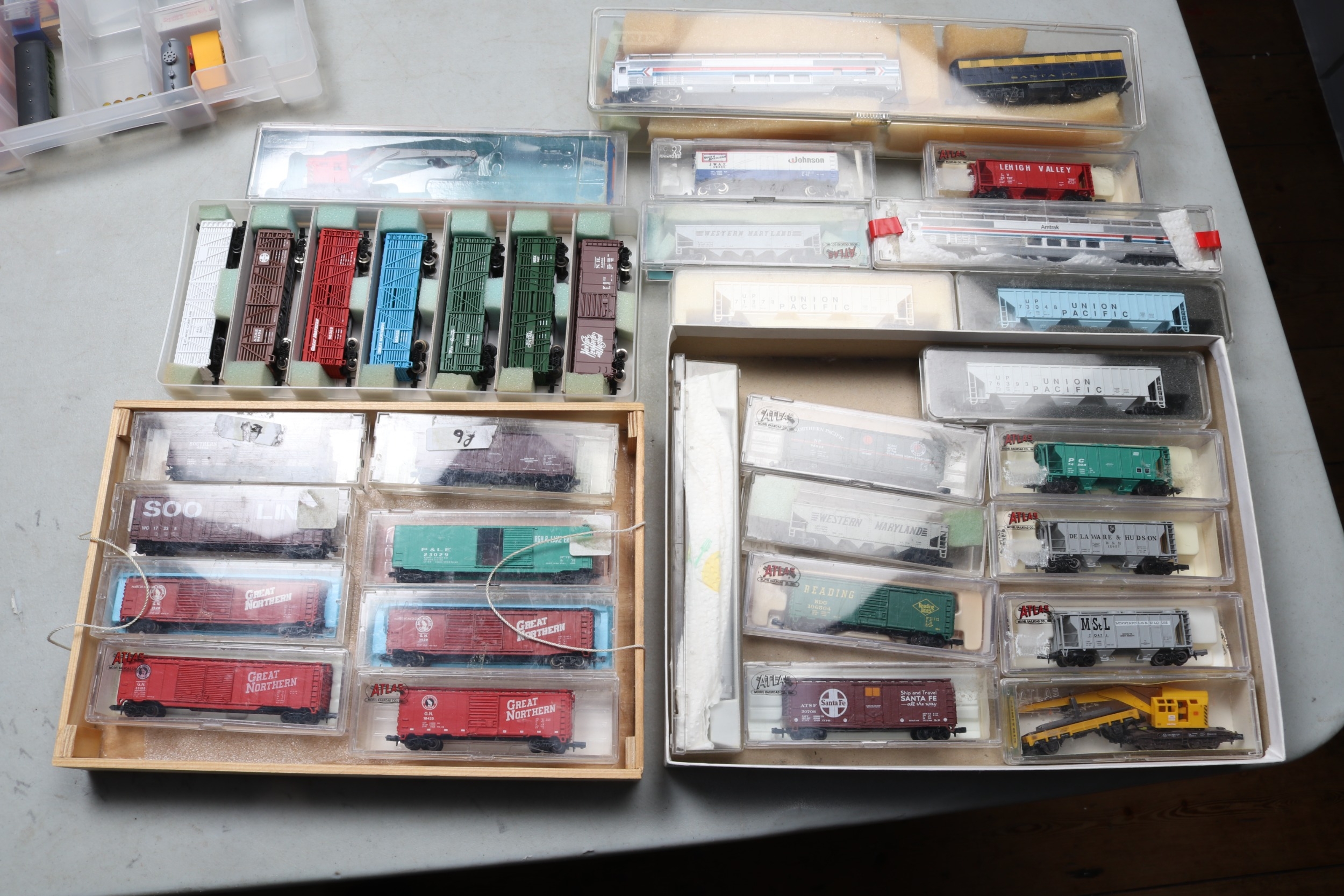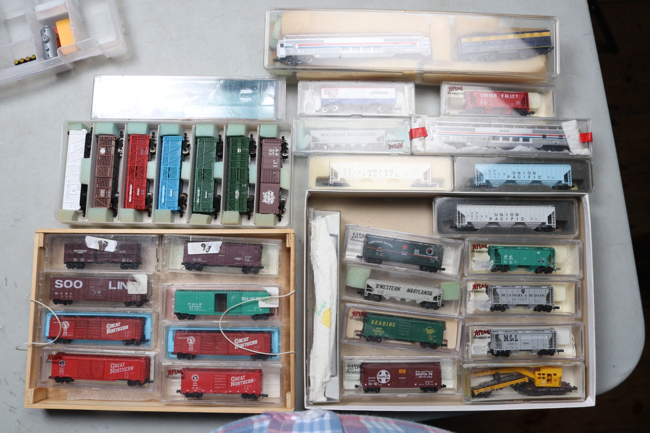 A quantity of North American Outline N gauge, freight rolling stock. Including Freight cars, Soo Line, Great Northern, P&LE, Rio Grande, Bogie tank wagon NEG, caboose, Rail mounted cranes, Freight containers, Grain wagons Northern Pacific, and other items. All unboxed. (c.60) CG-VGC £60-80