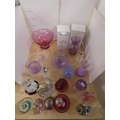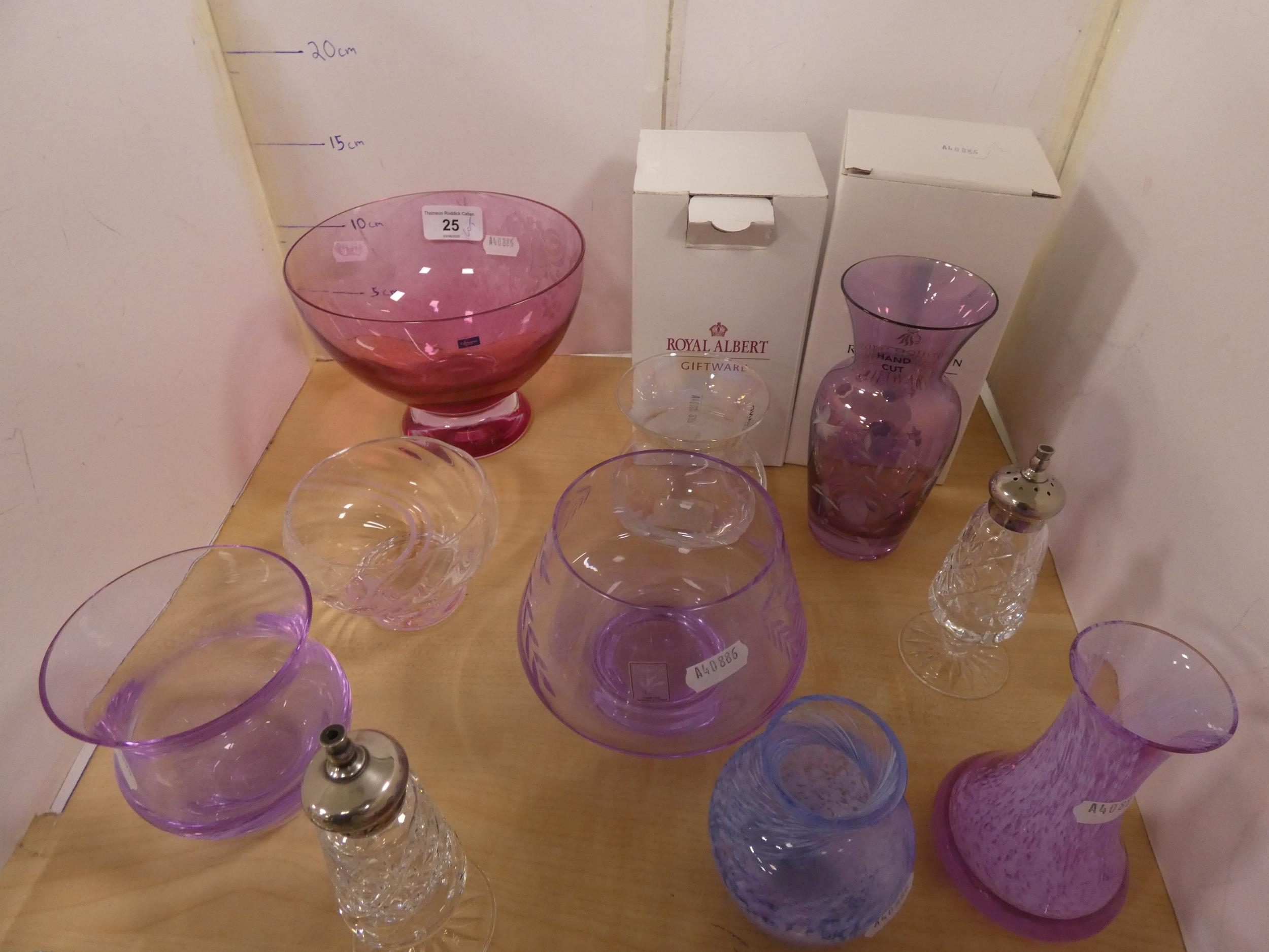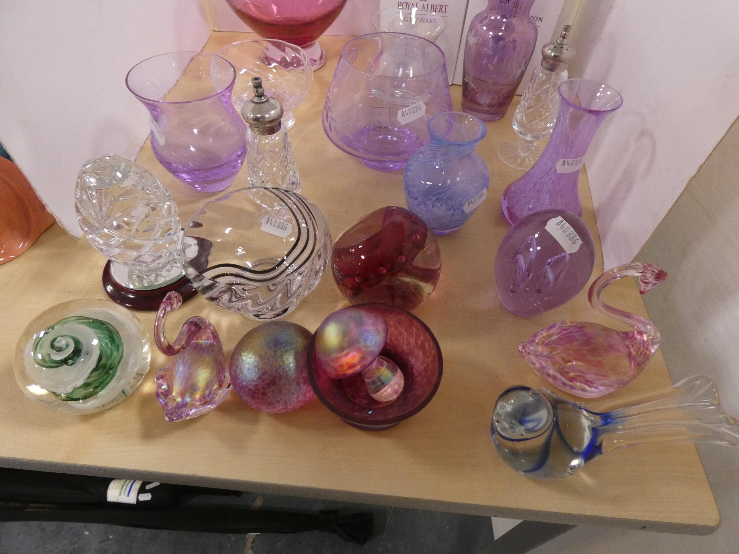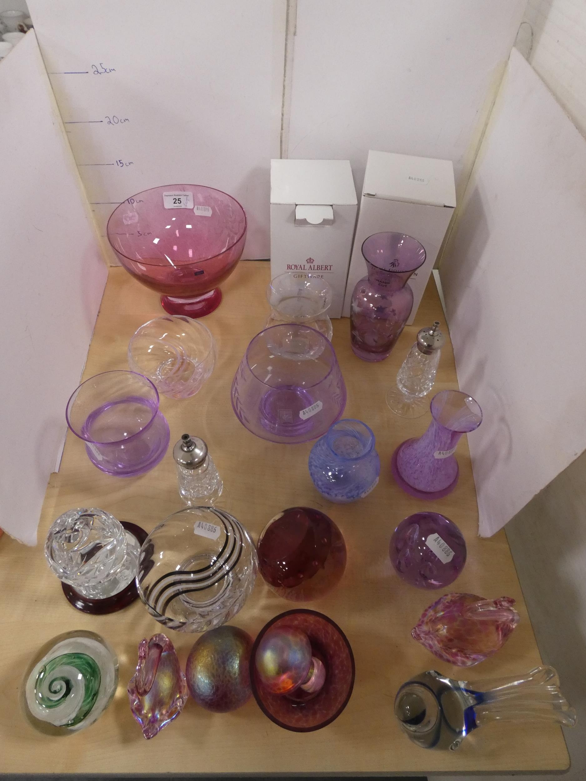 Group of Caithness art glass to include tinted glass bowls, spill vases and paperweights, glass animal ornaments and similar gift ware items by Royal Albert and Royal Doulton.