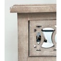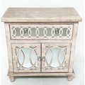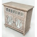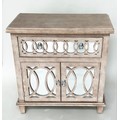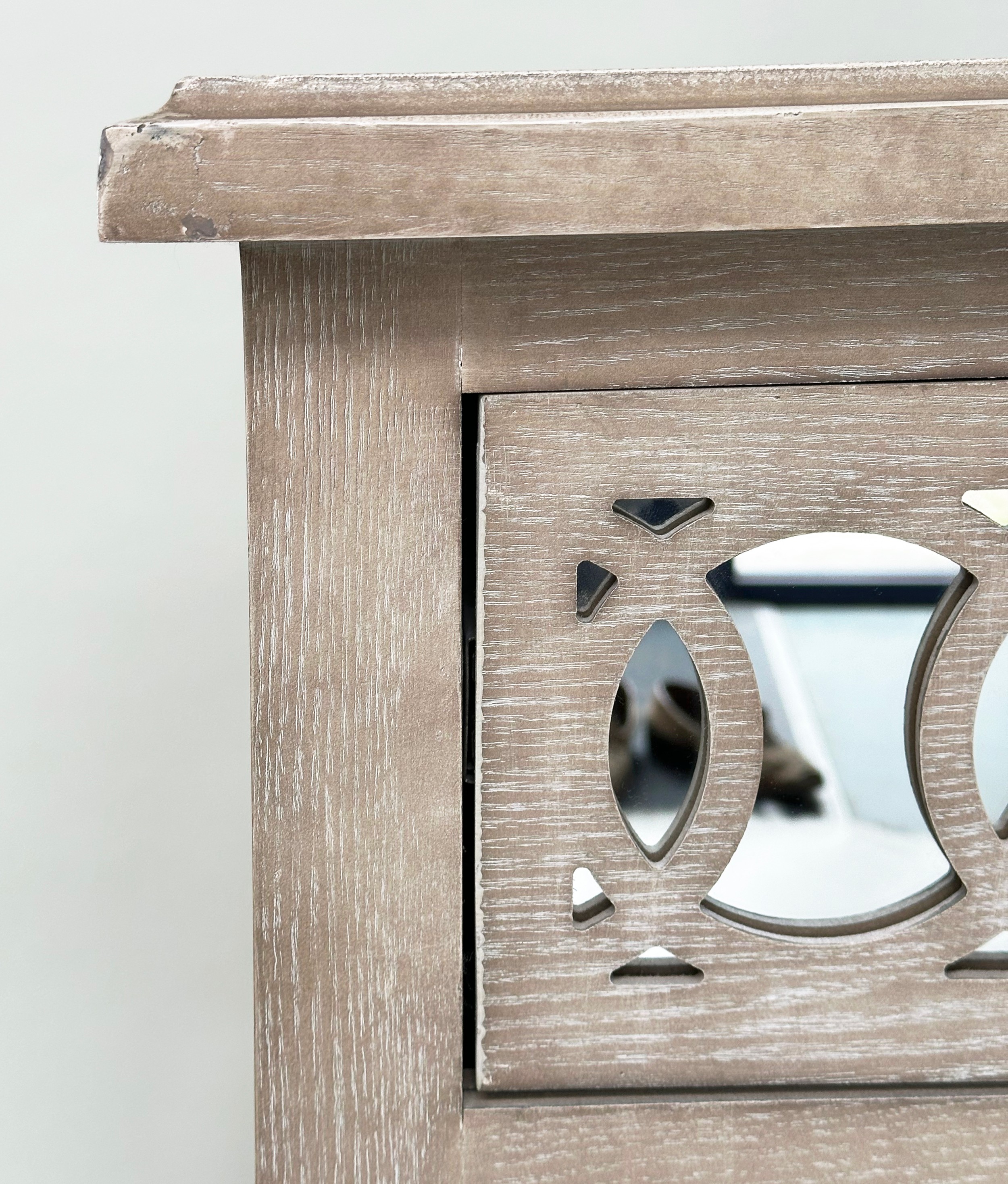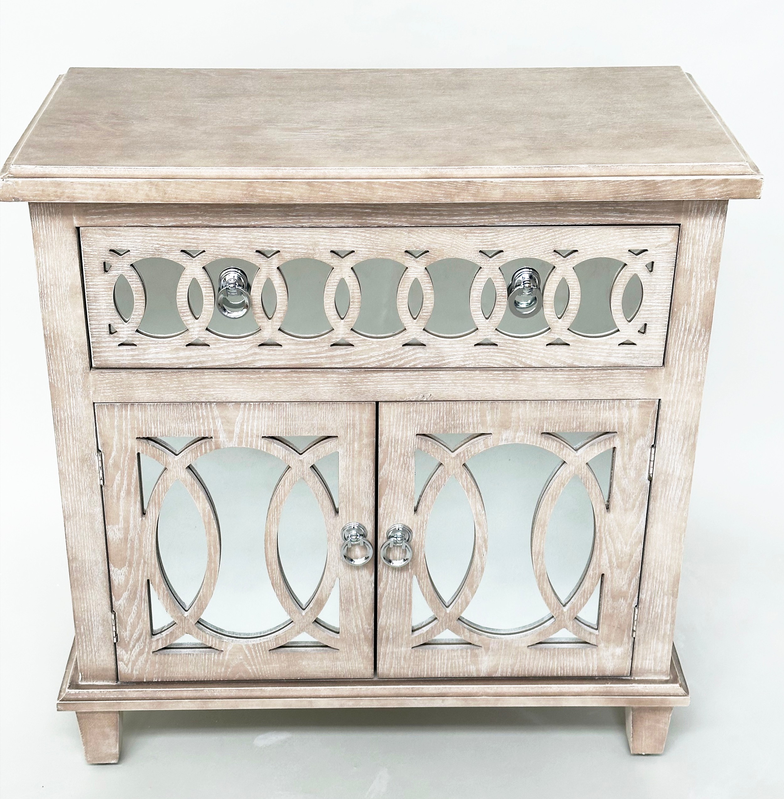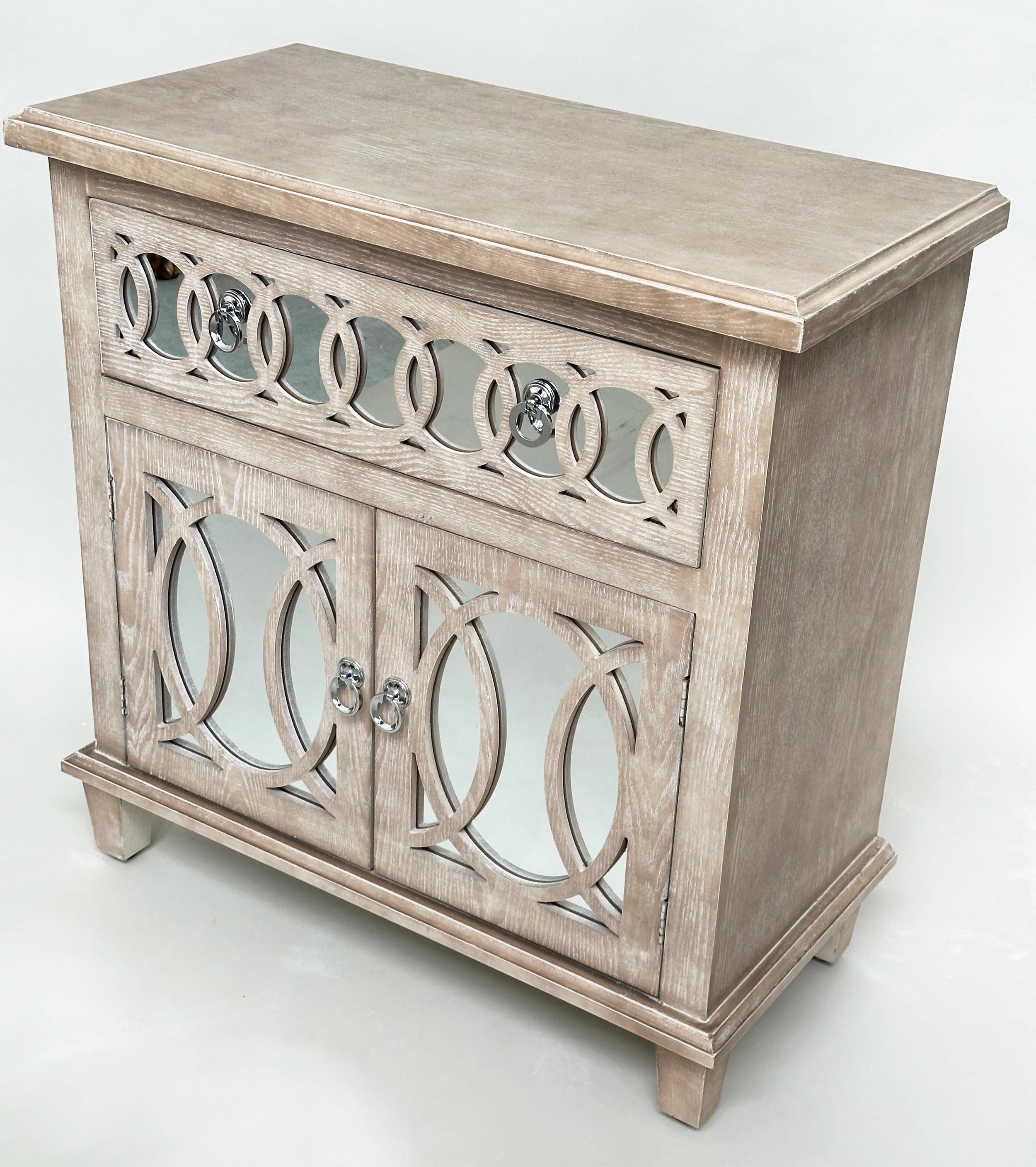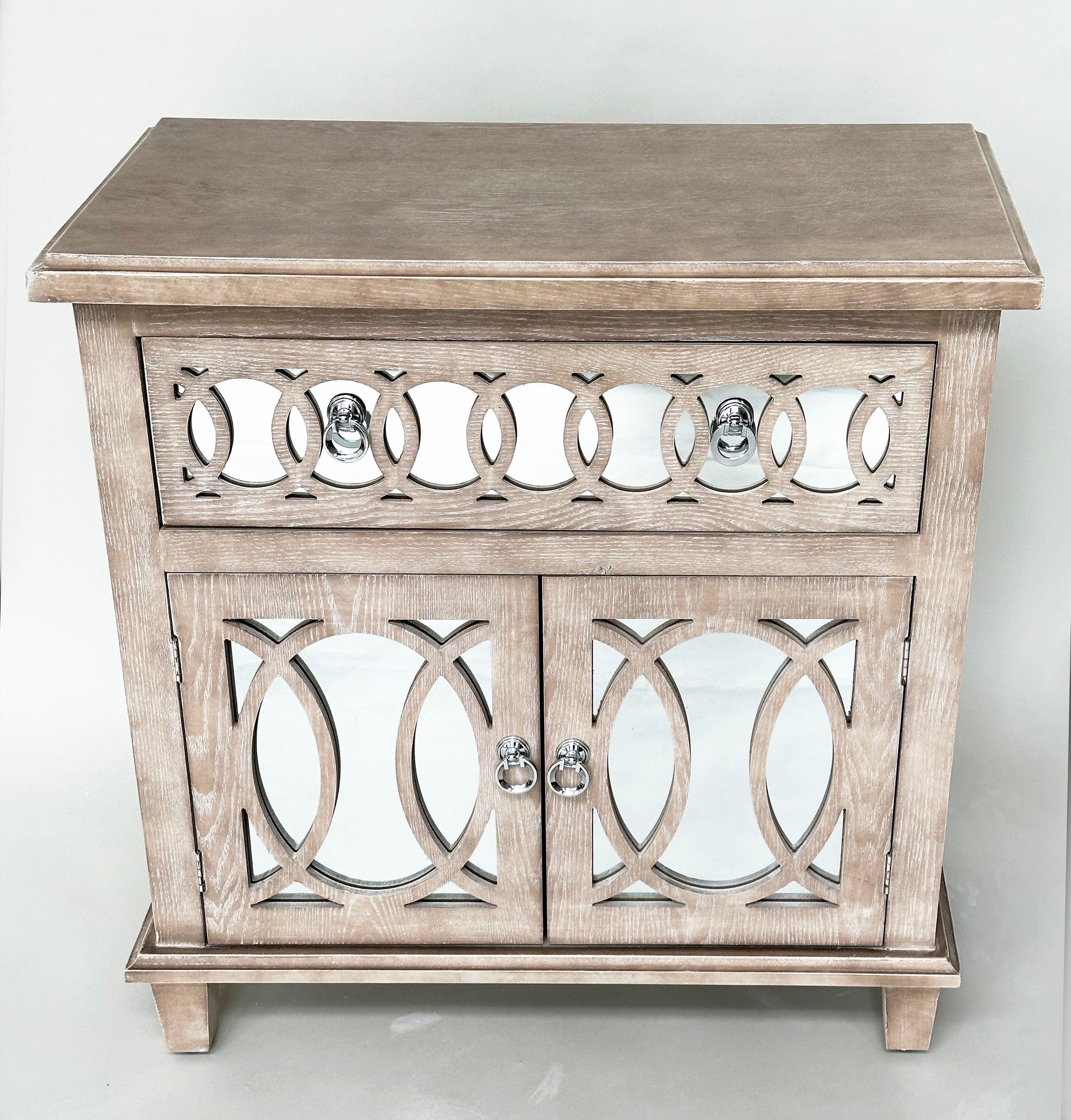 SIDE CABINET, limed oak, mirror panelled and tracery decorated with drawer and two doors, 80cm x 40cm x 81cm H.