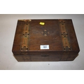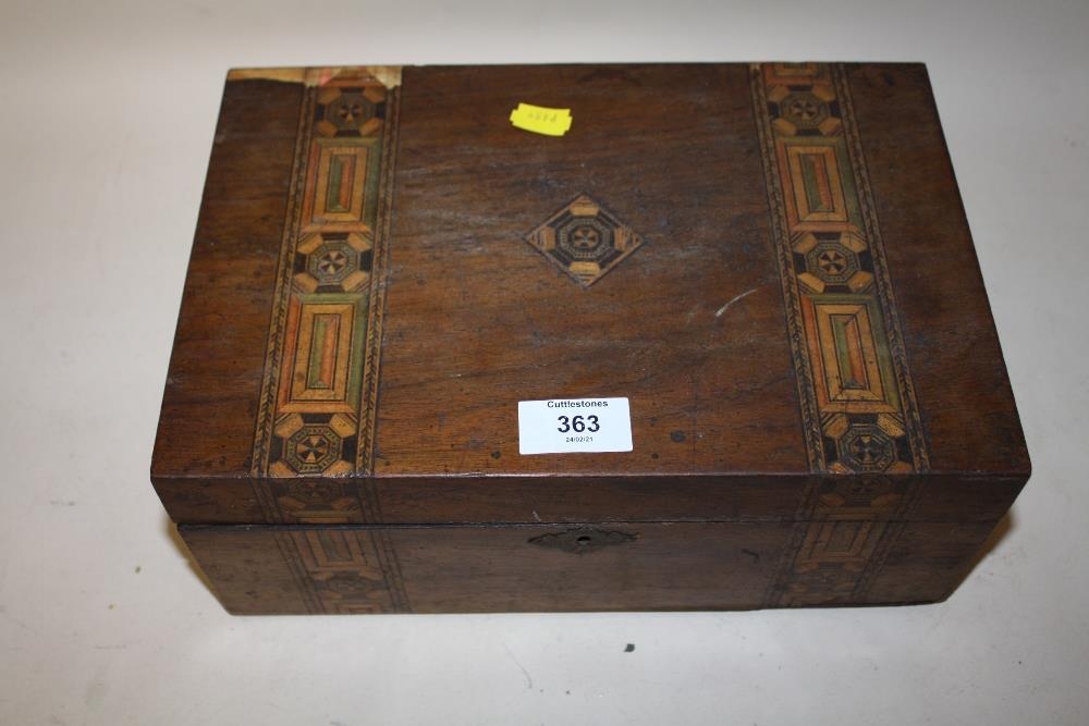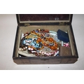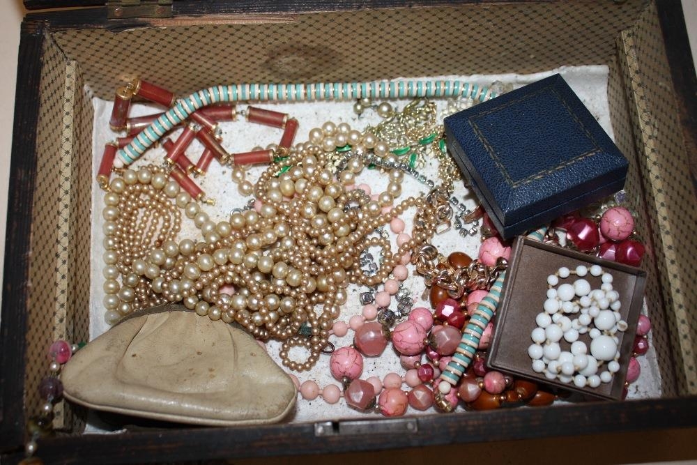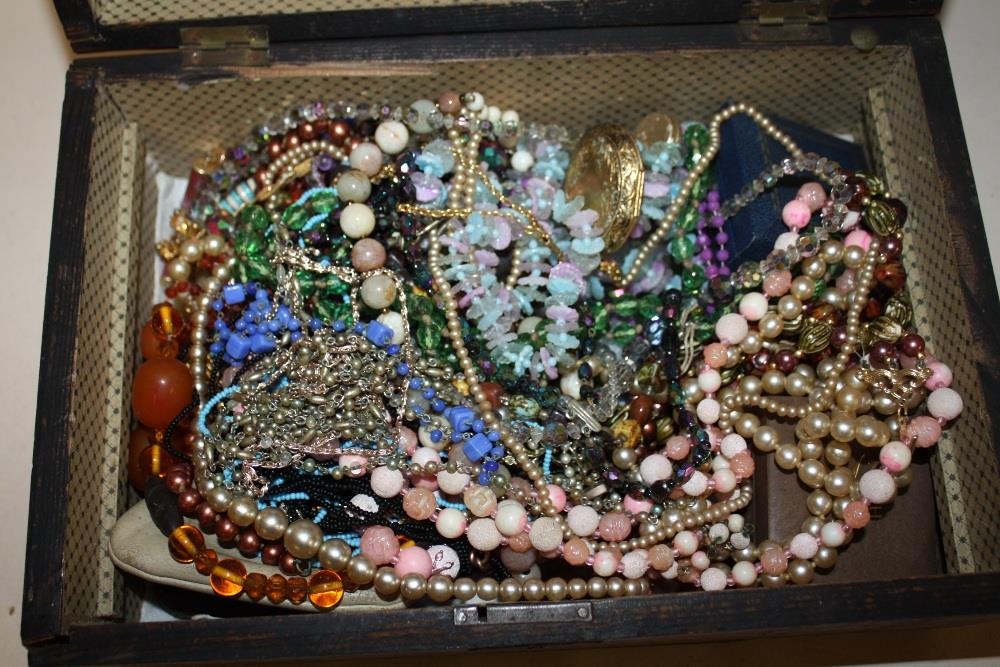 AN INLAID MAHOGANY LIDDED BOX CONTAINING COSTUME JEWELLERY TO INCLUDE AN AMBER STYLE NECKLACE