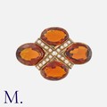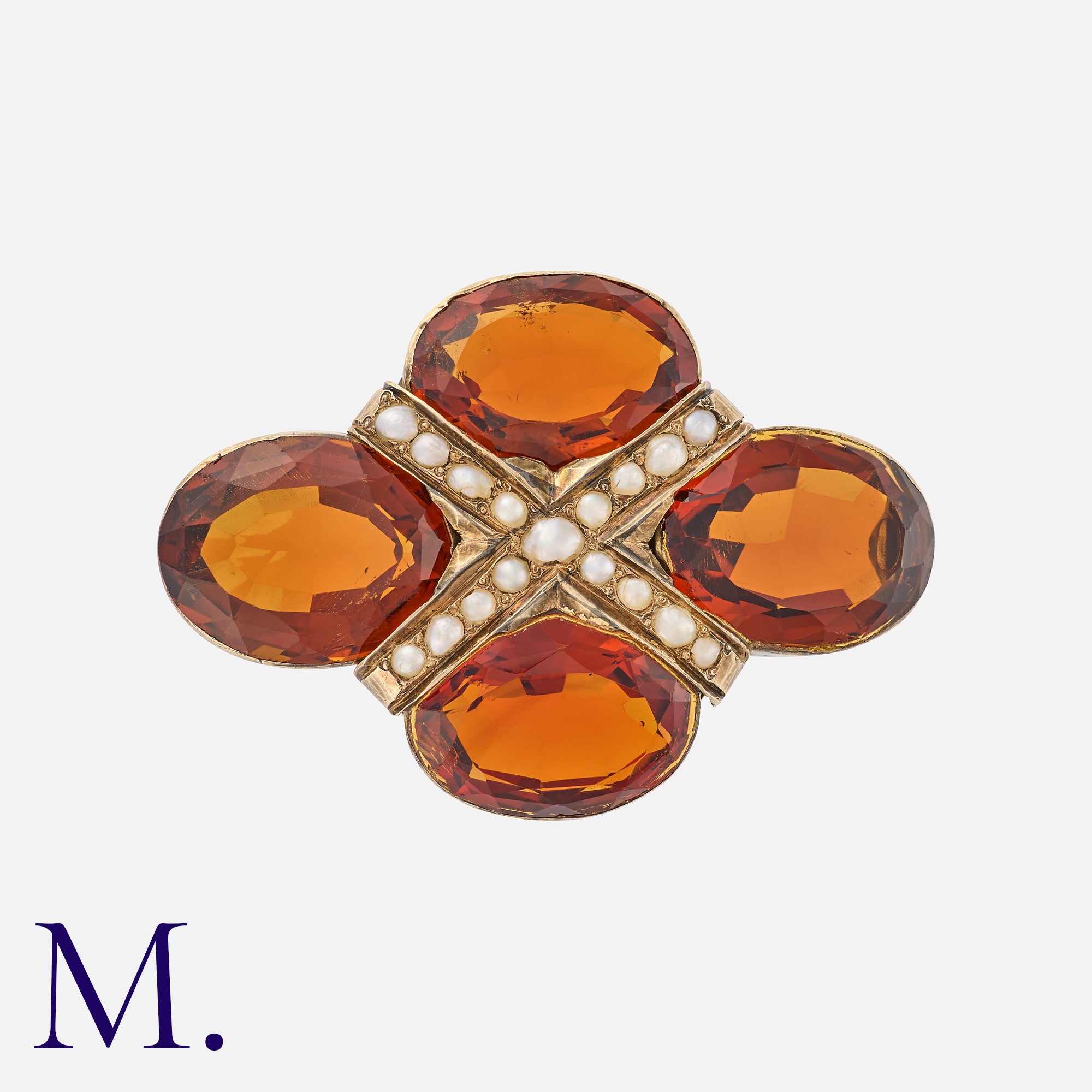 A Citrine And Pearl Brooch in yellow gold, set with four oval cut madeira citrine, accented by a pearl set cross motif to the centre. Glazed locket to reverse. Unmarked, tests indicate 10 carat gold.