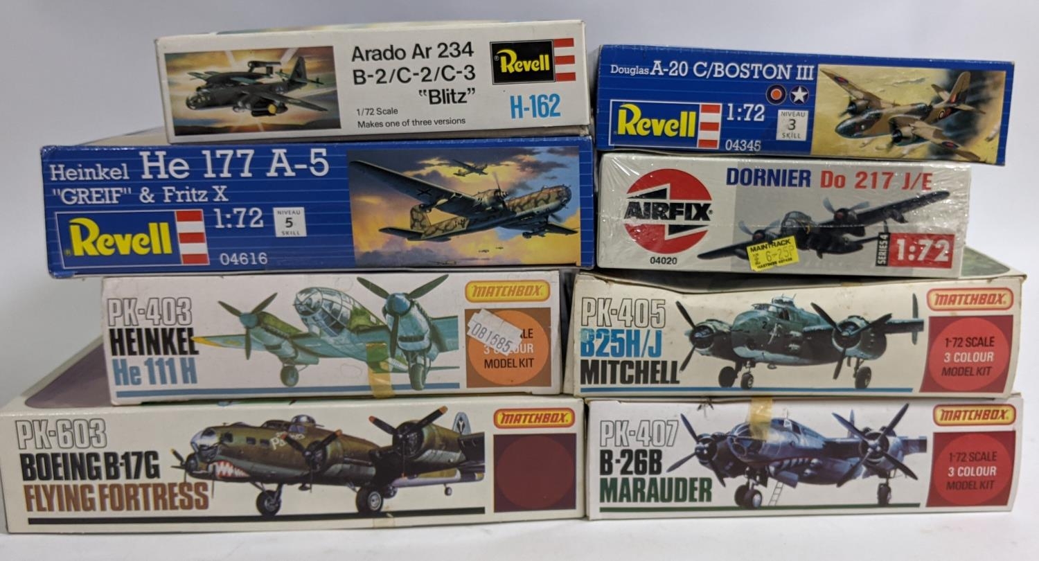 Collection of 9 model aircraft kits all 1:72 scale WW2 bombers and believed to be complete. Includes Airfix Dornier 217 (in sealed cellophane), others by Matchbox, Revell and Contrail. See photos for model details (9)