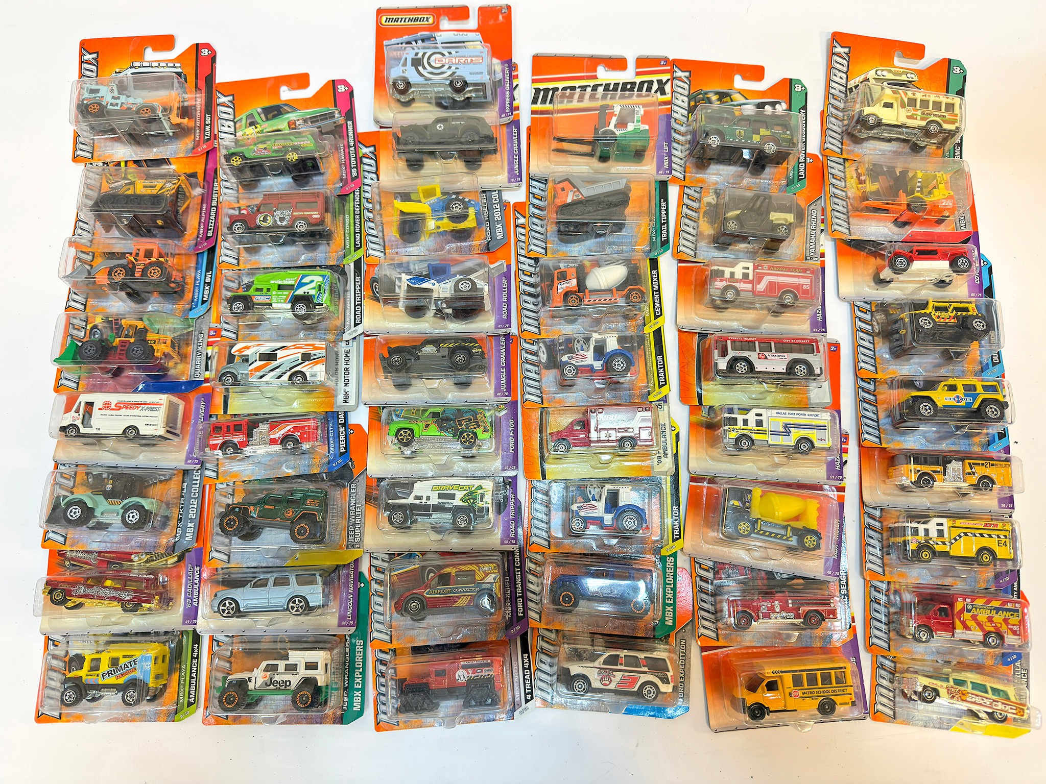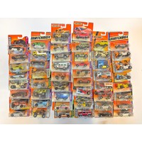A group of 50 carded Matchbox diecast model vehicles comprising 1) Matchbox MBX Lift, 2) Matchbox Roller, 3) Matchbox Jungle Crawler, 4) Matchbox Mixer, 5) Matchbox Ford F100 , plus others as shown. All appear excellent in original boxes.
