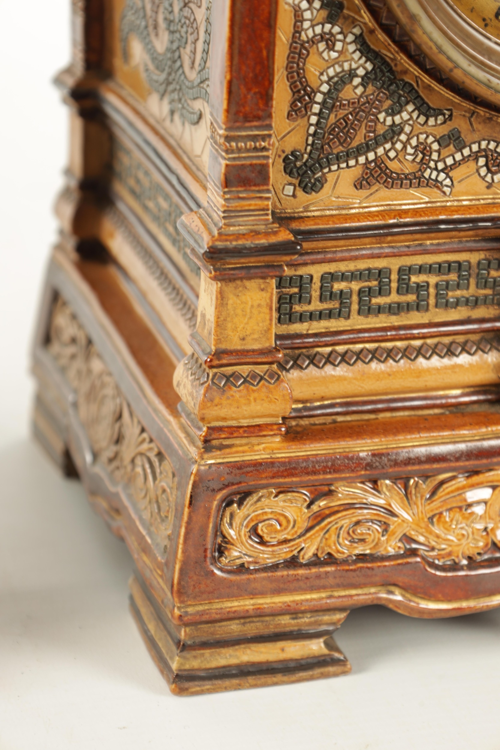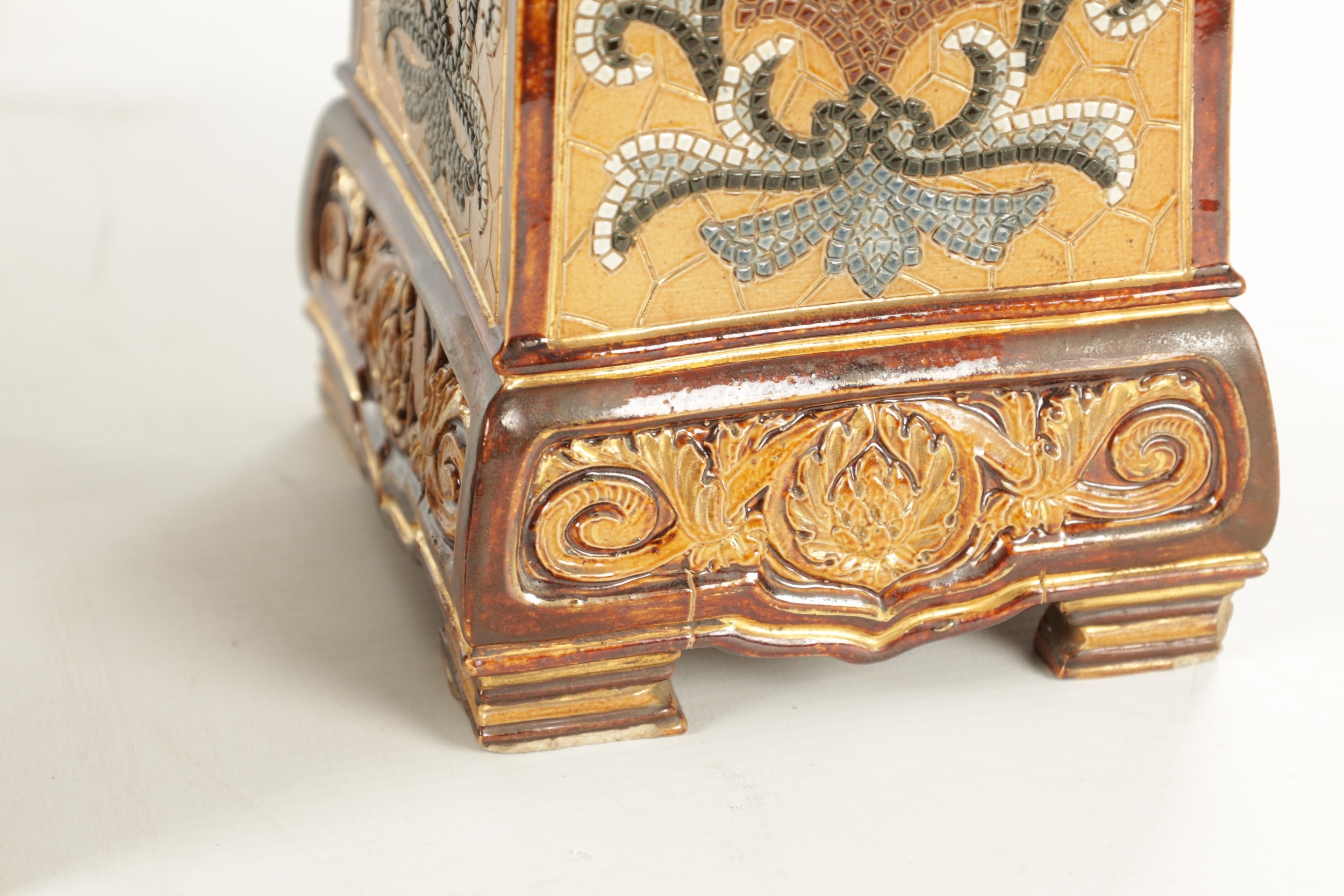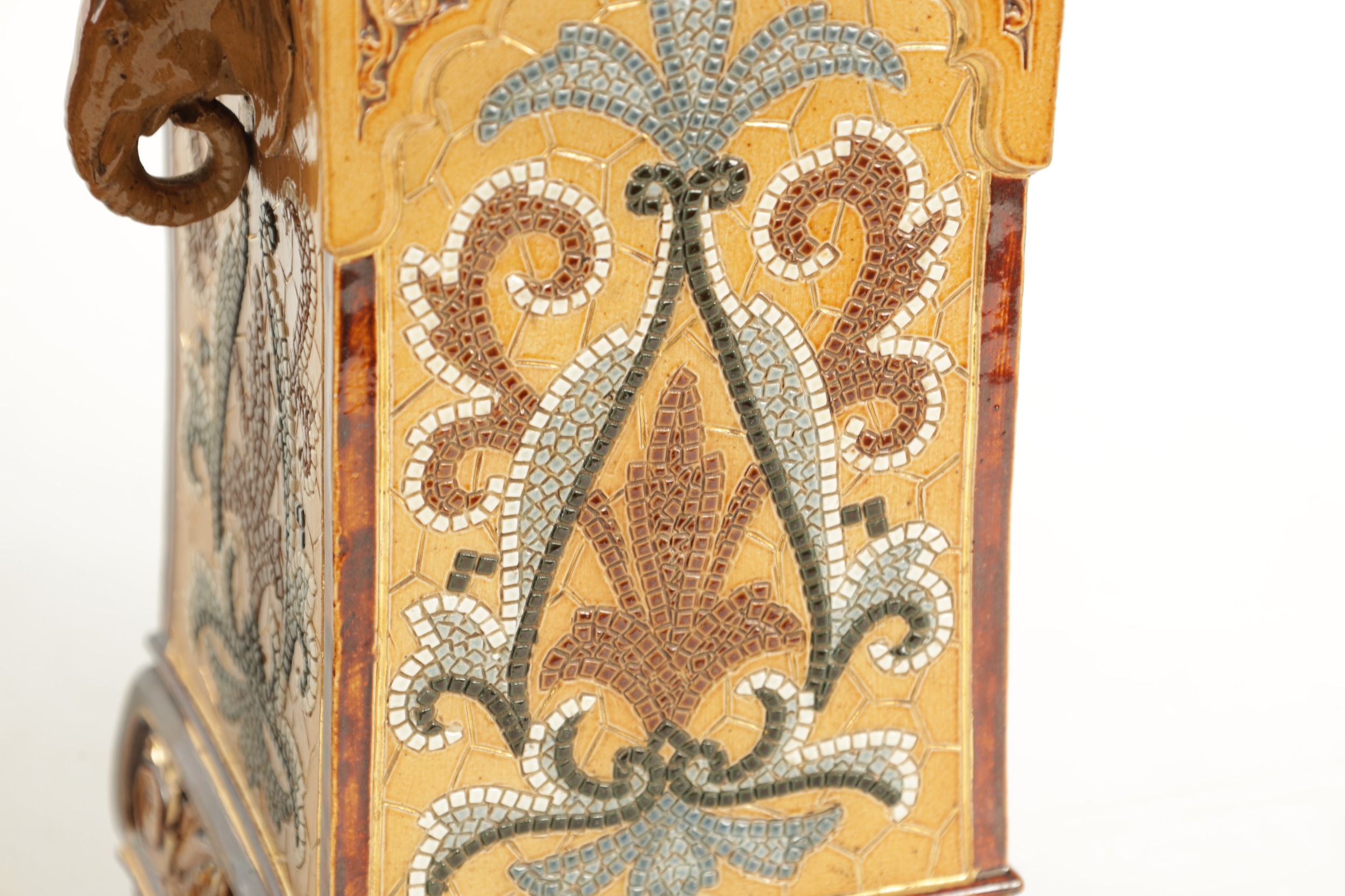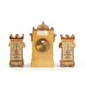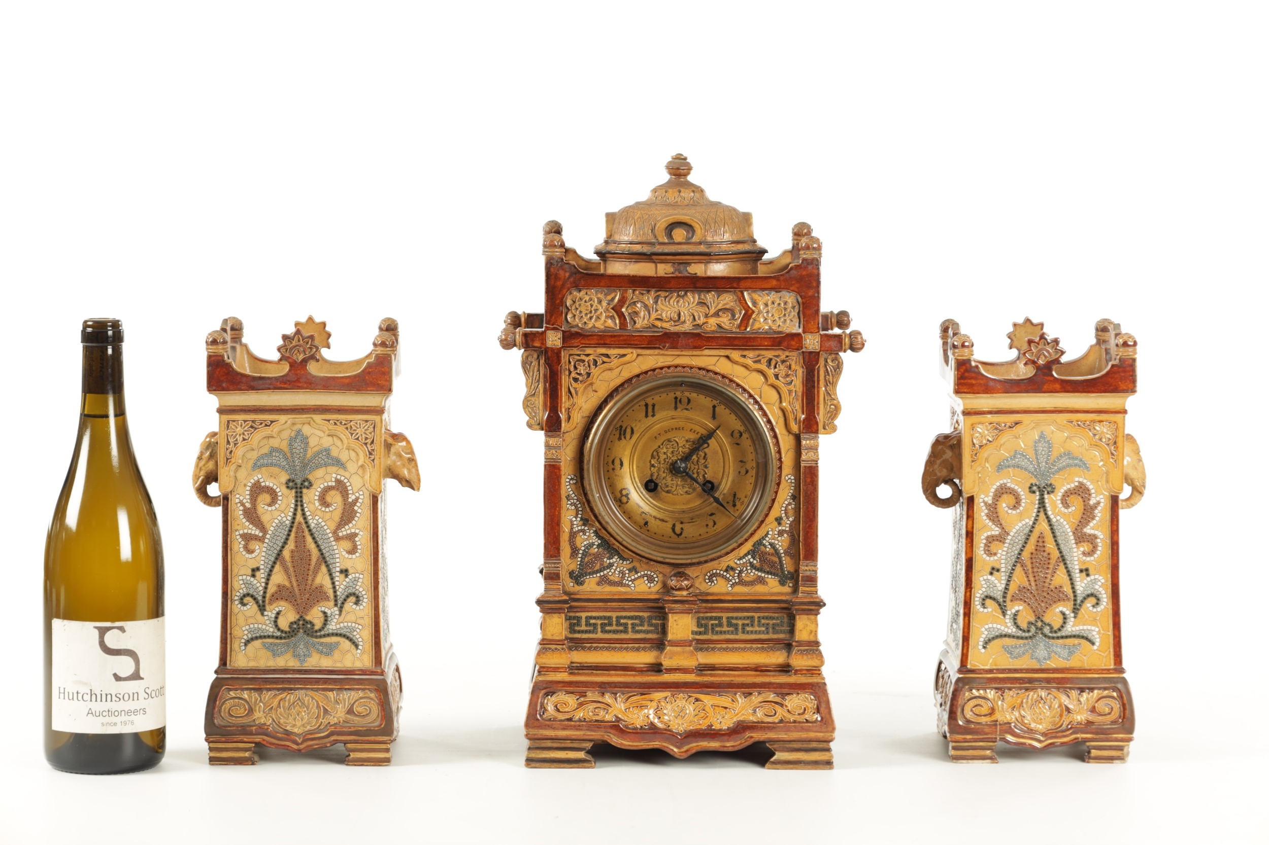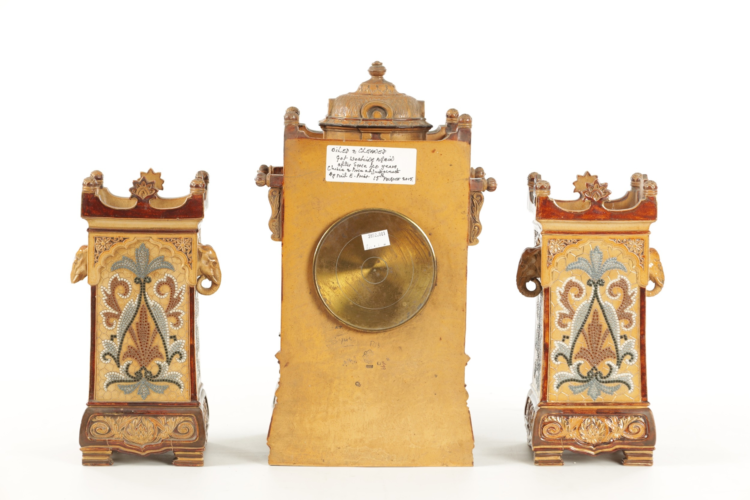 A LATE 19TH CENTURY DOULTON LAMBETH CLOCK GARNITURE the aesthetic designed case with micro mosaic style decoration and impressed maker's marks enclosing a 4" gilt brass dial with Arabic numerals fronting an eight day spring driven movement striking the hours/half hours on a gong, the matching garniture vases with elephant mask handles, impressed marks to the undersides. (41cm high)