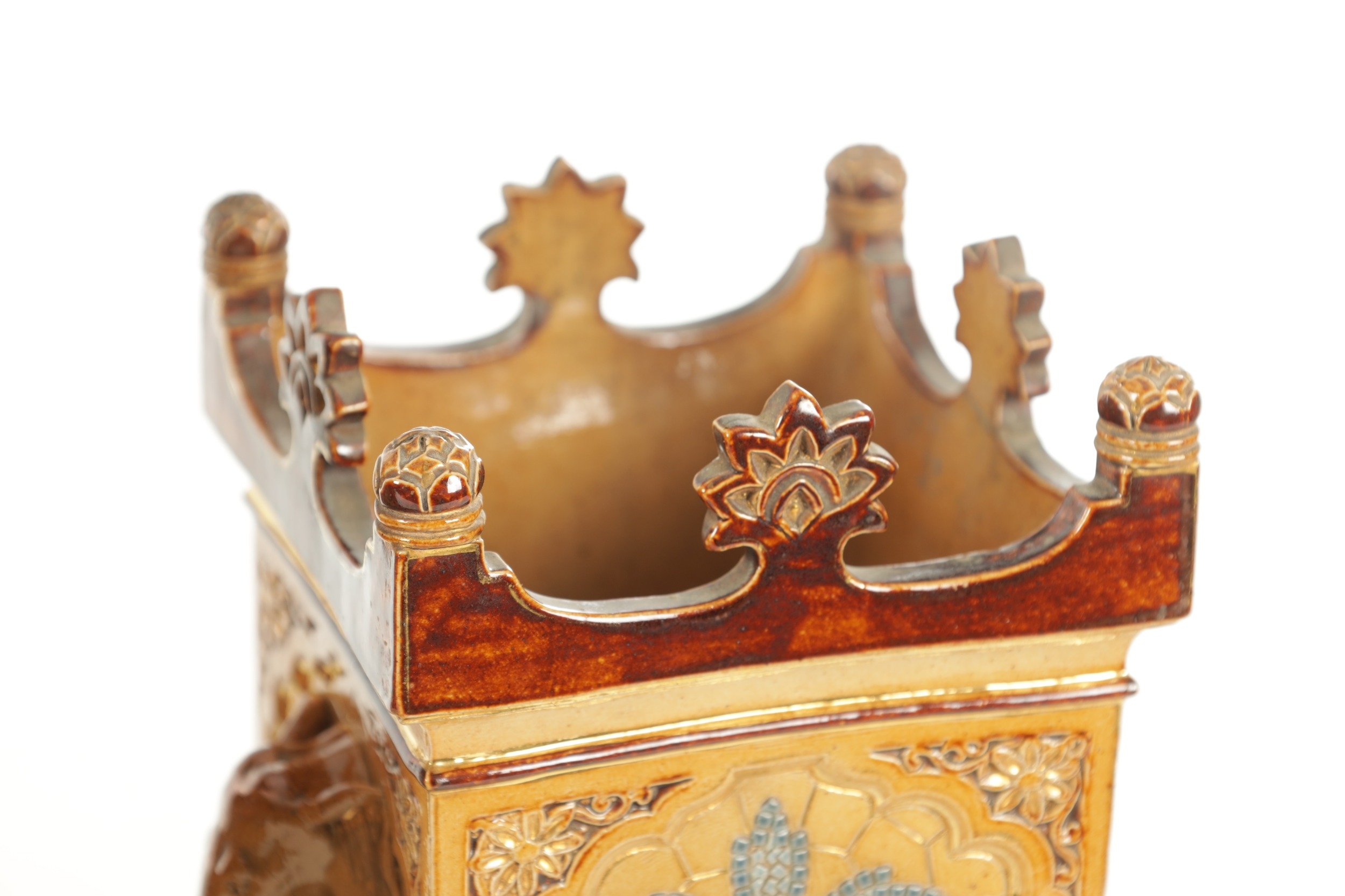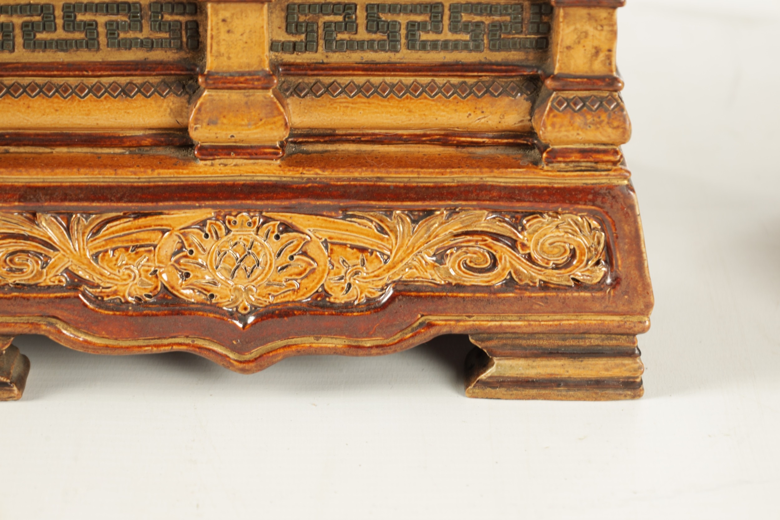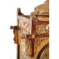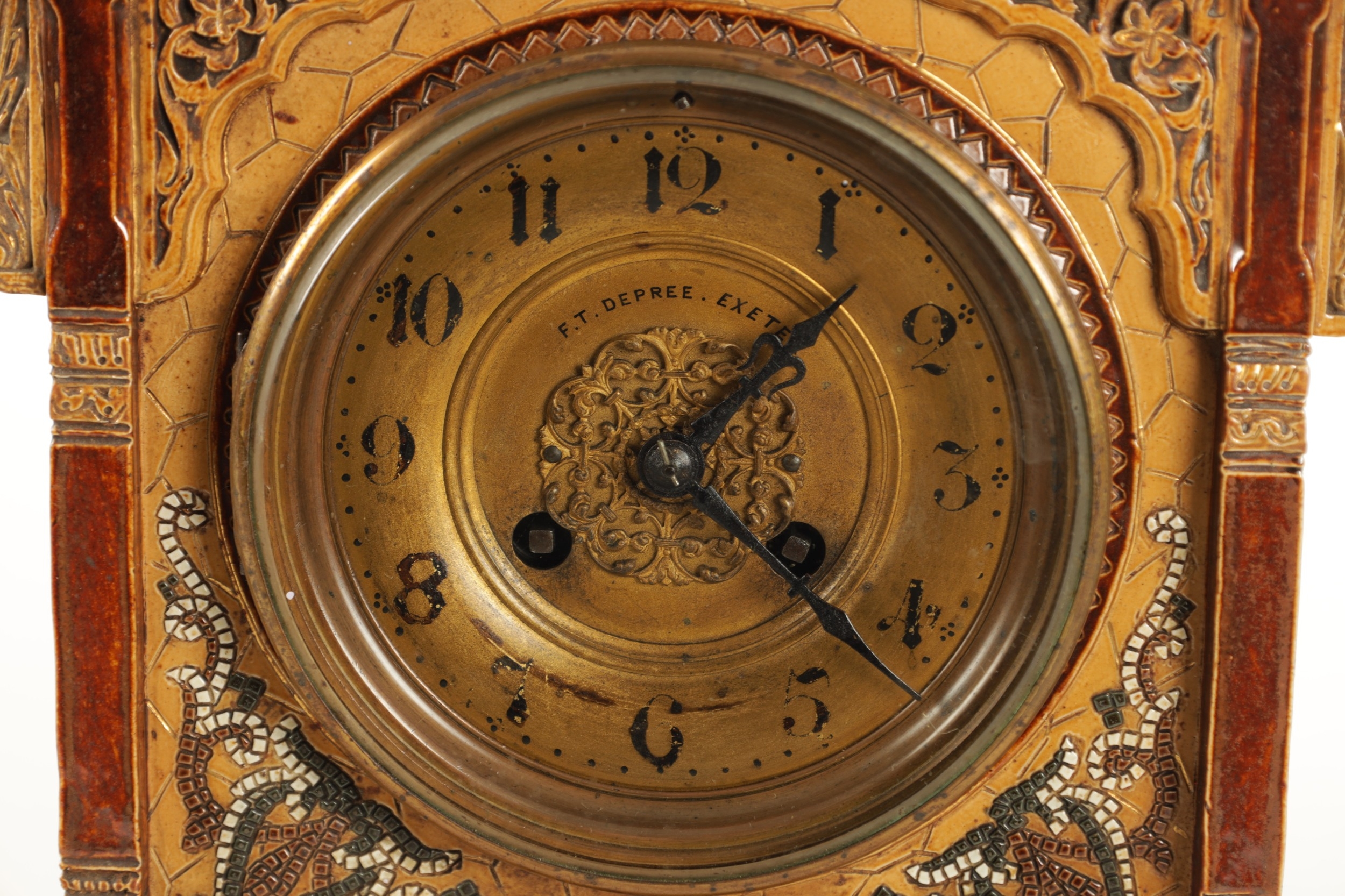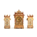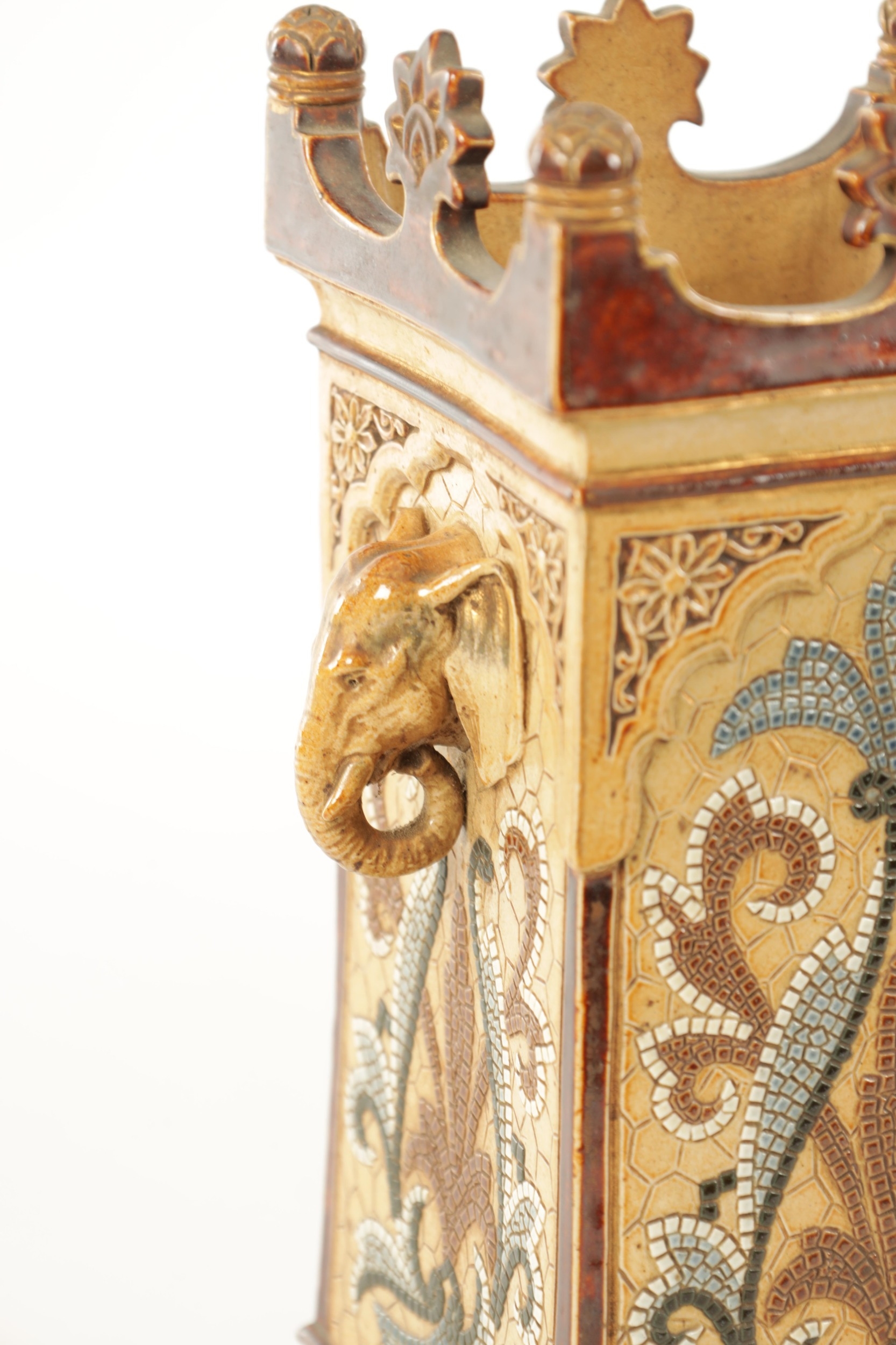 A LATE 19TH CENTURY DOULTON LAMBETH CLOCK GARNITURE the aesthetic designed case with micro mosaic style decoration and impressed maker's marks enclosing a 4" gilt brass dial with Arabic numerals fronting an eight day spring driven movement striking the hours/half hours on a gong, the matching garniture vases with elephant mask handles, impressed marks to the undersides. (41cm high)