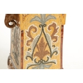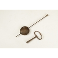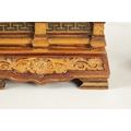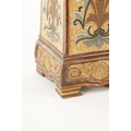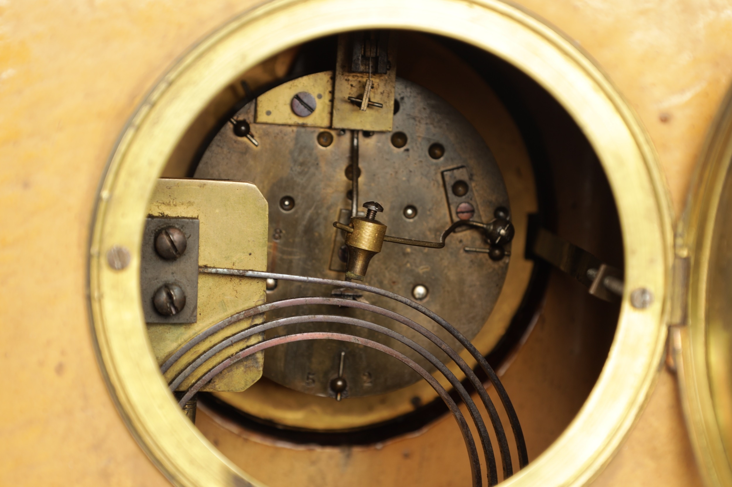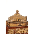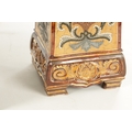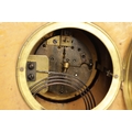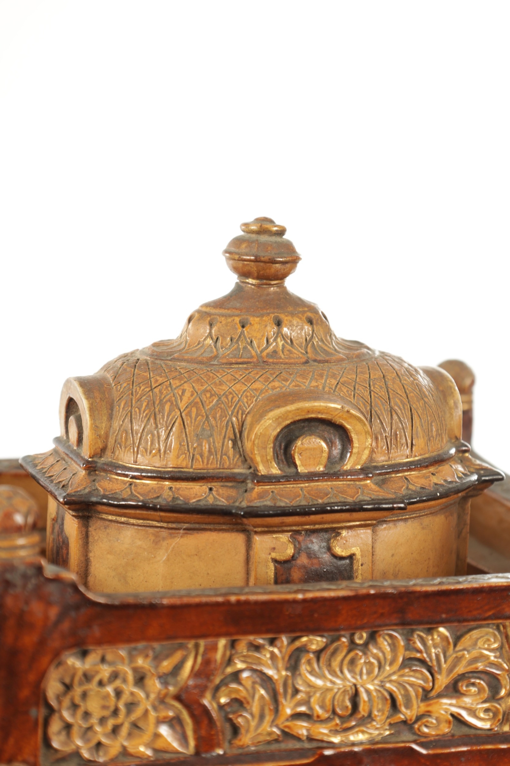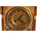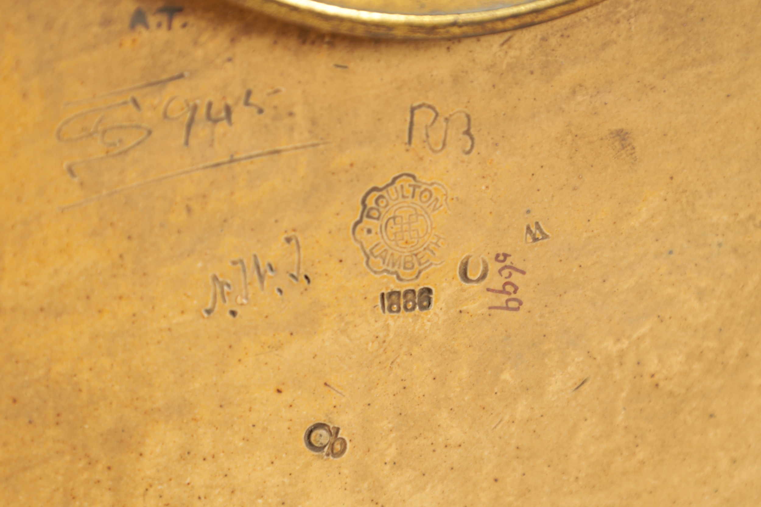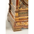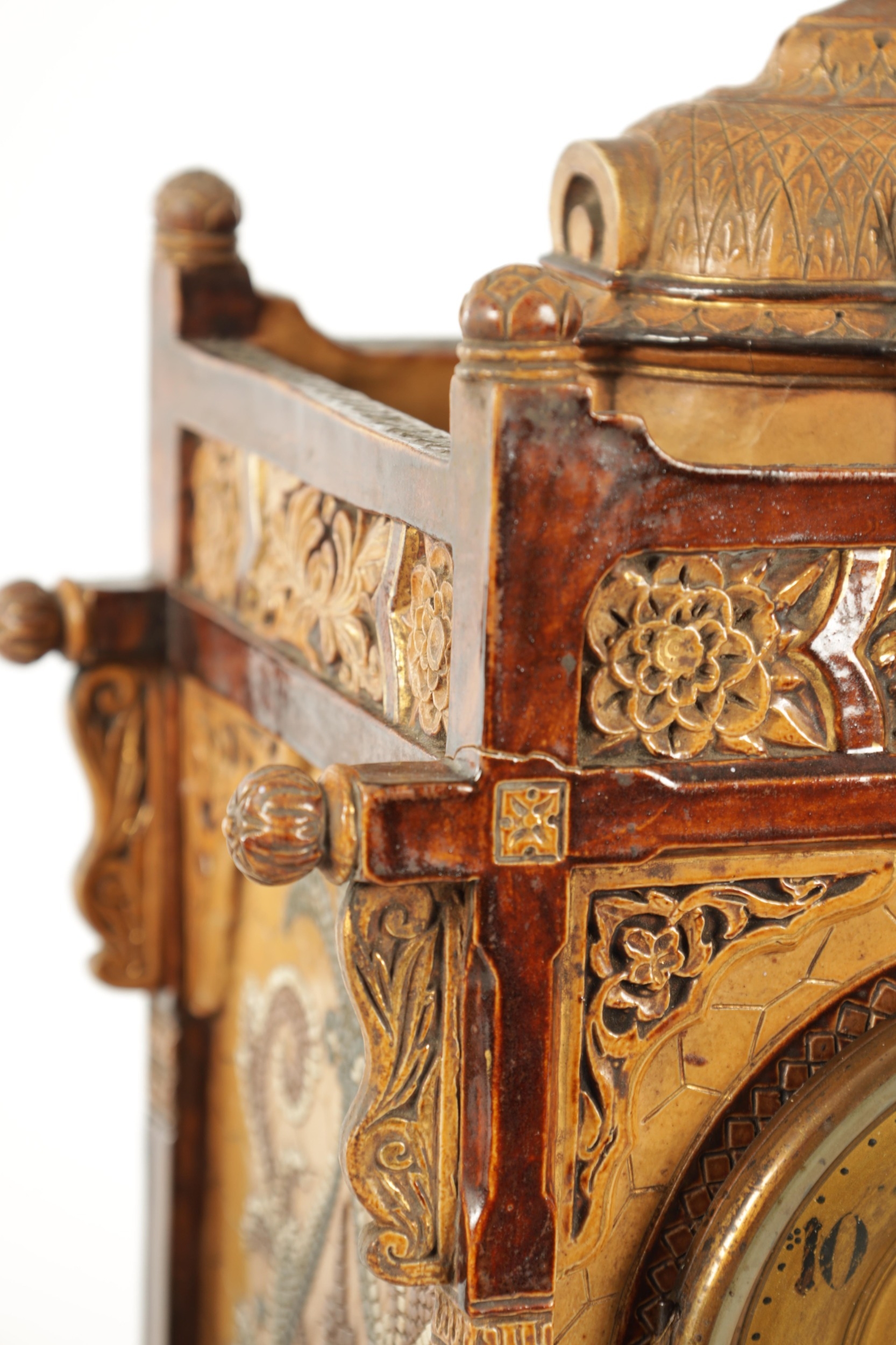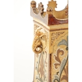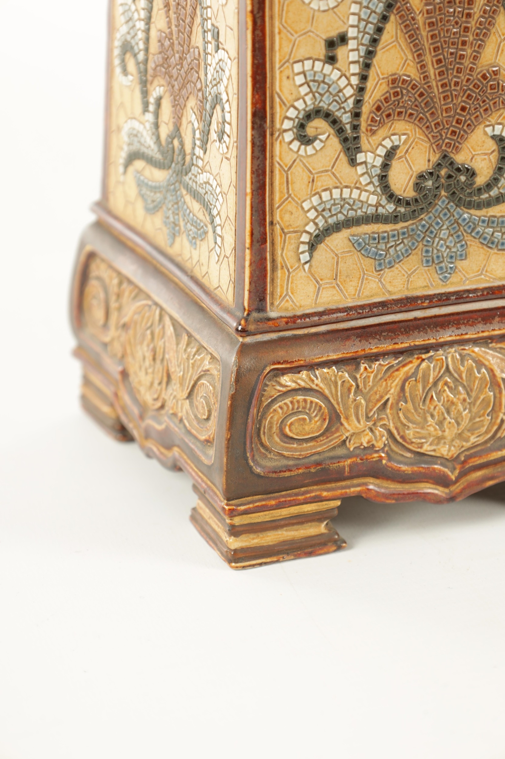 A LATE 19TH CENTURY DOULTON LAMBETH CLOCK GARNITURE the aesthetic designed case with micro mosaic style decoration and impressed maker's marks enclosing a 4" gilt brass dial with Arabic numerals fronting an eight day spring driven movement striking the hours/half hours on a gong, the matching garniture vases with elephant mask handles, impressed marks to the undersides. (41cm high)