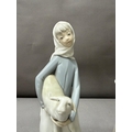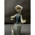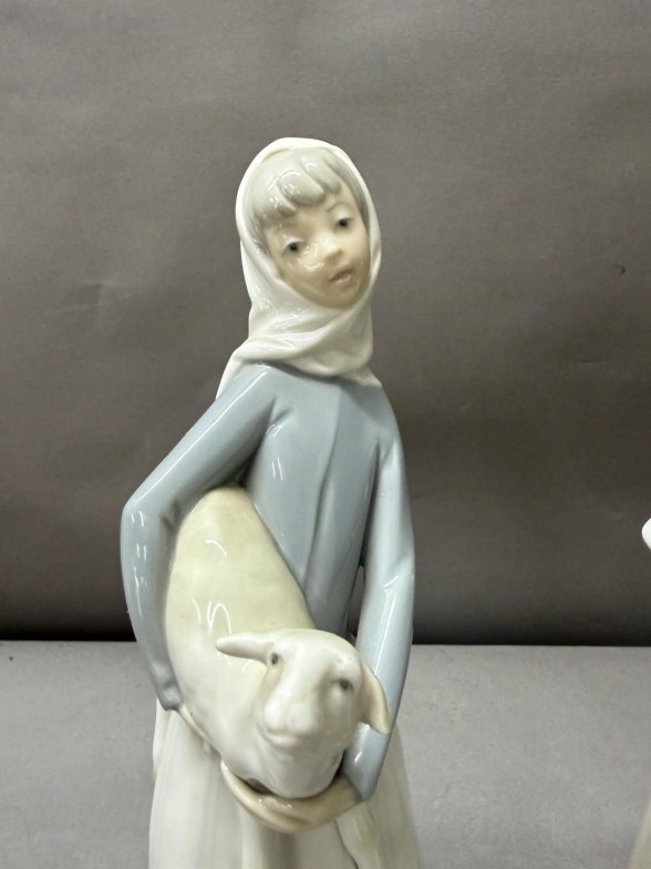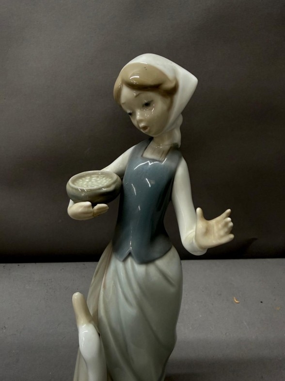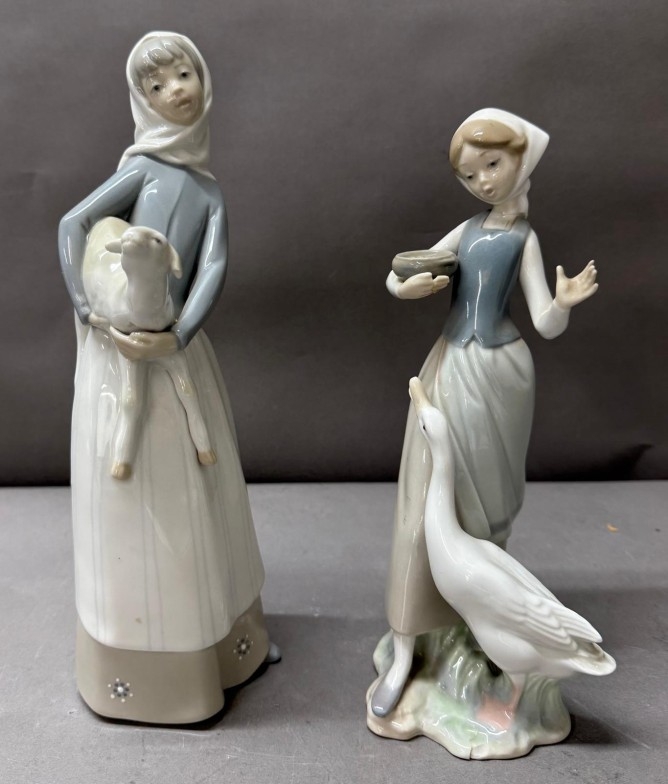 Two Lladro porcelain figures one of a girl with a lamb the other of a girl with a goose. Tallest approximately 23cm high.