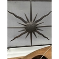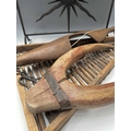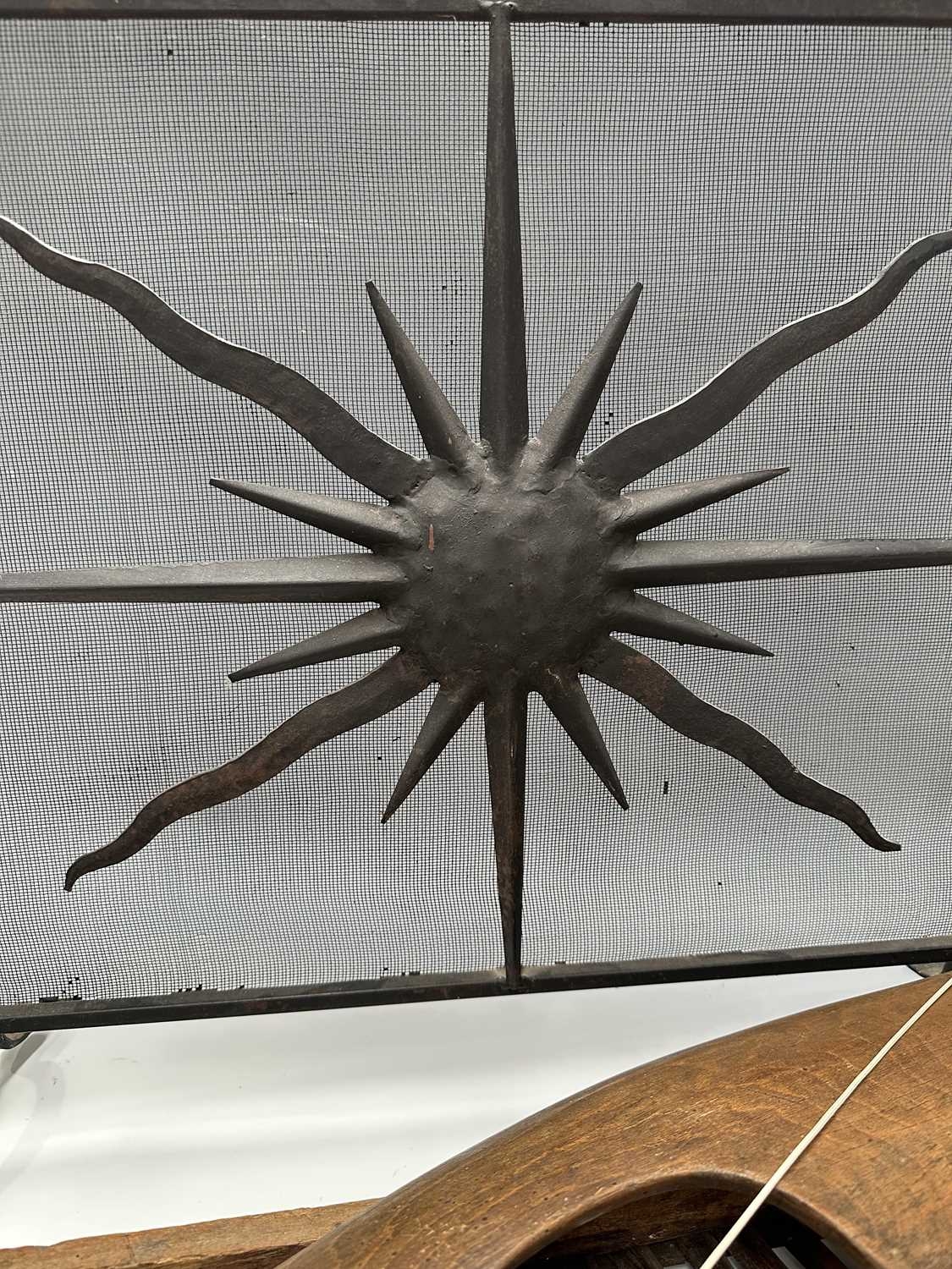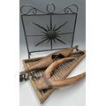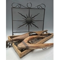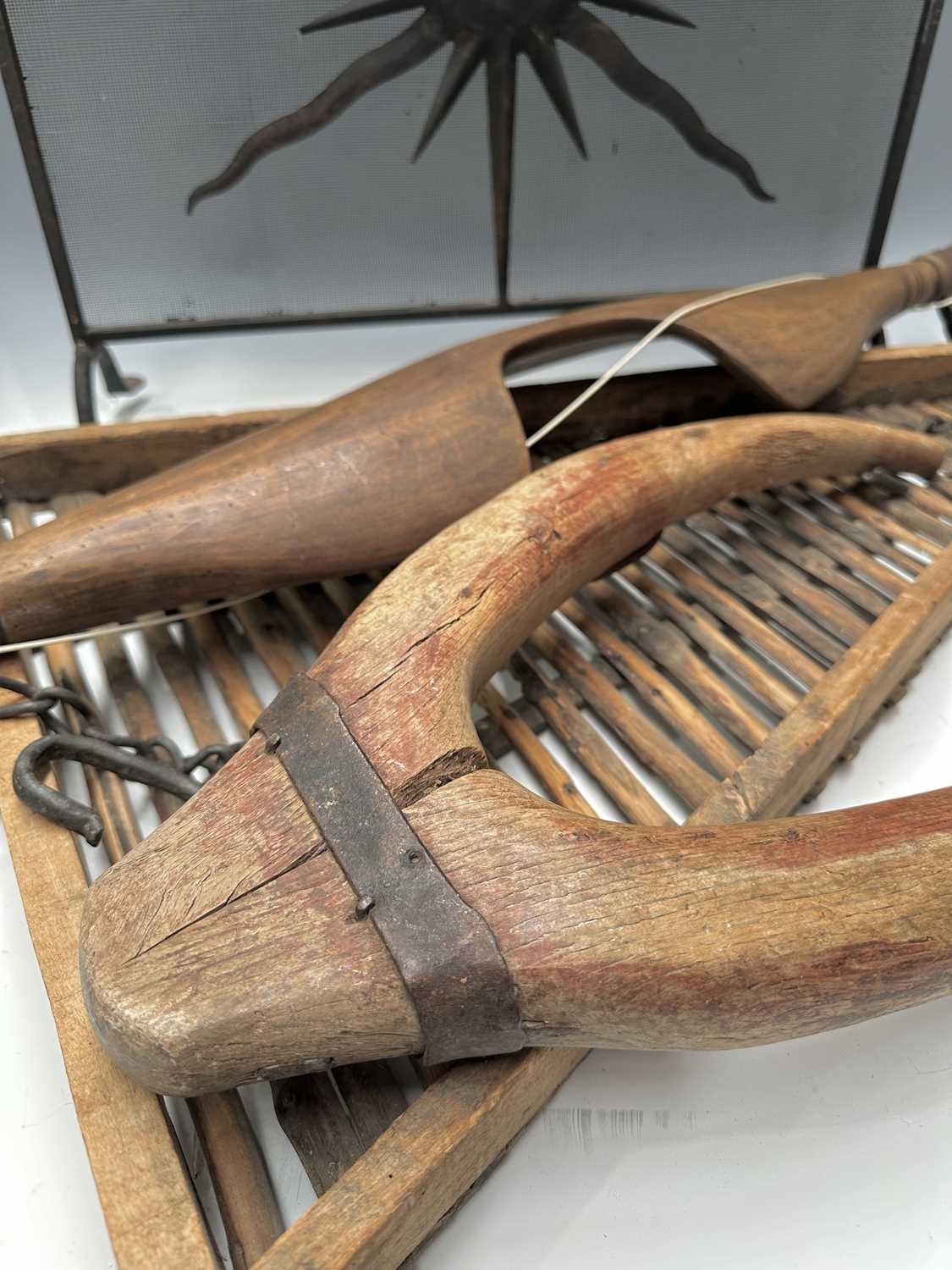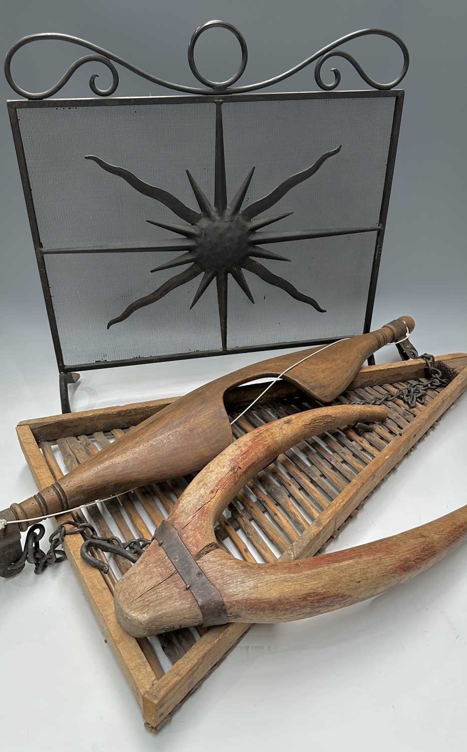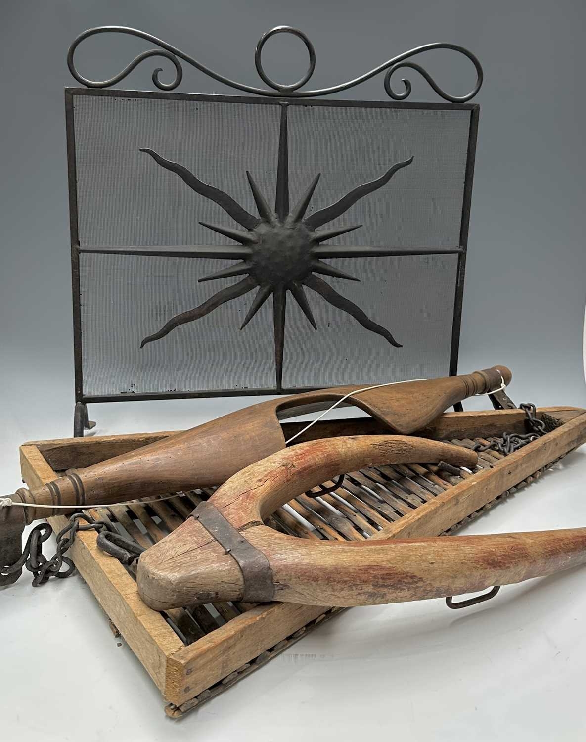 A black painted fire screen, wrought iron frame with central sunburst, scrolled top, height 62cm, width 60cm, a triangular continental wooden fruit drying rack or 'Claie à prunes', height 81cm, together with a wood and iron dairymaids shoulder yoke, and a donkey yoke (4)