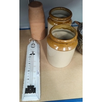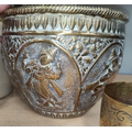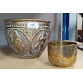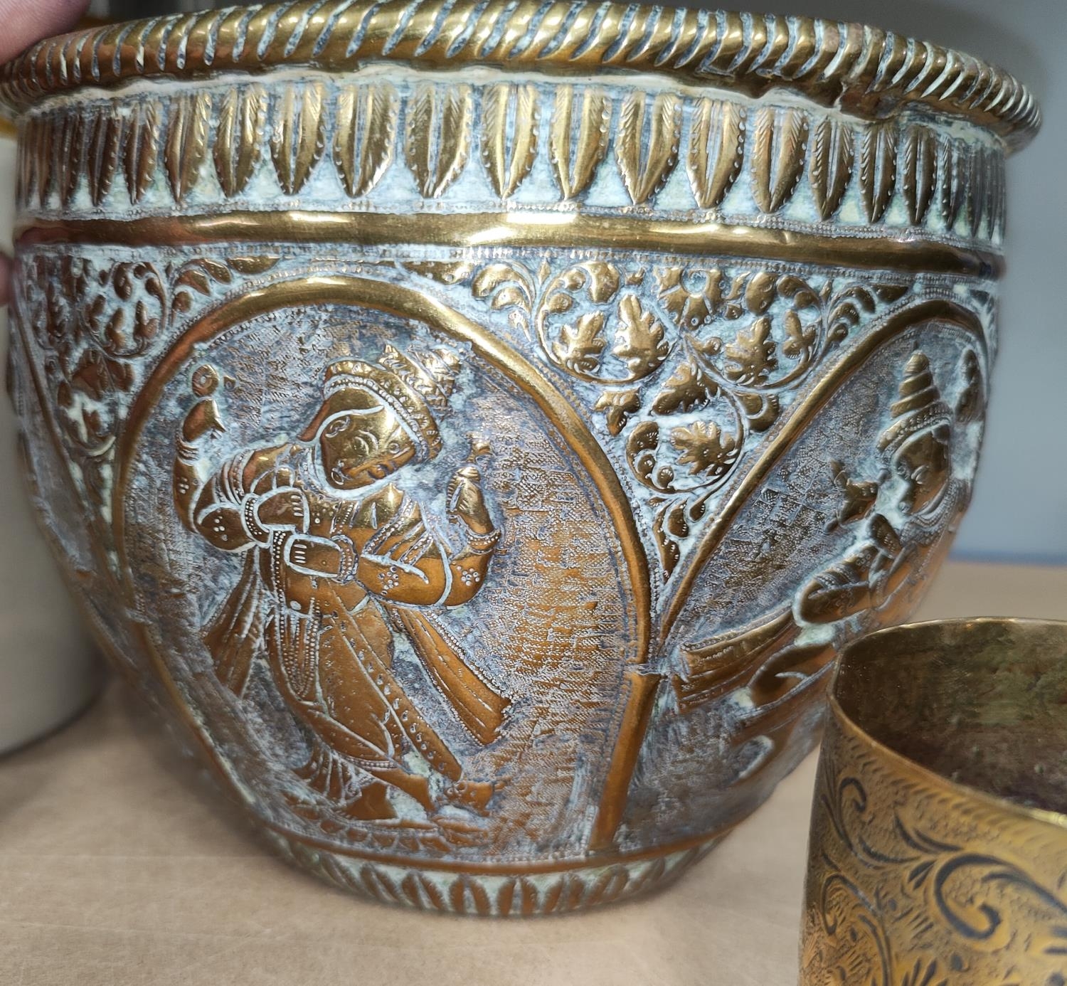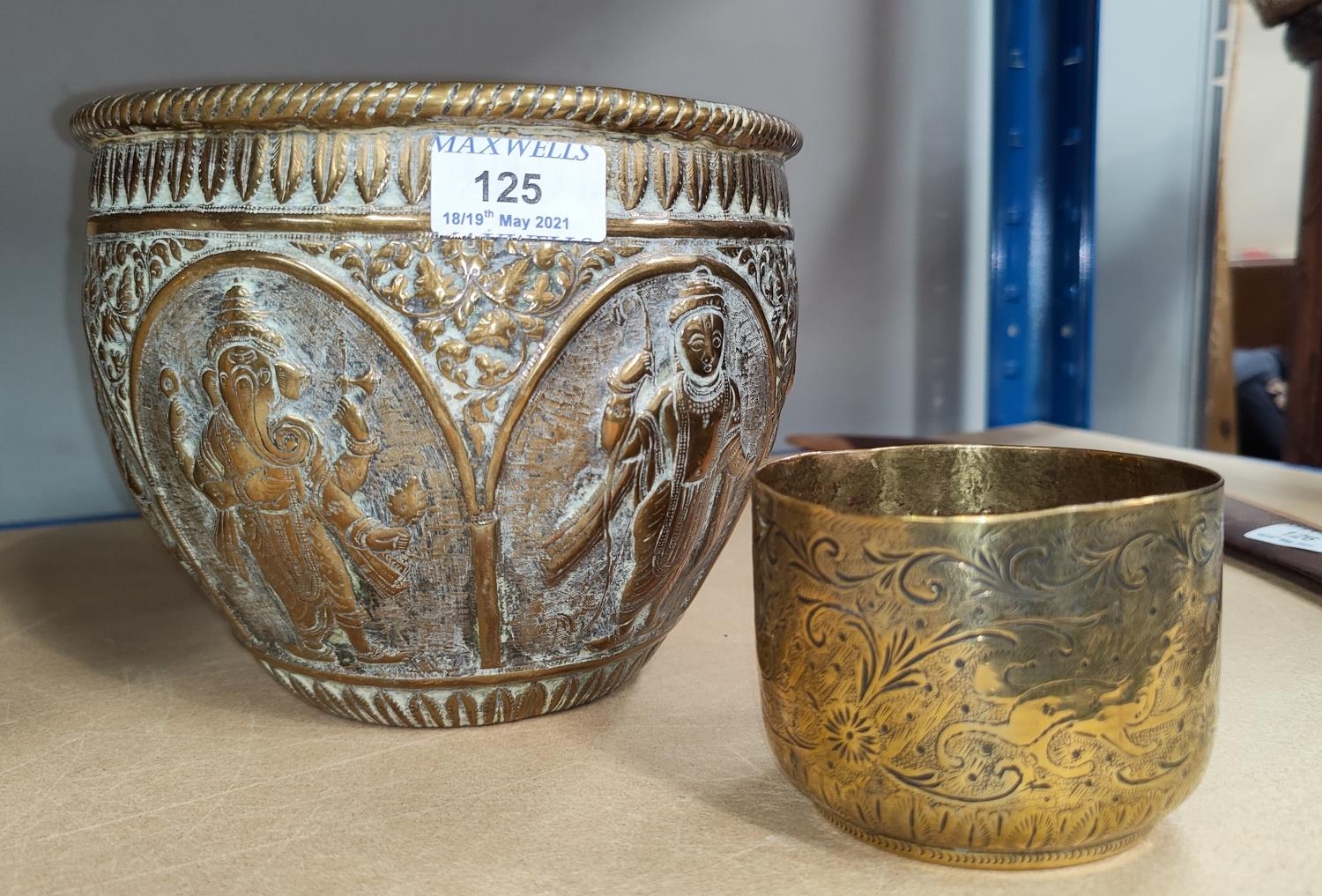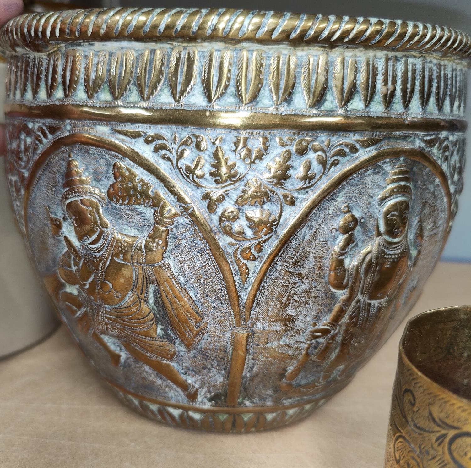 An Indian brass jardinière with paneled decoration in relief of Hindu gods. H: 16cm, Diameter: 20cm; + a similar small brass item.