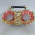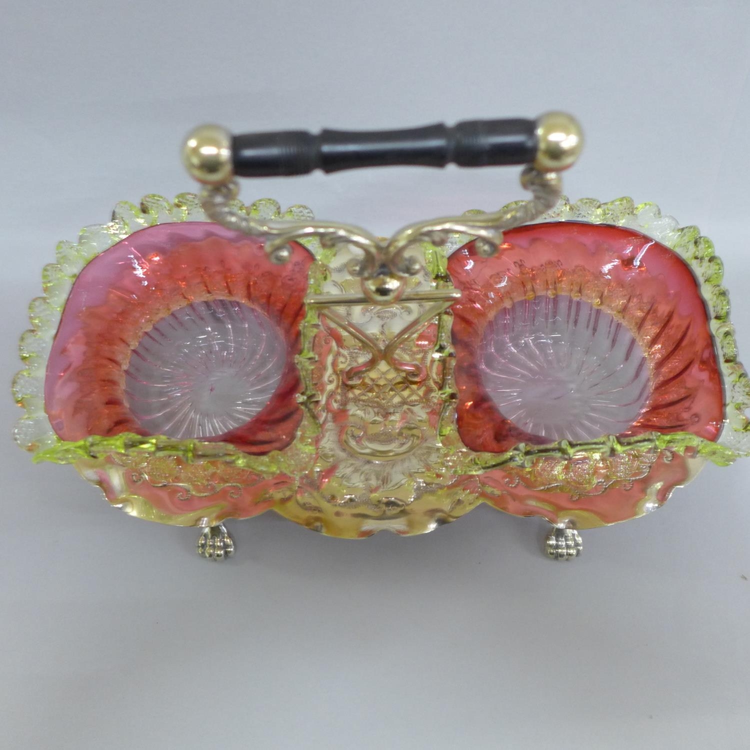 A Victorian double sweet dish circa 1890, EPNS frame with cranberry and vaseline glass frilly edge