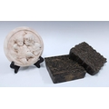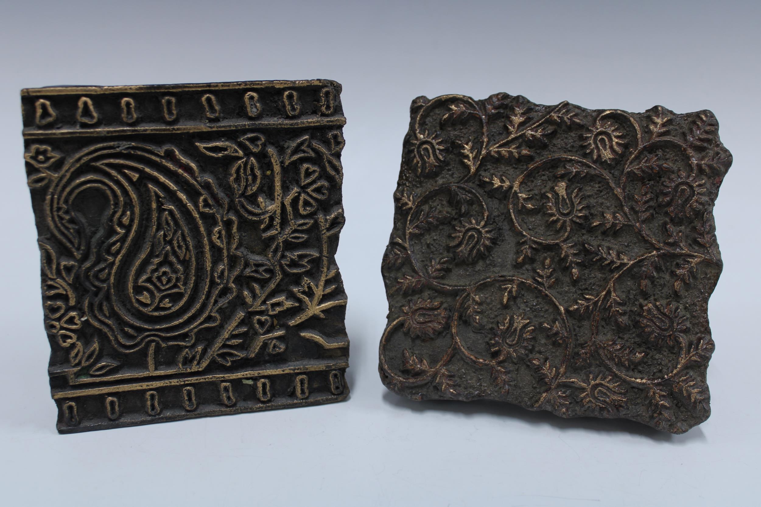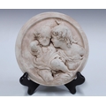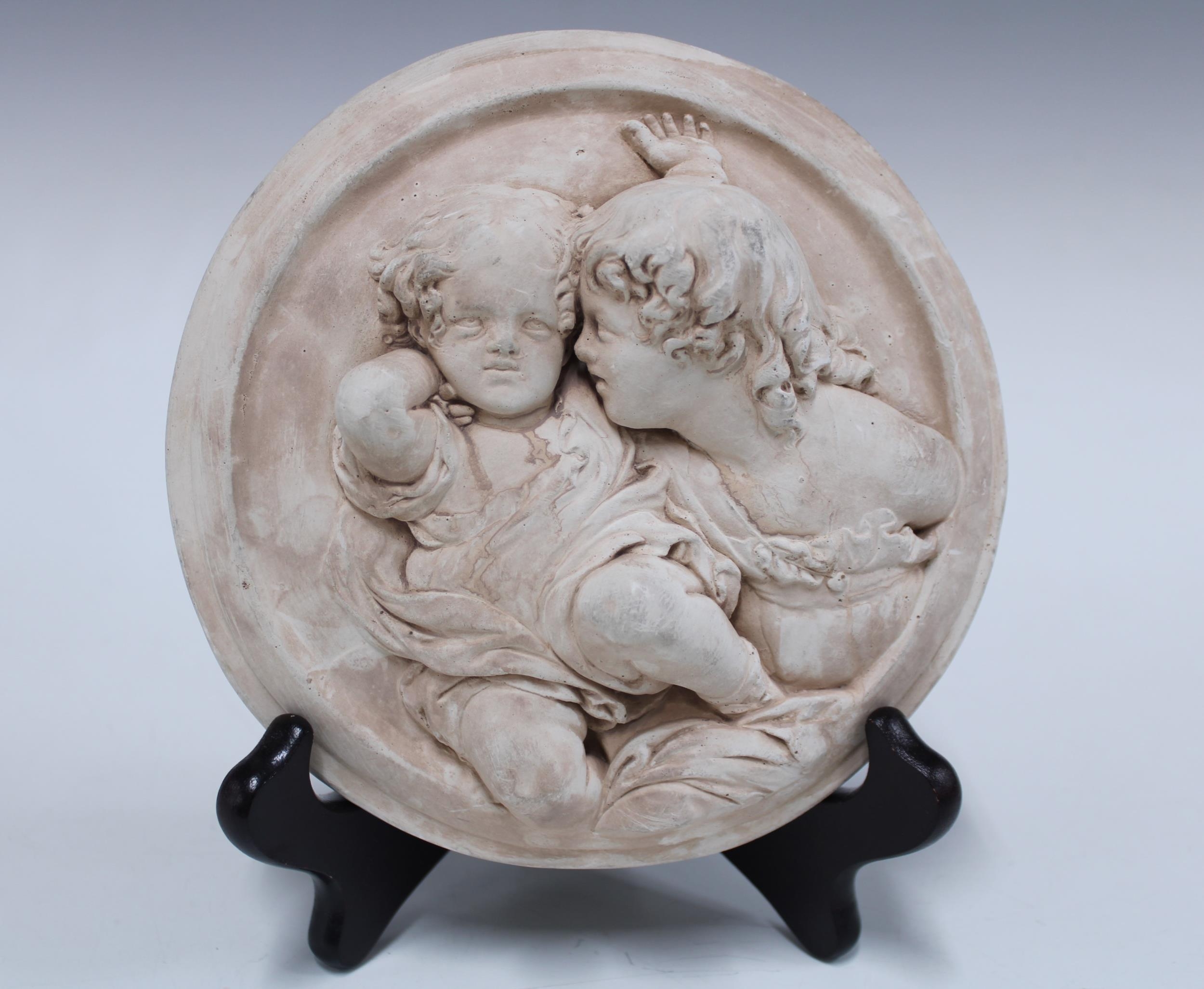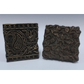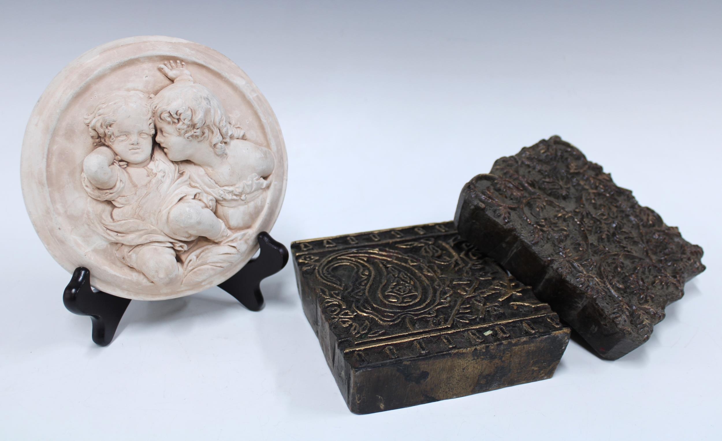 Two wooden pattern stamp blocks, larger 15cm, together with a plaster wall plaque of a baby and child (3)