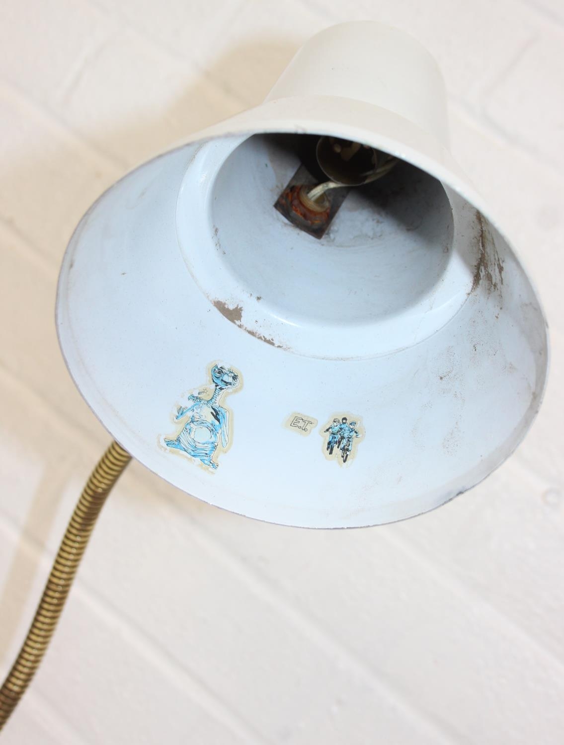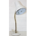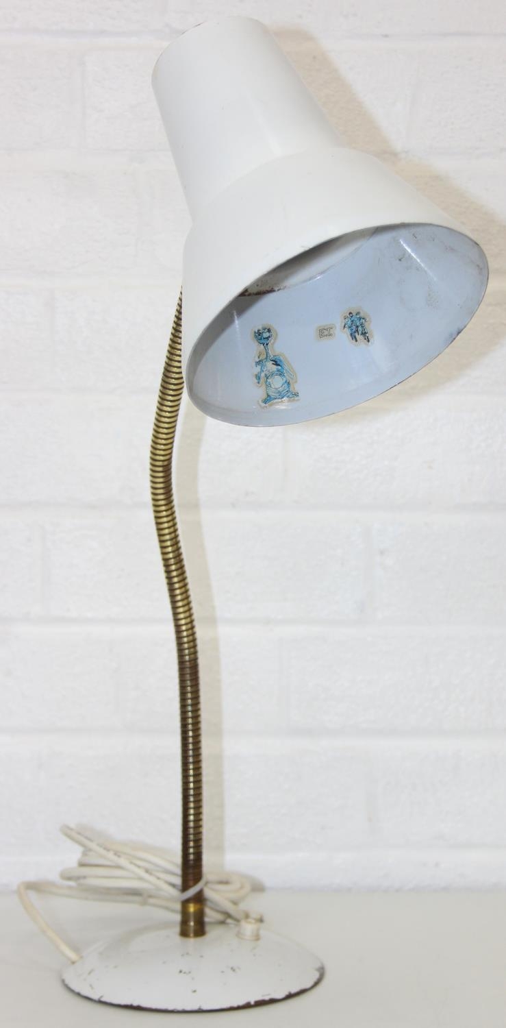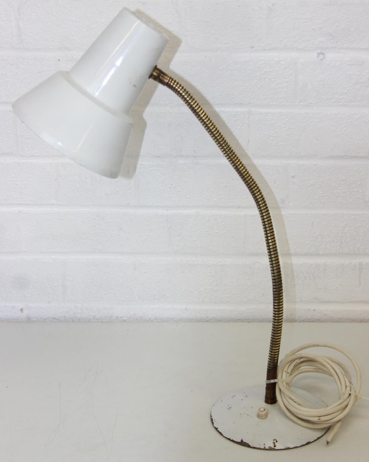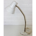 A retro desk lamp with white metal shade and adjustable swan neck support, mid-century, 52cm tall in photo