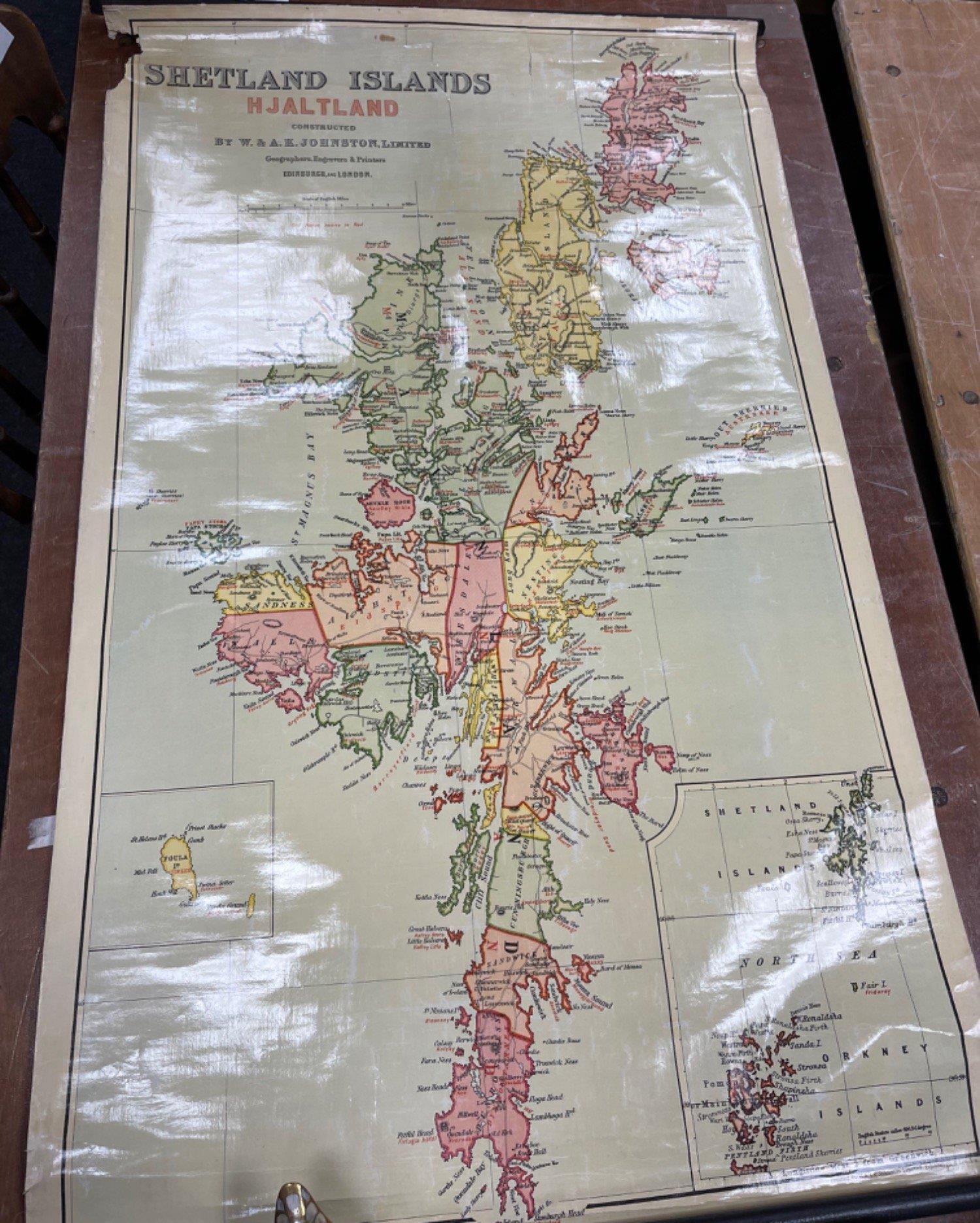 VINTAGE EDUCATIONAL Johnston (Geographers Engravers and Printers) wall map of SHETLAND ISLANDS HJALTLAND 42" height x 26"wide