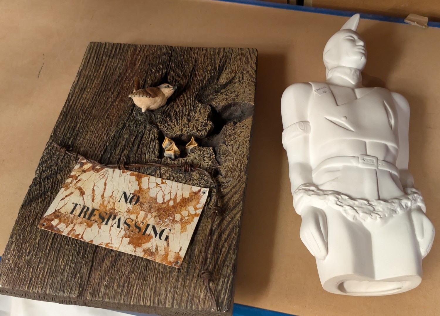 An Art Deco brass desk lamp, pair of Indian clubs and a stylised figure of a chained man.