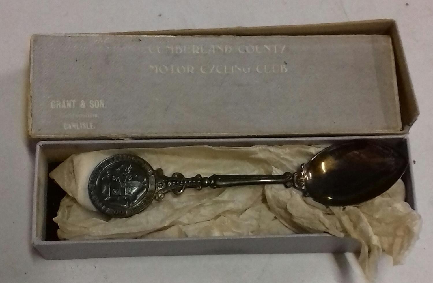 VS Birmingham hallmarked silver presentation spoon in original box - Cumberland County motor cycling club