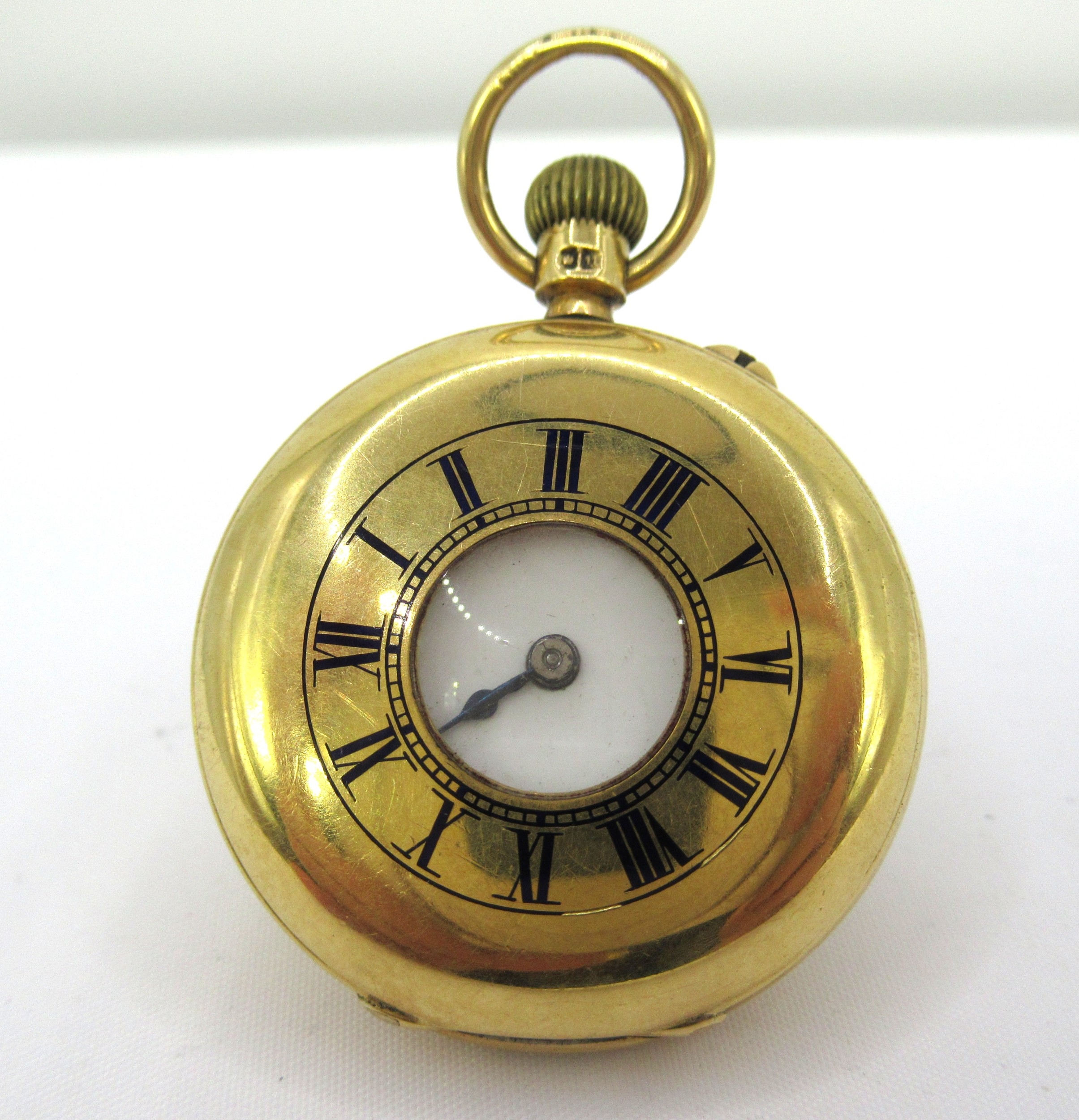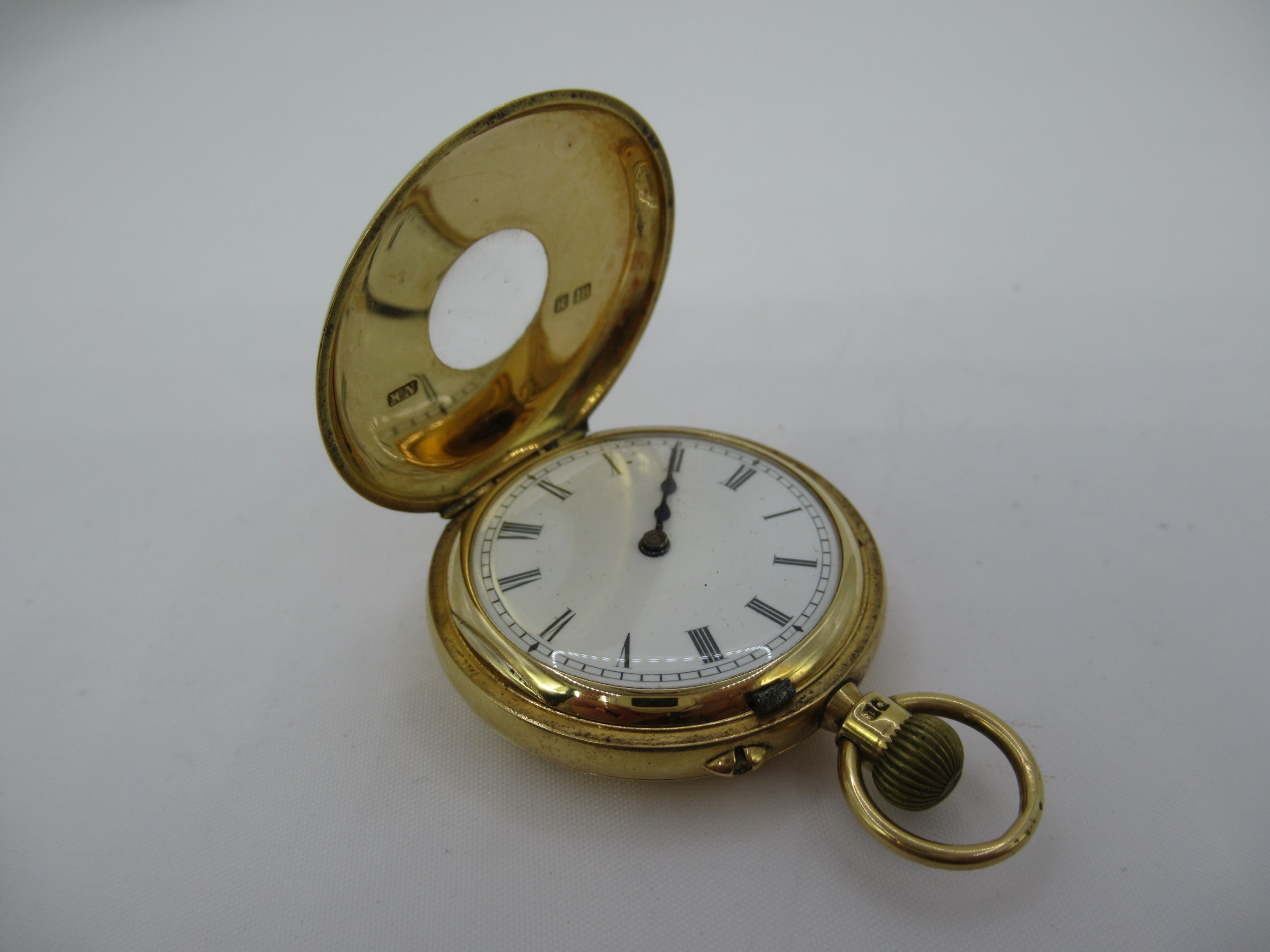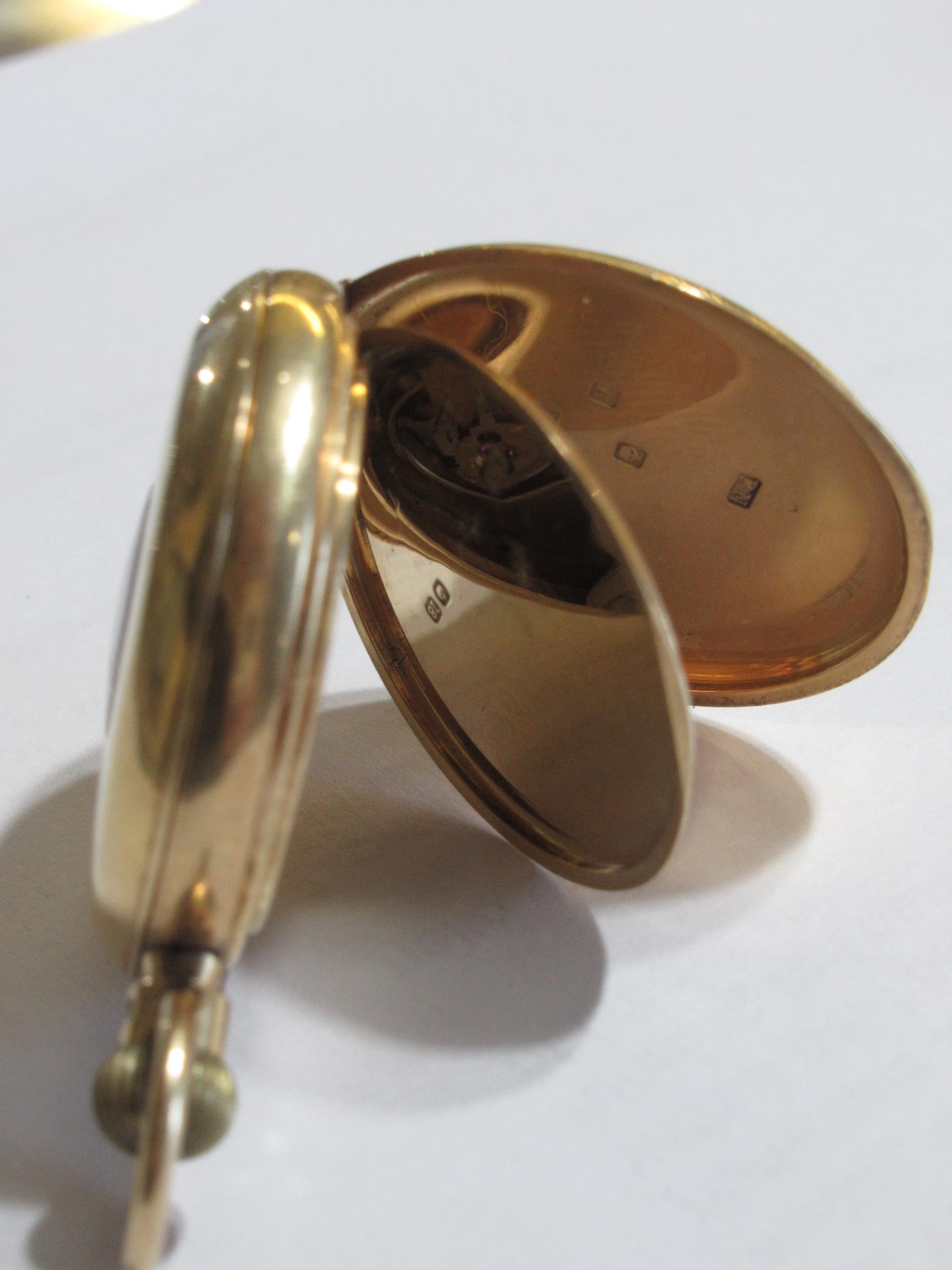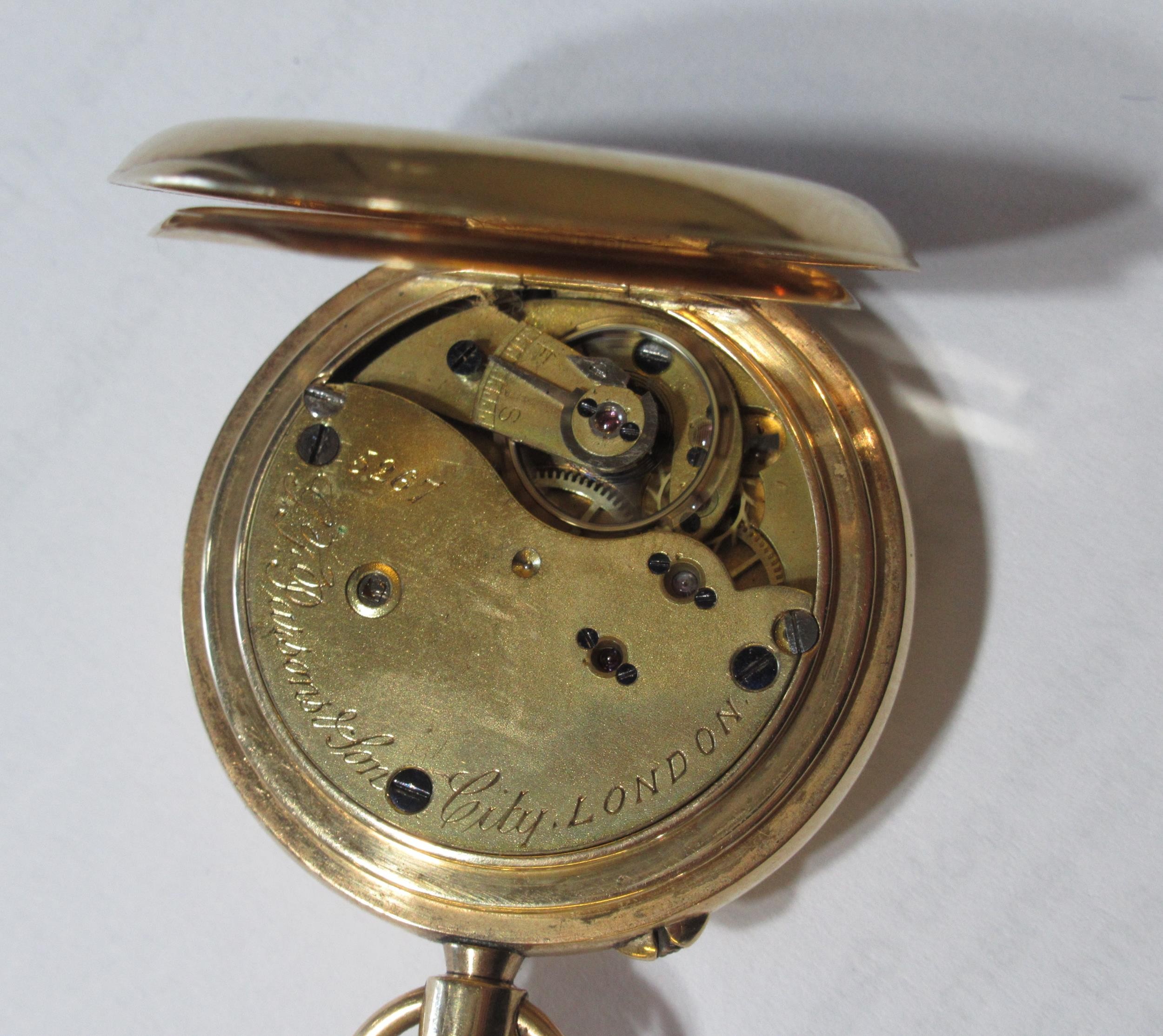 18ct Gold half hunter fob watch with a crown wind movement inscribed Parsons & Son, London, overall diameter 33mm, gross weight 44.1g