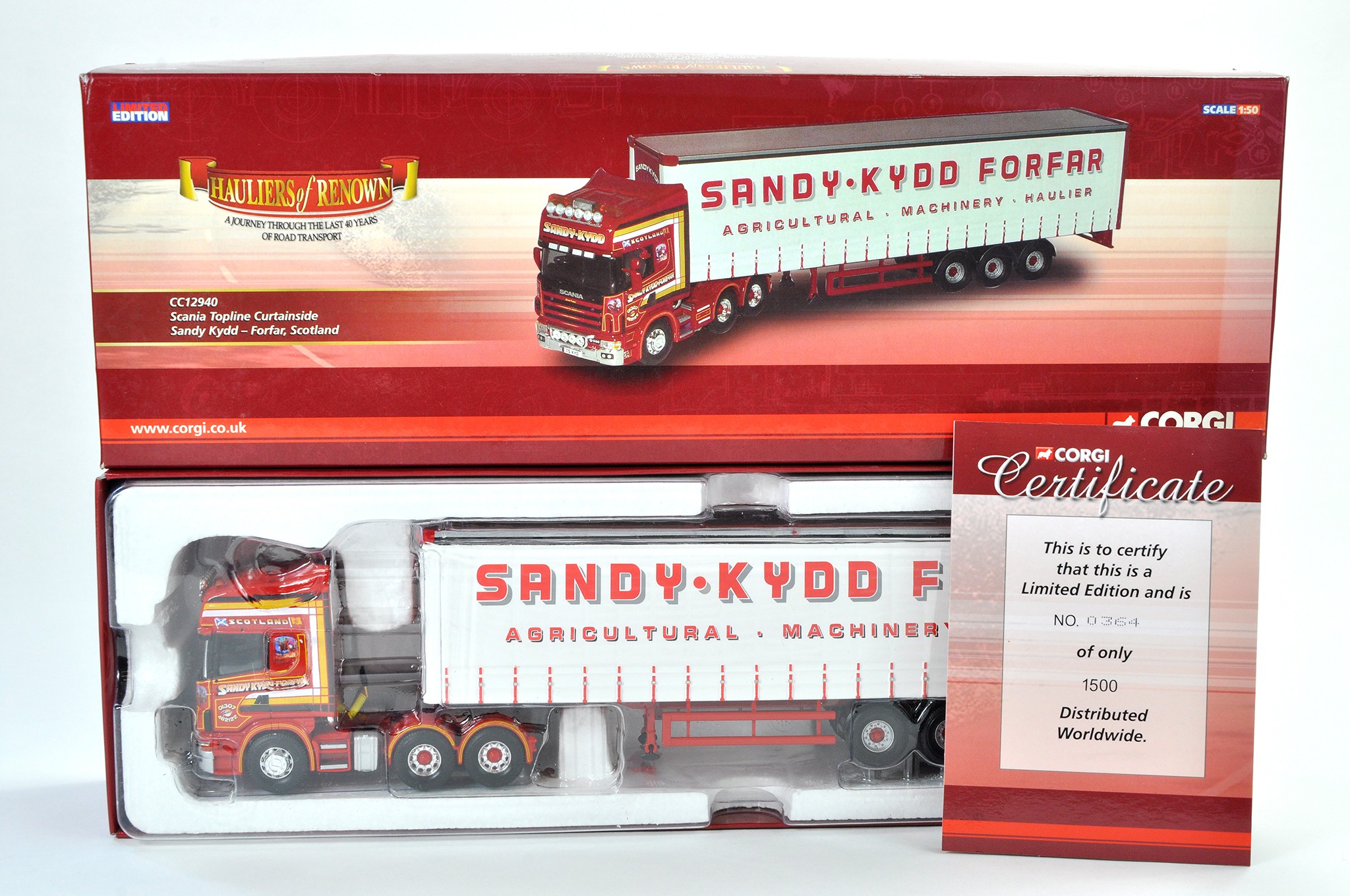 Corgi Diecast Model Truck issue comprising No. CC12940 Scania Topline Curtainside in the livery of Sandy Kydd. Appears very good with mirrors and certificate, likely displayed so possibly some light cosmetic wear in places.