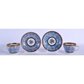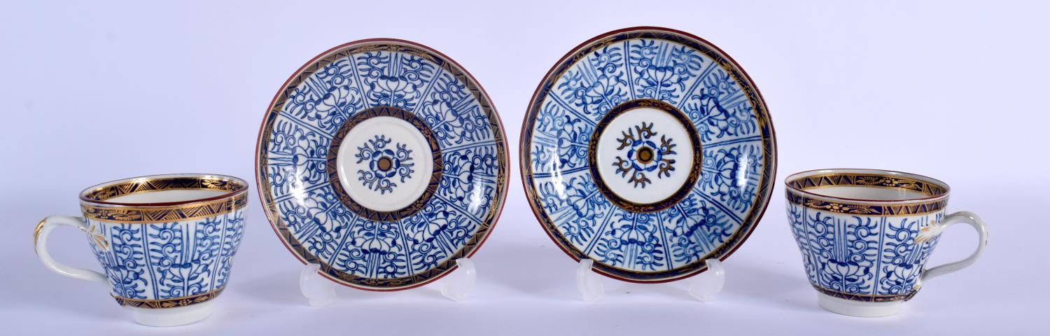 18TH C. WORCESTER PAIR OF COFFEE CUPS WITH ENTWINED HANDLES AND SAUCER PAINTED WITH ROYAL LILY, CRESCENT MARKS. 6.5cm high (2)