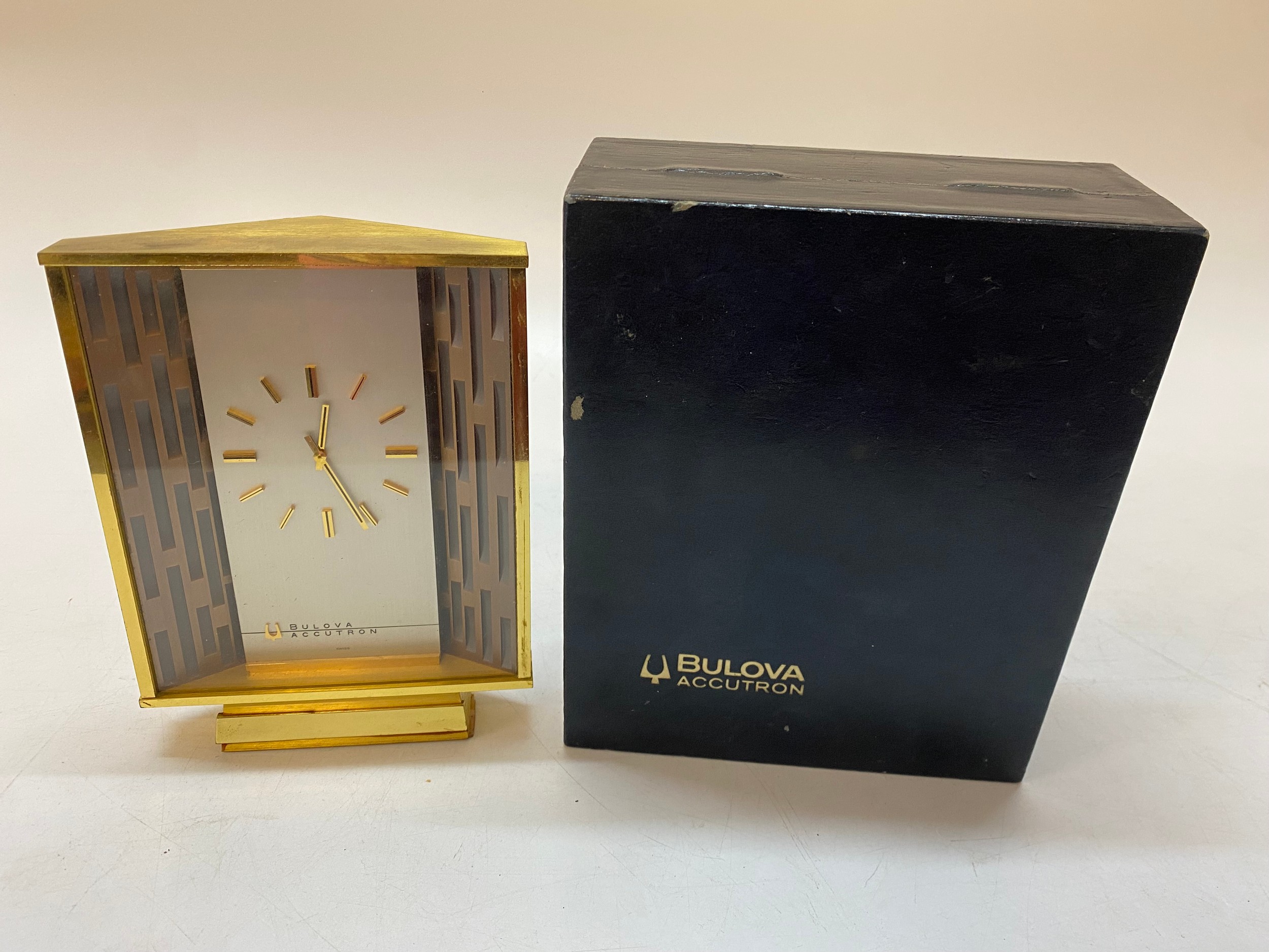 A Bulova Accutron clock in a brass case - 7in. high, in original box