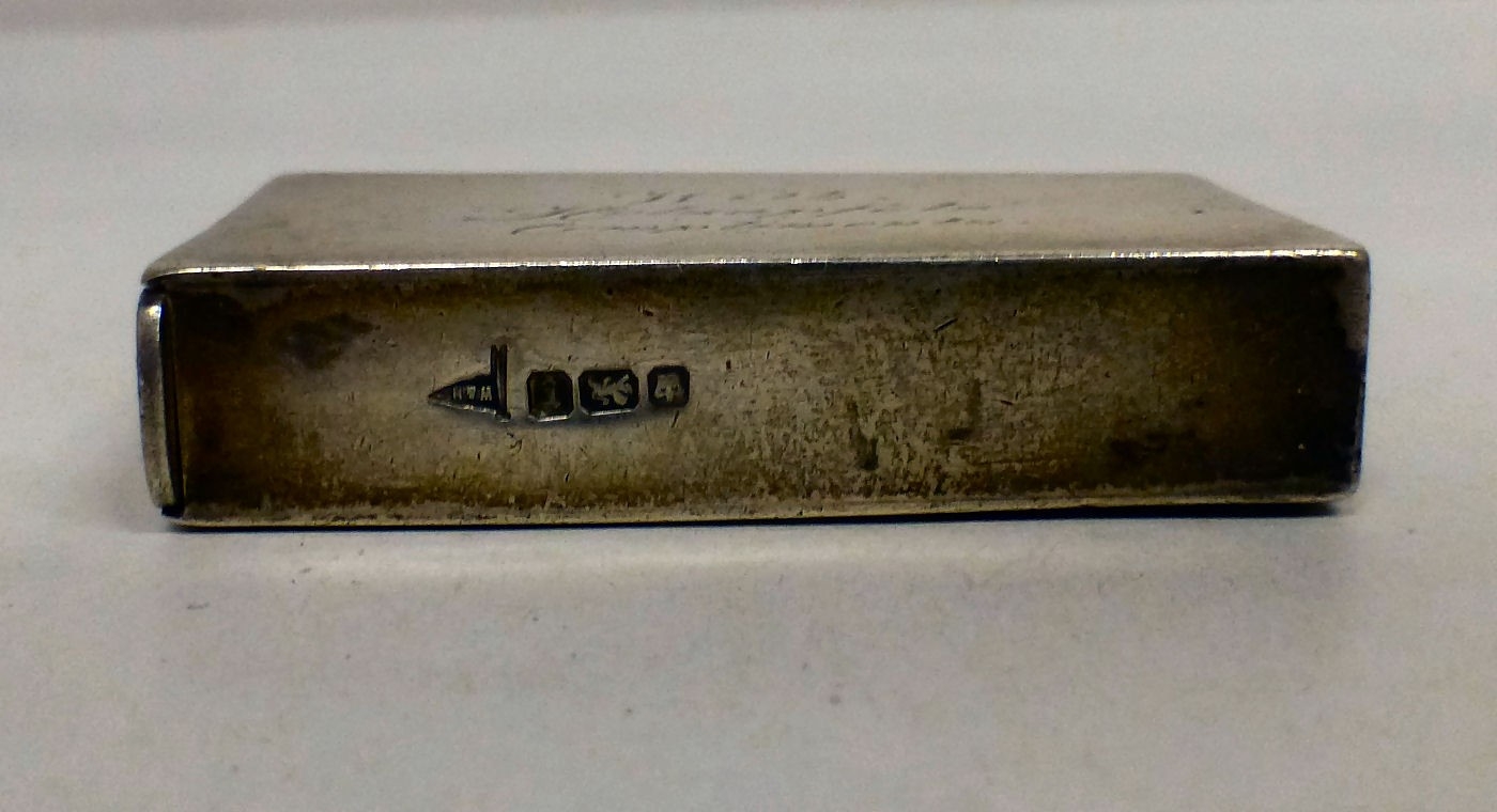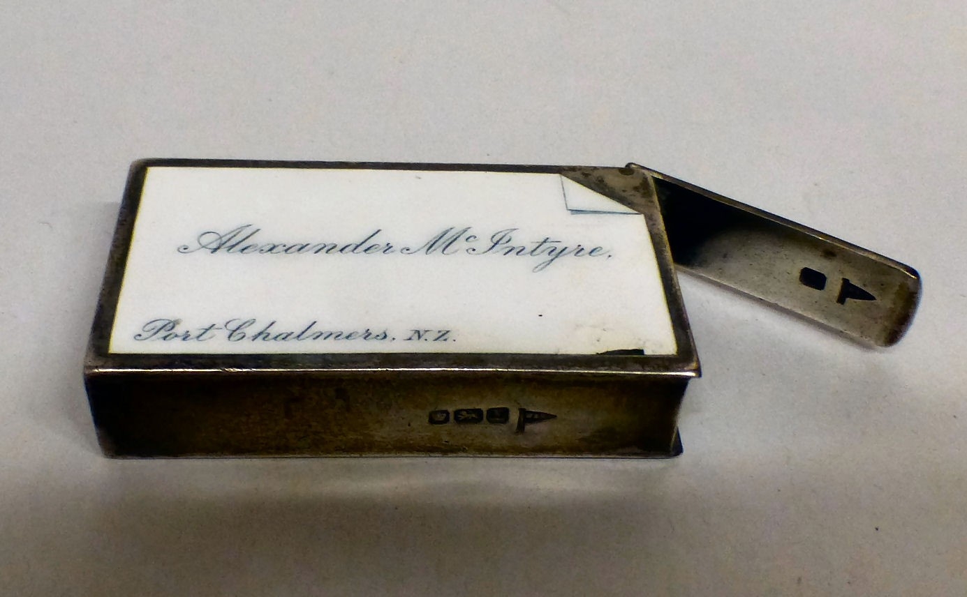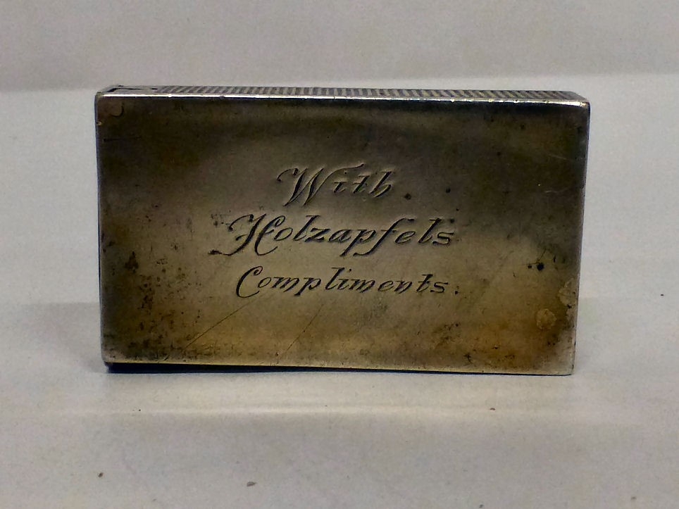 A silver vesta bears a named porcelain plaque for Alexander McIntyre and 'With Holzapjels Compliments' on the reverse Walker & Hall Sheffield 1909