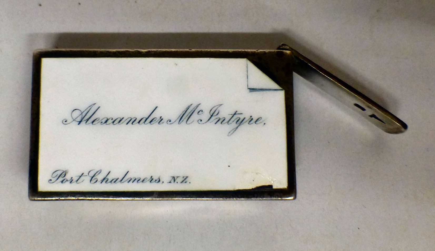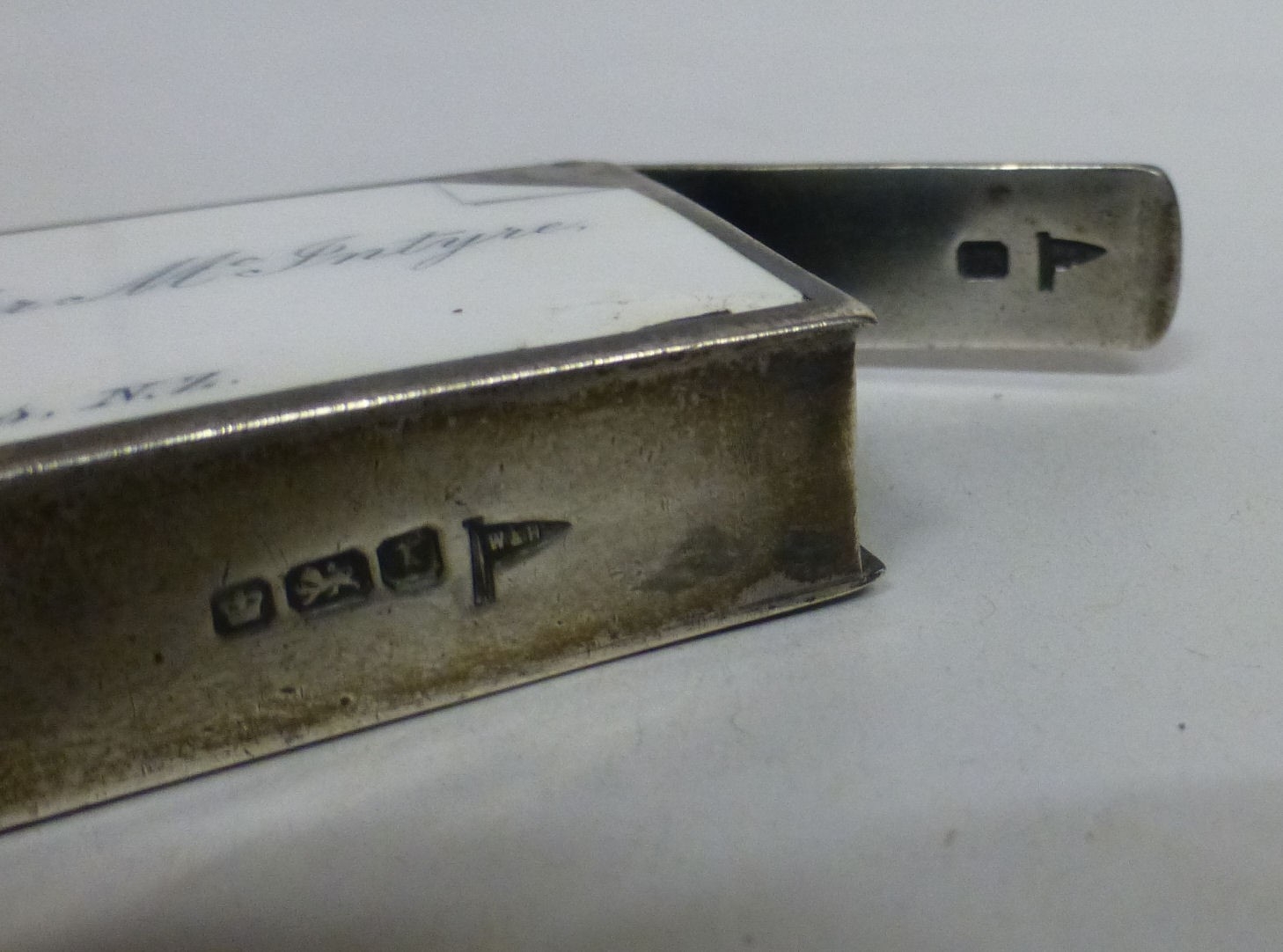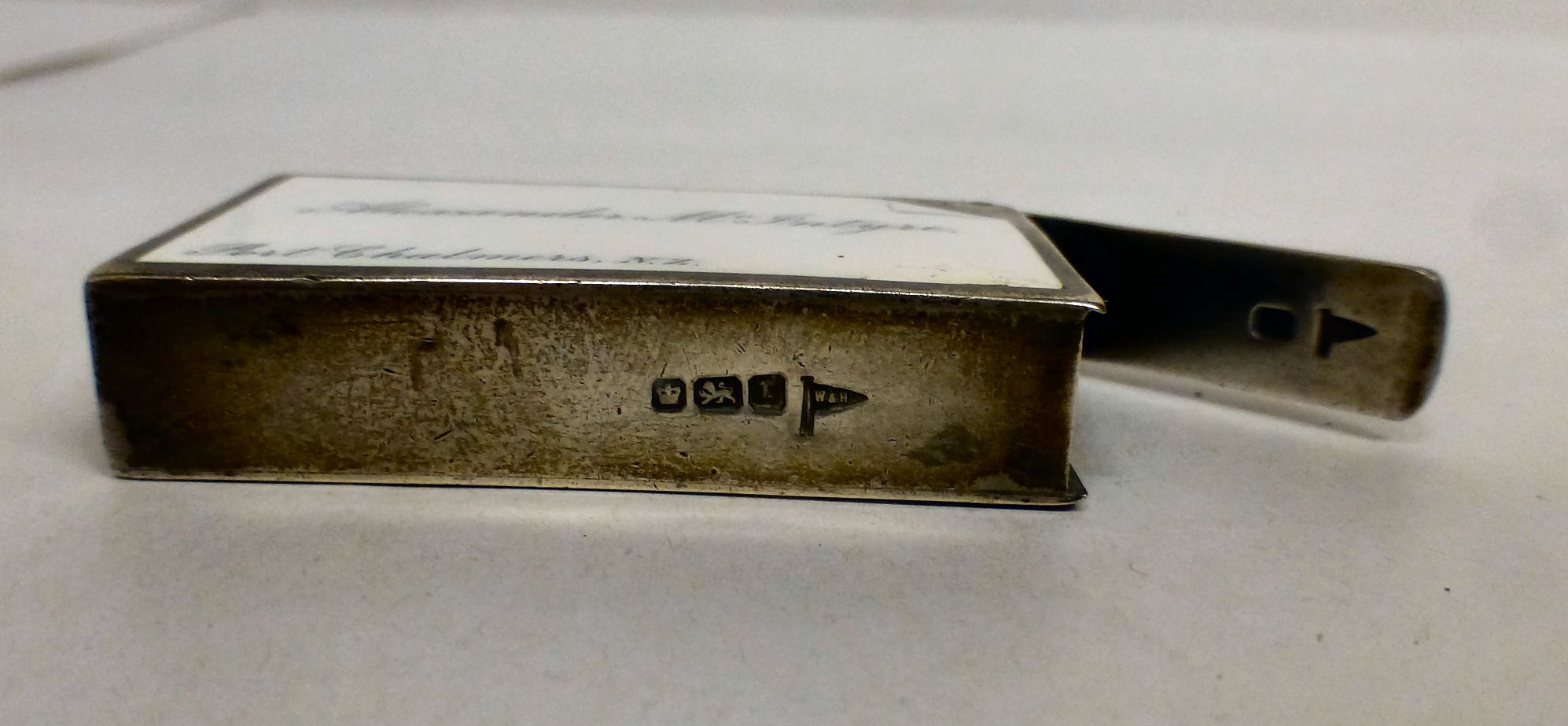 A silver vesta bears a named porcelain plaque for Alexander McIntyre and 'With Holzapjels Compliments' on the reverse Walker & Hall Sheffield 1909