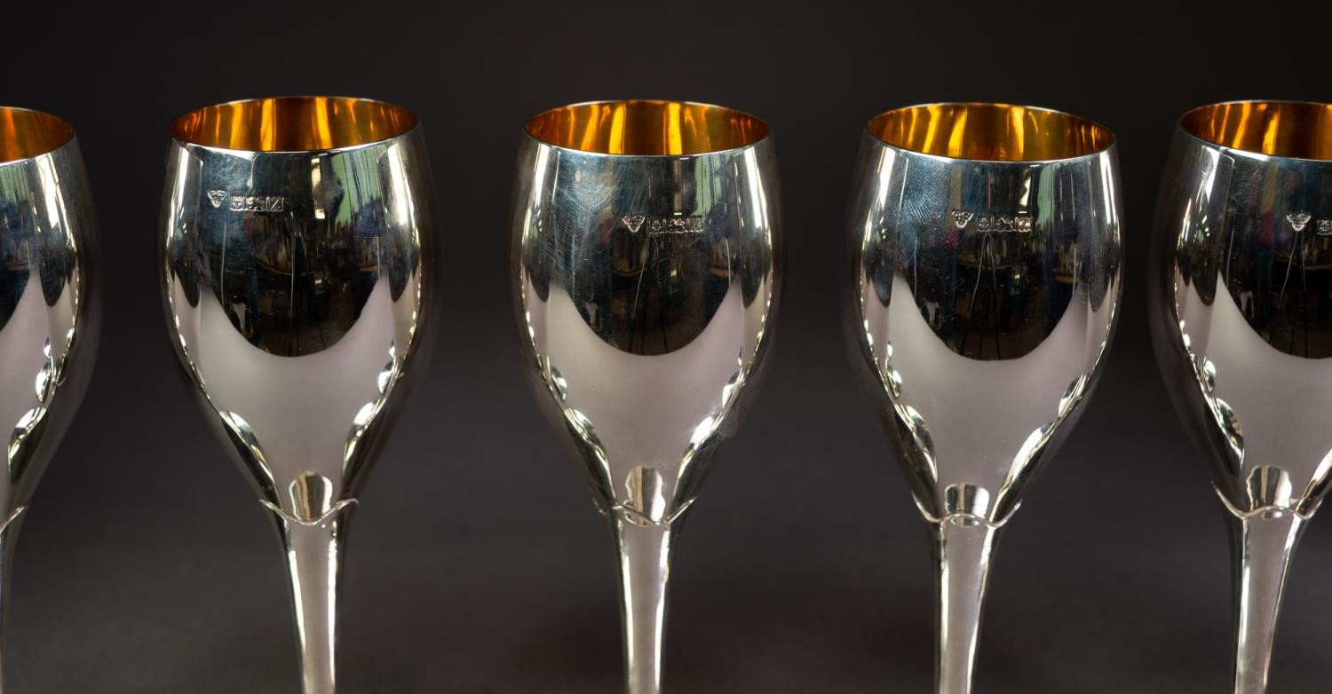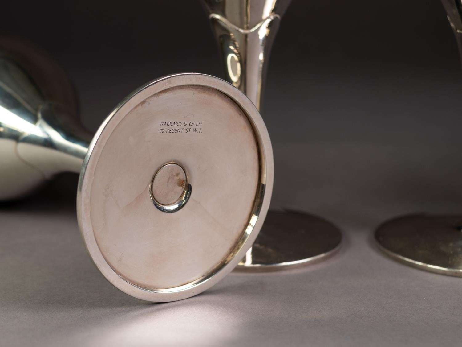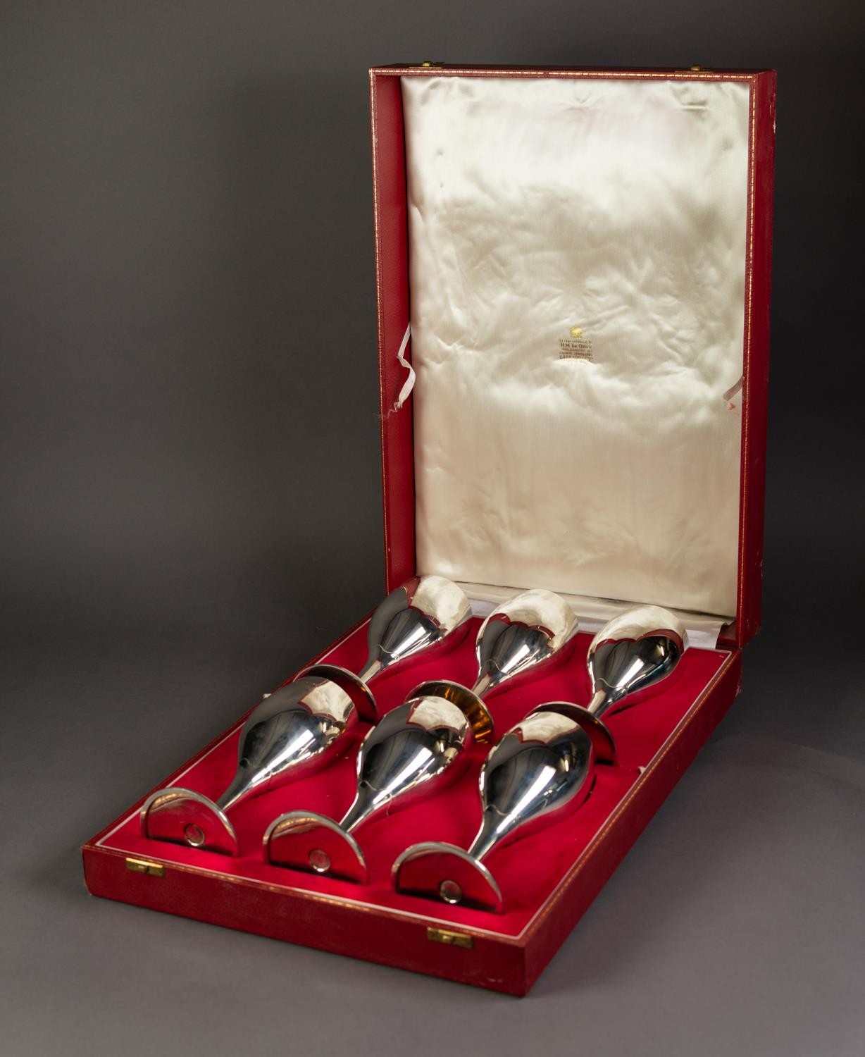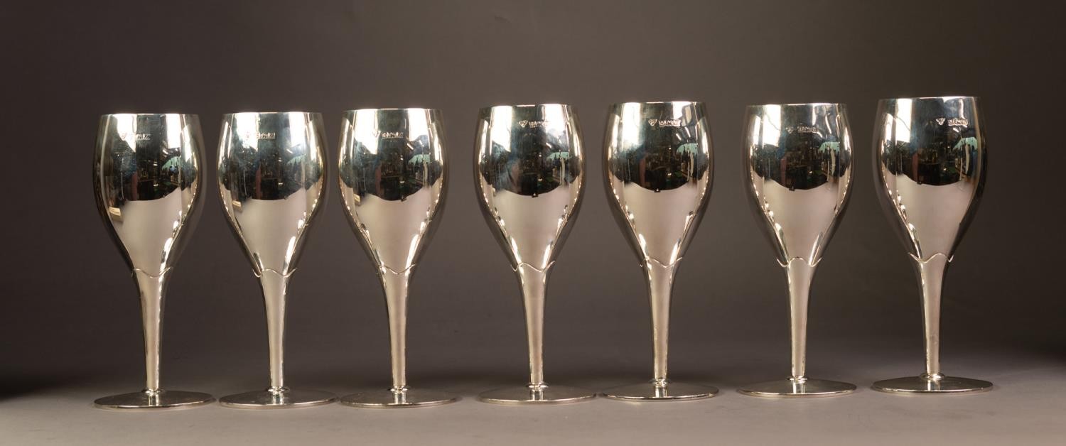 GARRARD & Co Ltd SET OF SEVEN SILVER GOBLETS, including: A CASED SET OF SIX, each of tulip form with gilt interiors and circular bases, 7 ½” (19cm) high, Birmingham 1974, 47oz, (7), the case a/f