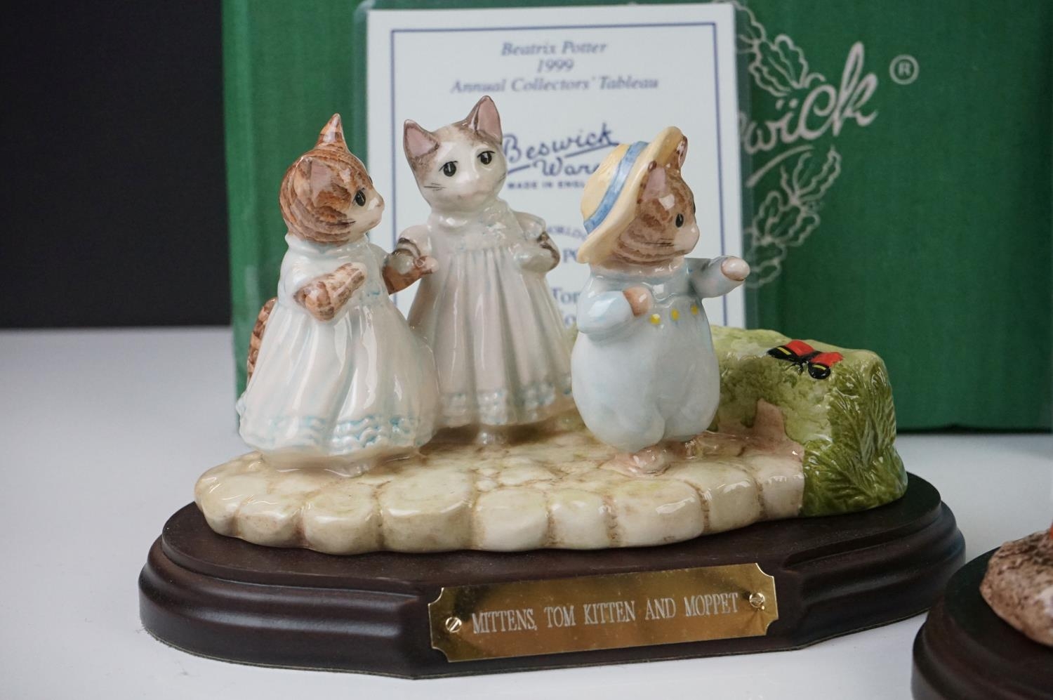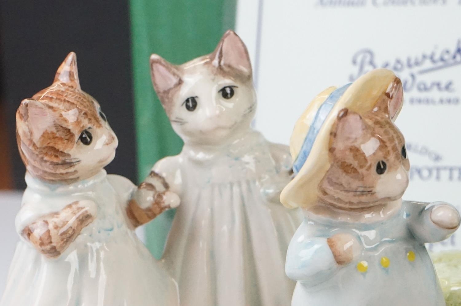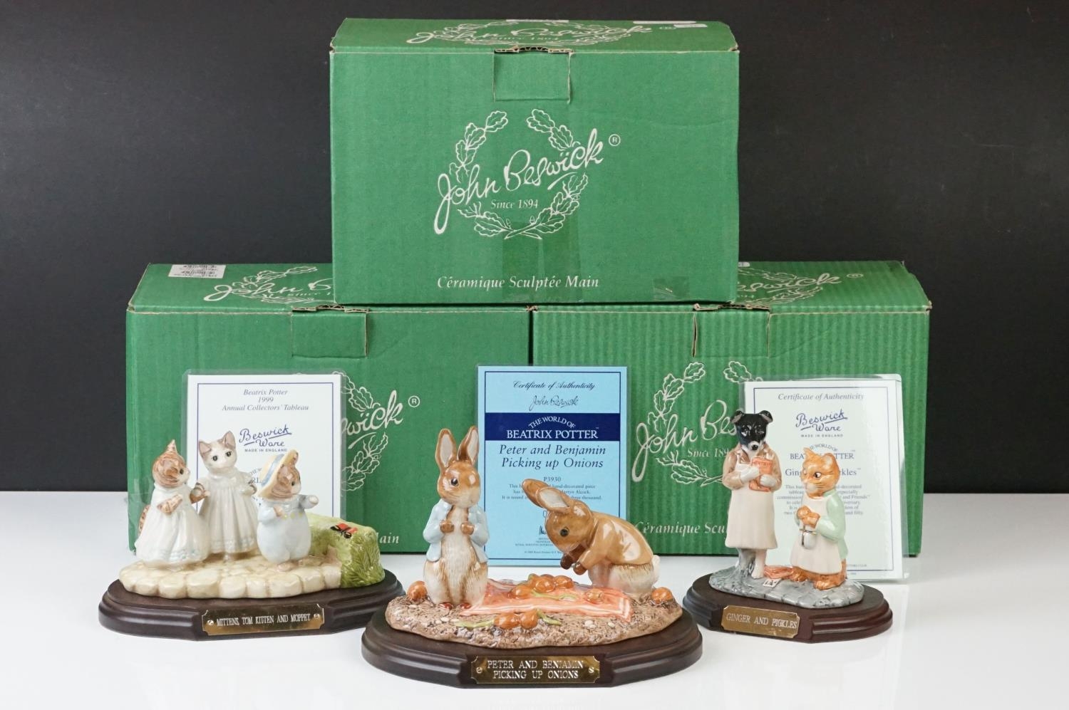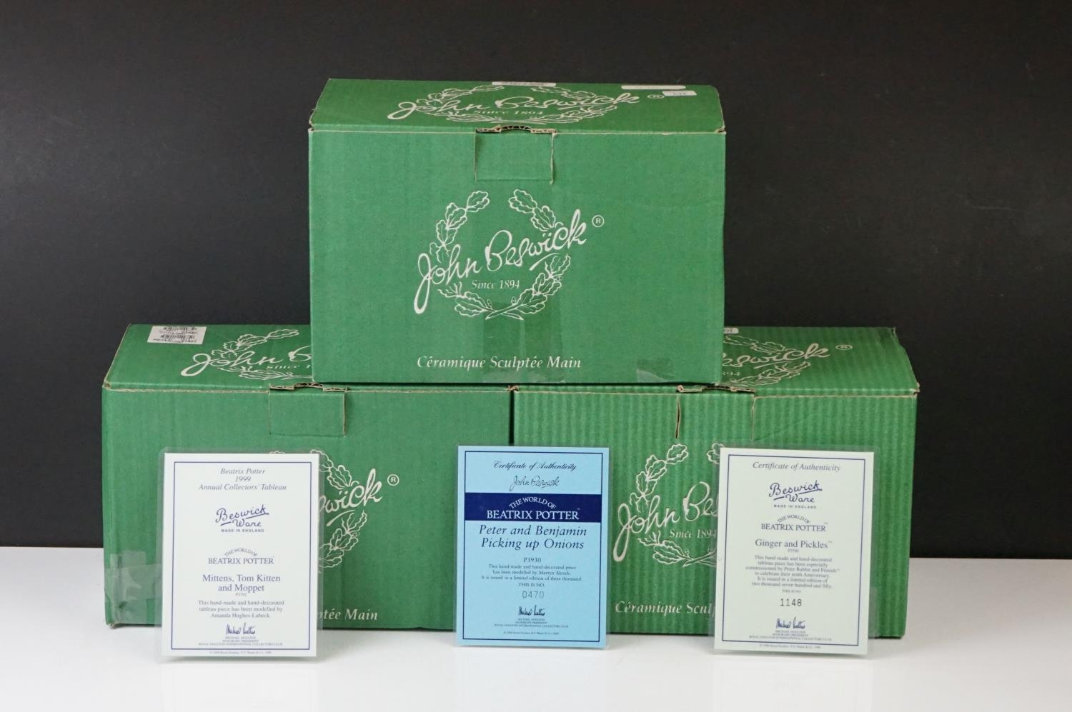 Three ' The World of Beatrix Potter ' Figures including Beswick ware Beatrix Potter 1999 Annual Collectors' Tableau ' Mittens, Tom Kitten and Moppet ', Beswick ware ' Ginger and Pickles ' plus John Beswick ' Peter and Benjamin picking up onions ', all with certificates and all boxed