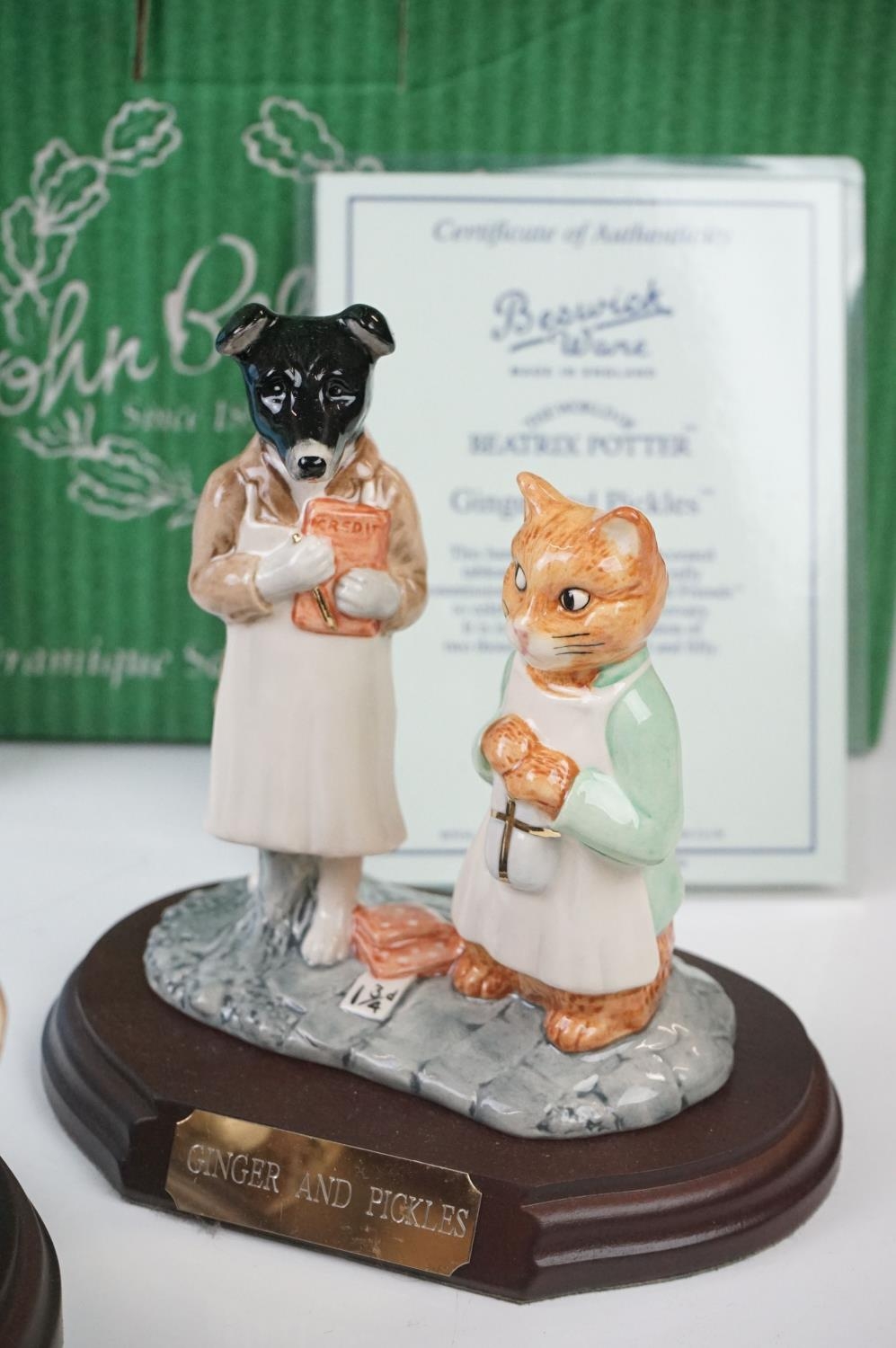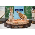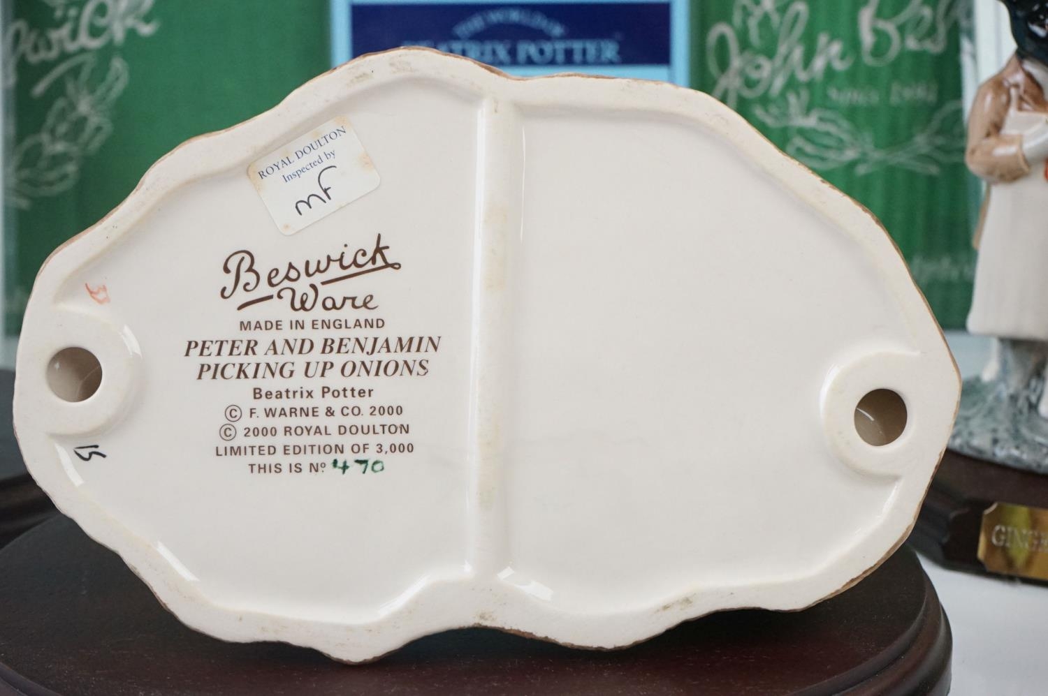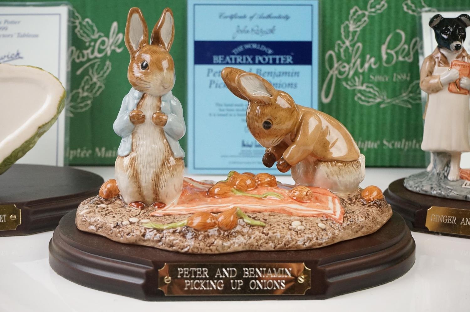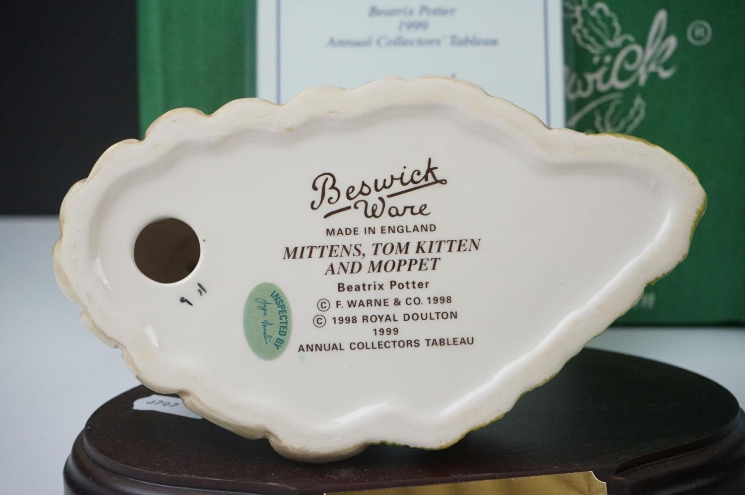 Three ' The World of Beatrix Potter ' Figures including Beswick ware Beatrix Potter 1999 Annual Collectors' Tableau ' Mittens, Tom Kitten and Moppet ', Beswick ware ' Ginger and Pickles ' plus John Beswick ' Peter and Benjamin picking up onions ', all with certificates and all boxed