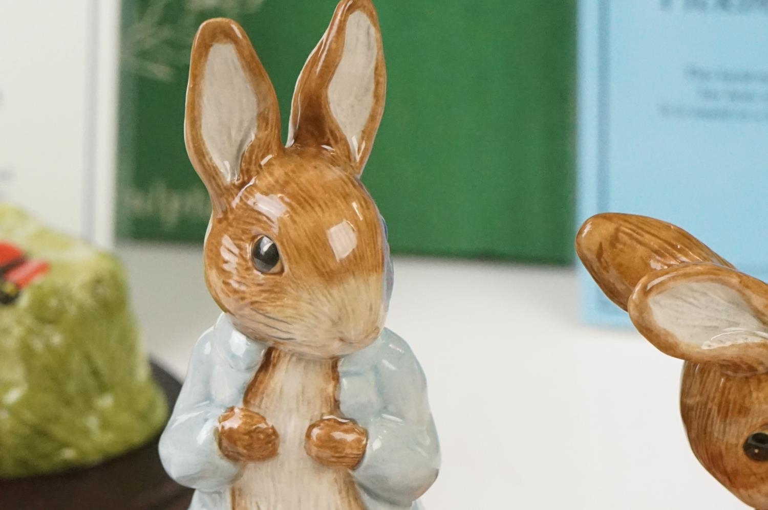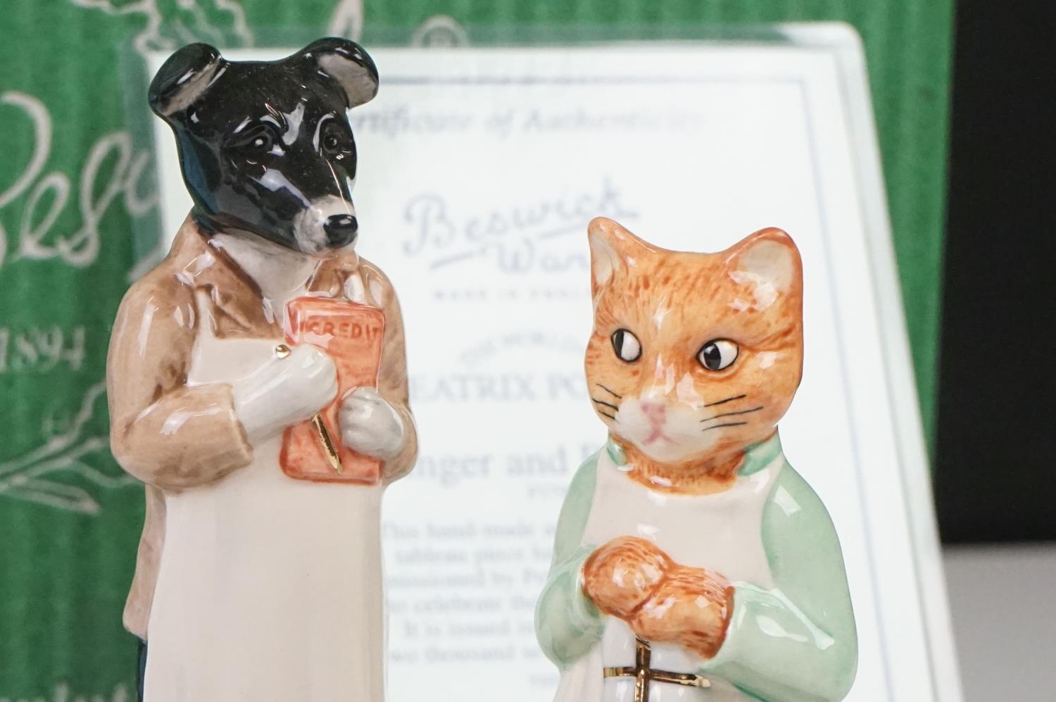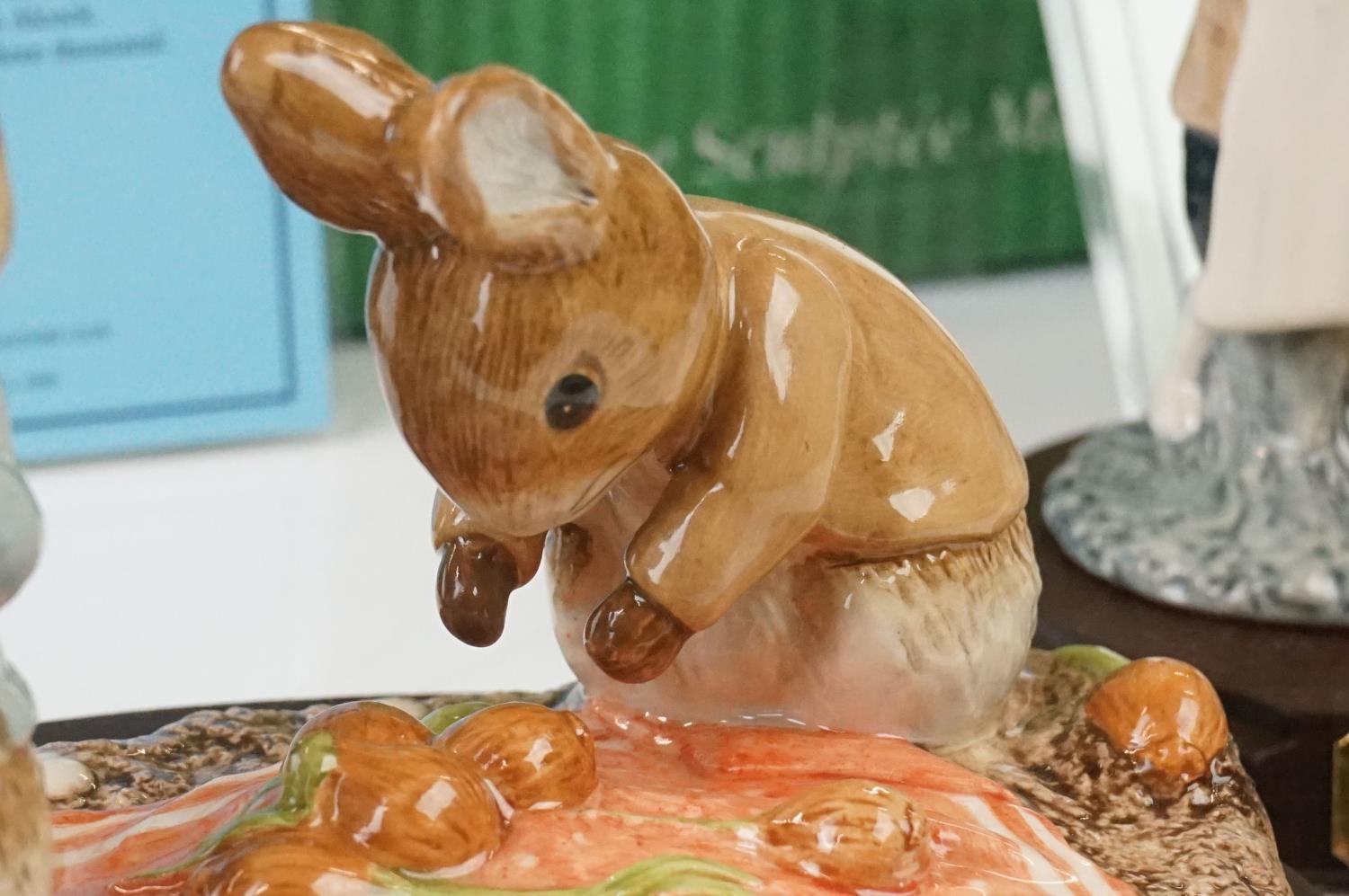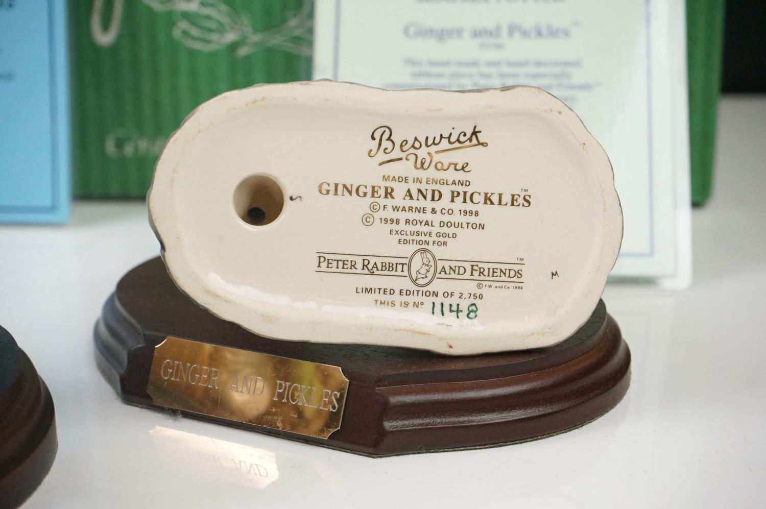 Three ' The World of Beatrix Potter ' Figures including Beswick ware Beatrix Potter 1999 Annual Collectors' Tableau ' Mittens, Tom Kitten and Moppet ', Beswick ware ' Ginger and Pickles ' plus John Beswick ' Peter and Benjamin picking up onions ', all with certificates and all boxed