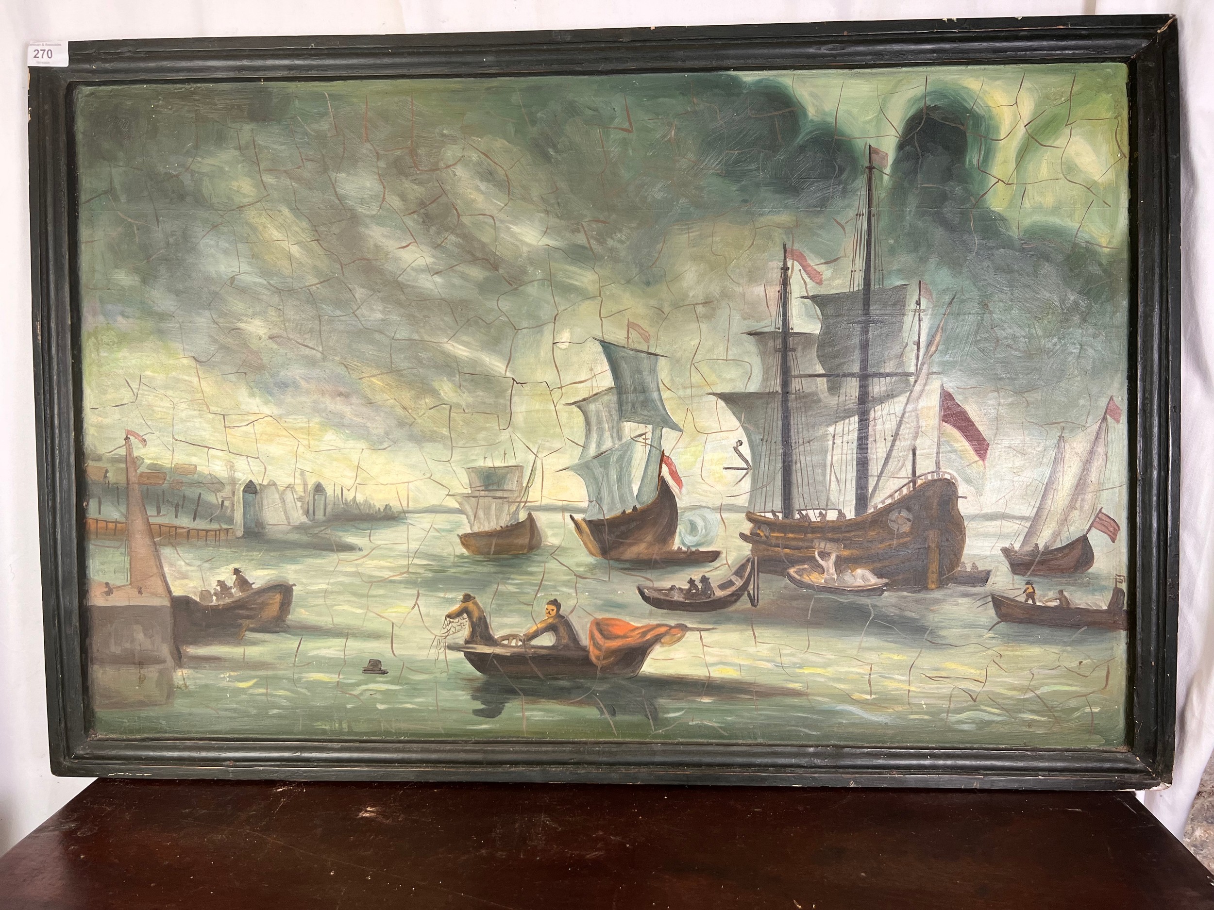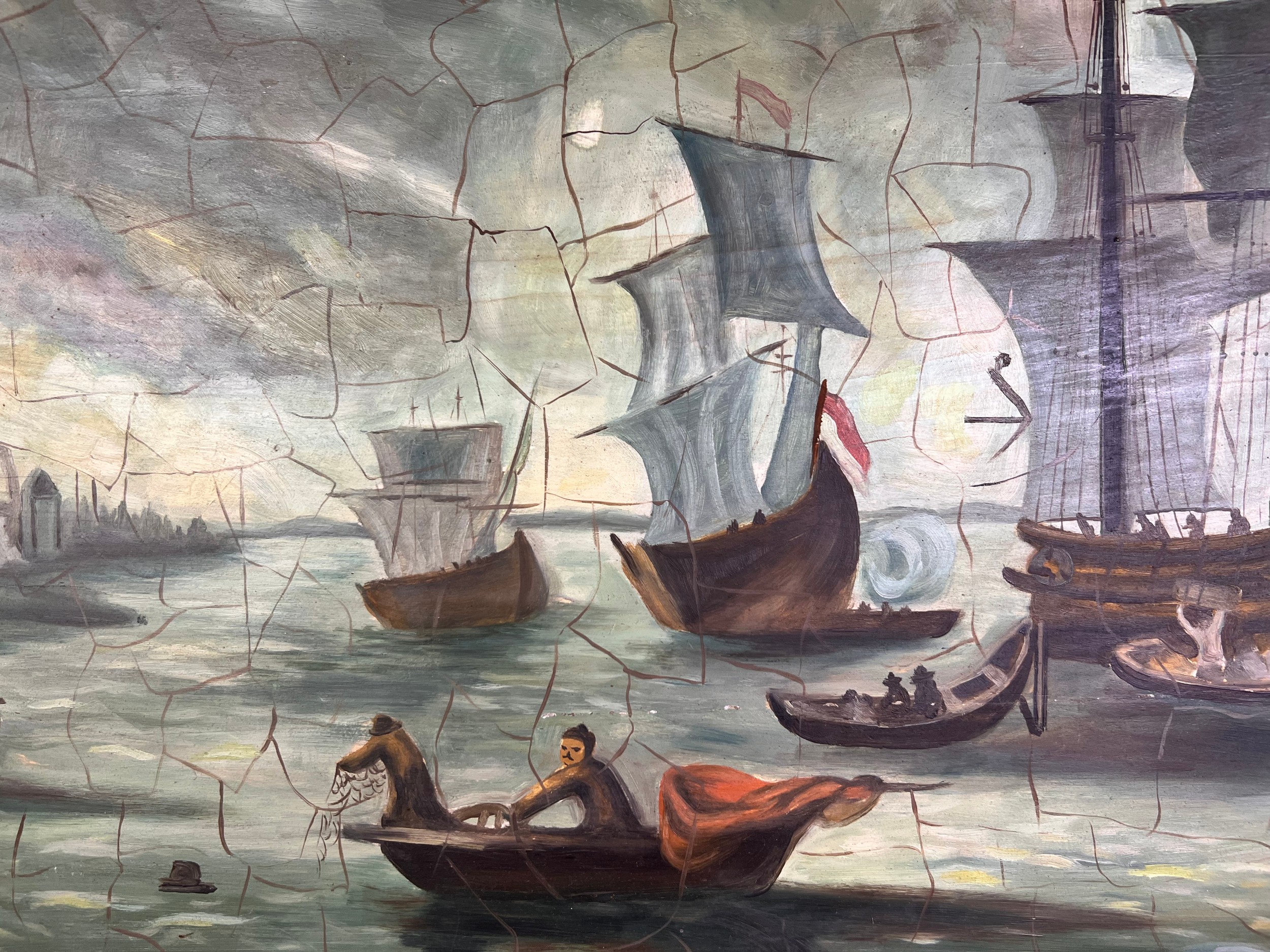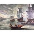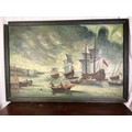 An antique watercolor painting on board of a stormy seascape with saling ships 24'' x 36''