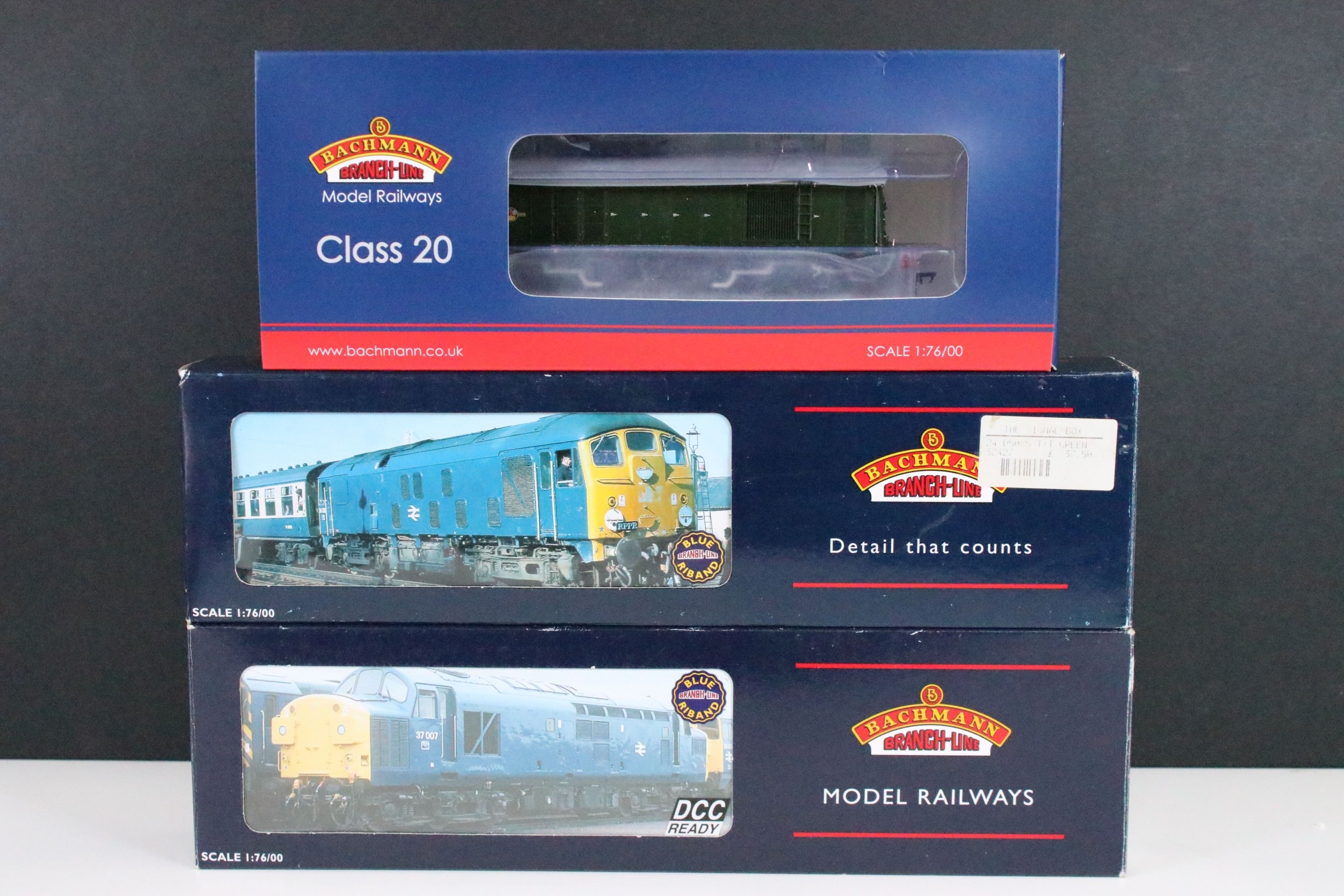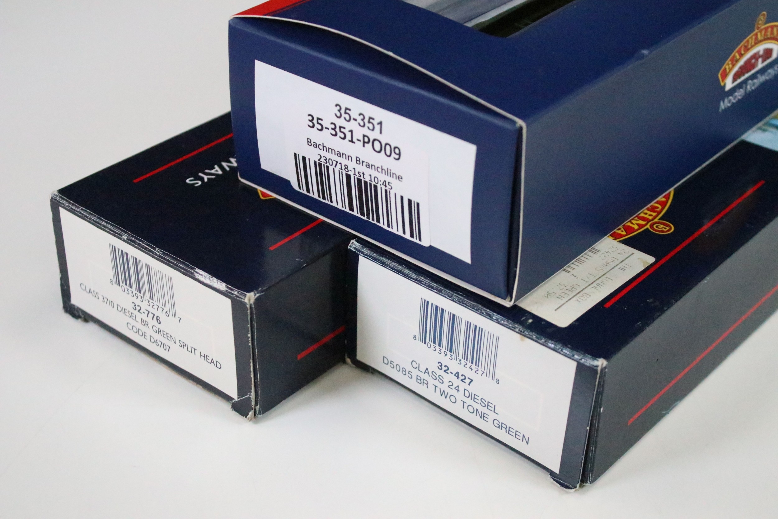 Three boxed Bachmann OO gauge locomotives to include 35-351-P009 Class 20, 32-776 Class 37/0 Diesel BR Green Split Head Code D6707 and 32-427 Class 24 Diesel D5085 BR Two Tone Green
